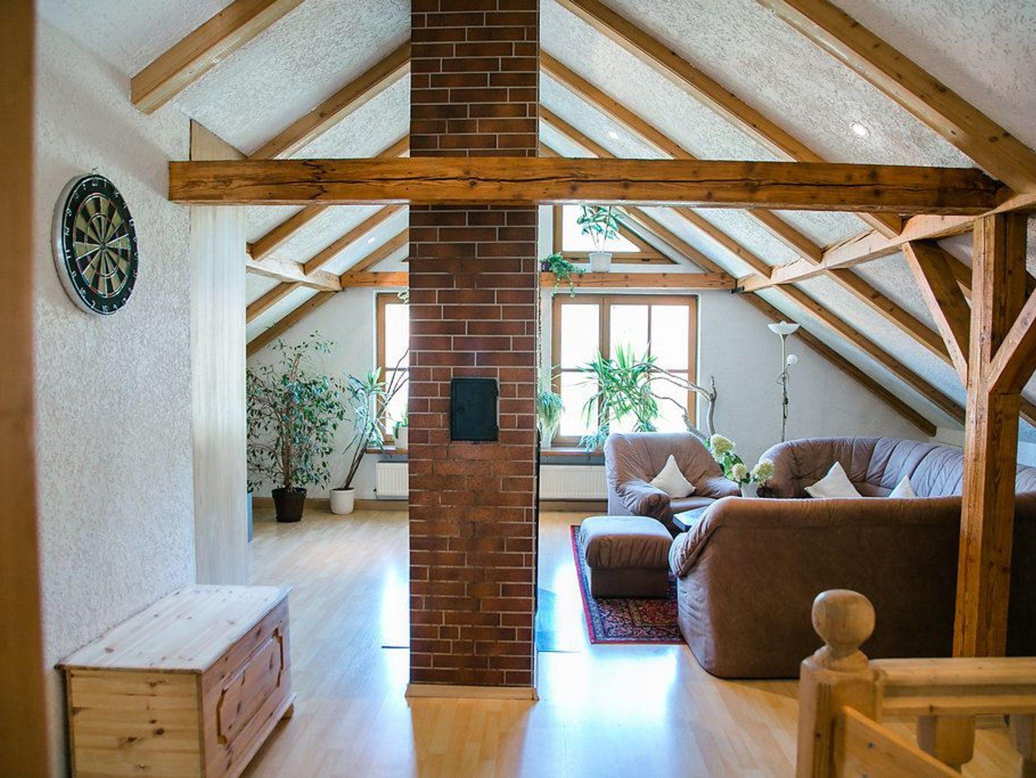 Im Dachgeschoß sind zwei Schlafzimmer, ein Bad und ein Wohnzimmer mit Holzofen. Das Bad besitzt eine Dusche und eine Toilette. Auf Anfrage können wir Ihnen gerne gegen Gebühr 4 weitere Zustellbetten sowie 3 Babybetten zur Verfügung stellen!