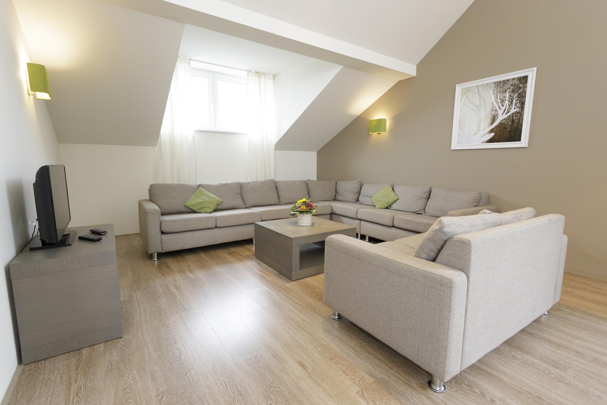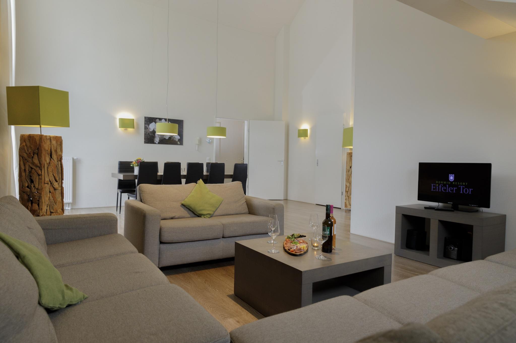 Elegantes Wellness-Refugium Dieses geräumige Penthouse im Eifeler Tor Resort bietet die perfekte Balance aus modernem Komfort und Entspannung. Genießen Sie gemütliche Abende im stilvollen Wohnbereich mit offener Küche für gemeinsame Mahlzeiten. Entspannen Sie sich in Ihrem privaten Wellnessbereich mit wohltuender Sauna und Whirlpool oder nutzen Sie die Gemeinschaftspools des Resorts (innen und außen). Familien mit Kindern kommen mit Spielgeräten und einem Hochstuhl voll auf ihre Kosten. Haustiere sind herzlich willkommen – ideal für Gäste, die gerne mit ihren vierbeinigen Freunden reisen. Natur und Kultur in der Nähe Umgeben von der Schönheit Nordrhein-Westfalens liegt das Penthouse nur wenige Schritte vom Nationalpark Eifel entfernt, einem Paradies zum Wandern, Radfahren und für hundefreundliche Wege entlang des malerischen Rursees. Besuchen Sie die mittelalterliche Burg Heimbach und tauchen Sie in die Geschichte ein oder erkunden Sie den Rurdamm mit seinen Panoramablicken. Tagesausflüge zu den charmanten Fachwerkhäusern von Monschau oder nach Aachen mit seinem UNESCO-Weltkulturerbe versprechen unvergessliche kulturelle Erlebnisse. Kulinarische Genüsse Die Region ist reich an kulinarischen Köstlichkeiten. In fußläufiger Entfernung können Gäste im Restaurant Heimbacher Brauhaus herzhafte deutsche Küche genießen oder im Haus am See mit regionalen Spezialitäten und atemberaubendem Seeblick speisen. Für ein gehobeneres Erlebnis bietet der Seehof Rursee gehobene Küche mit Blick aufs Wasser. Viele Lokale in der Umgebung sind haustierfreundlich und eignen sich perfekt für eine Mahlzeit nach einer Wanderung. Hinweis: Im Dormio Resort Eifeler Tor ist das Hallenbad von Montag, dem 17. November, bis Donnerstag, dem 20. November 2025, aufgrund der jährlichen Wartungsarbeiten geschlossen. Ab Freitag, dem 21. November, steht das Hallenbad wieder zur Verfügung. Die Kurtaxe beträgt 7 % des Mietpreises und ist im Park zu entrichten.