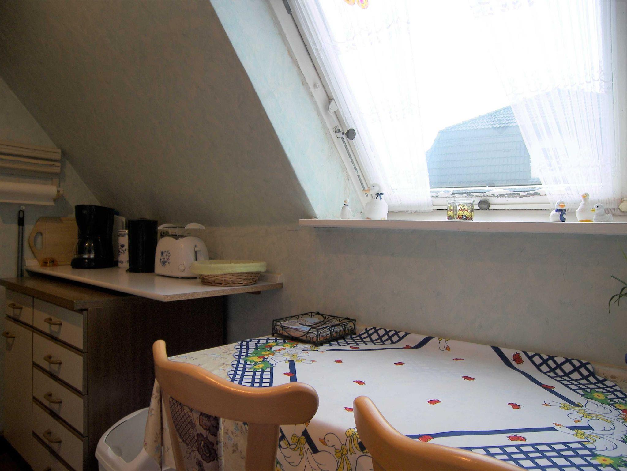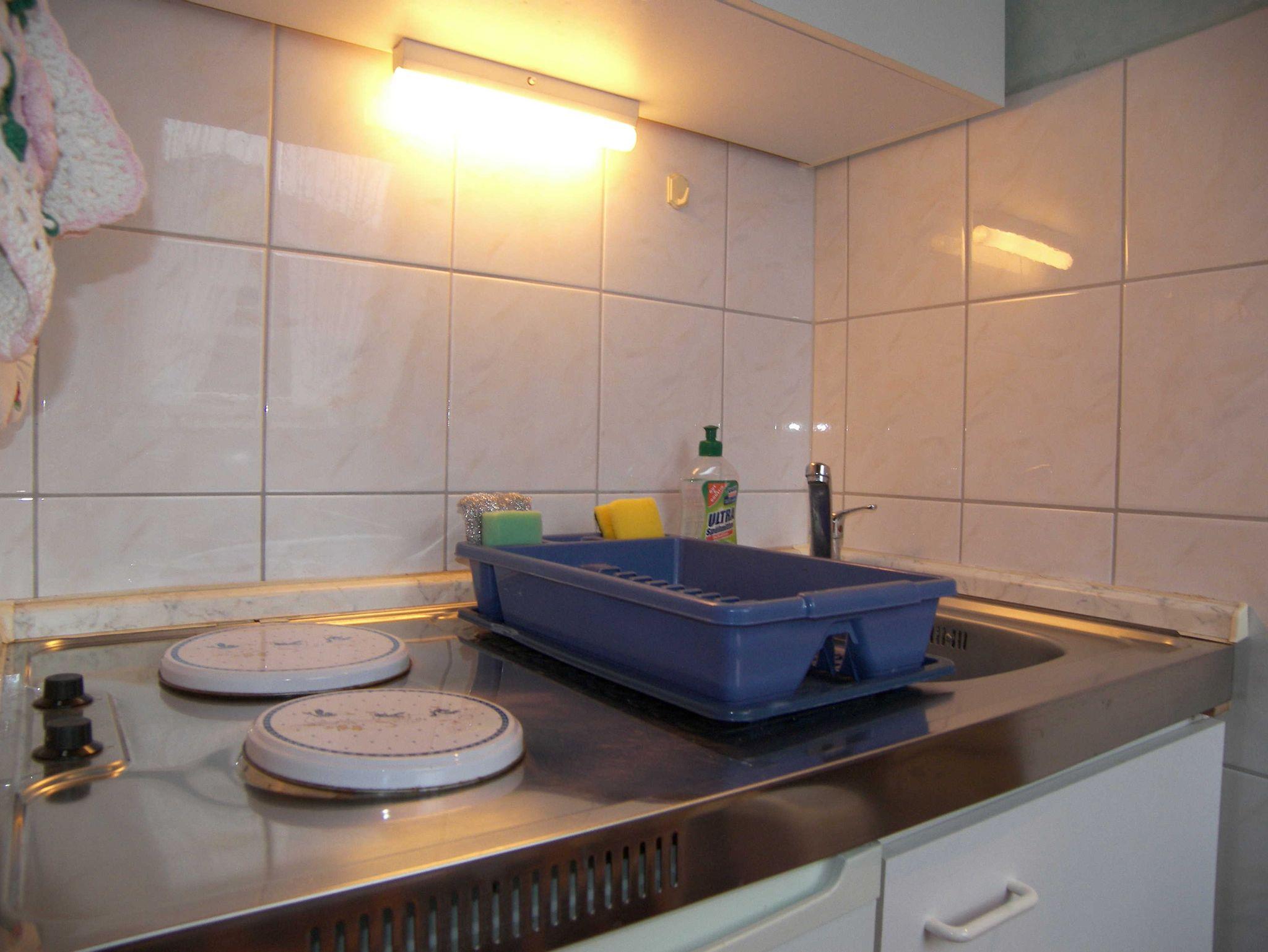 Die kleine Pantryküche, die sich hinter dem Schlafzimmer befindet, ist mit einem Kühlschrank mit Gefriermöglichkeit, einem 2-Platten-Herd, Wasserkocher, Toaster und Kaffeemaschine ausgestattet. Zusätzlich kann eine Mikrowelle zur Verfügung gestellt werden, die aus Platzgründen auf Anfrage in die Wohnung gestellt wird.