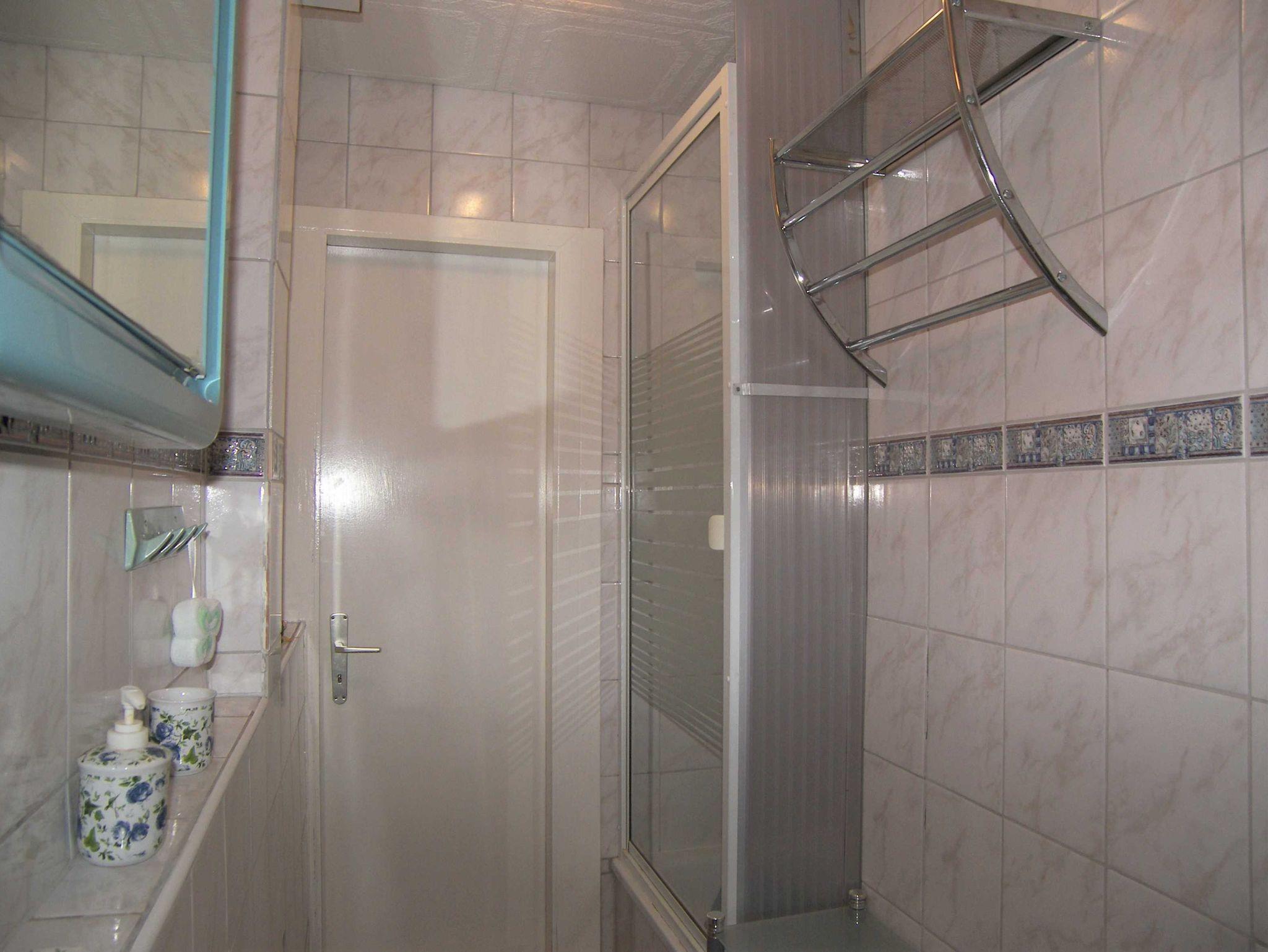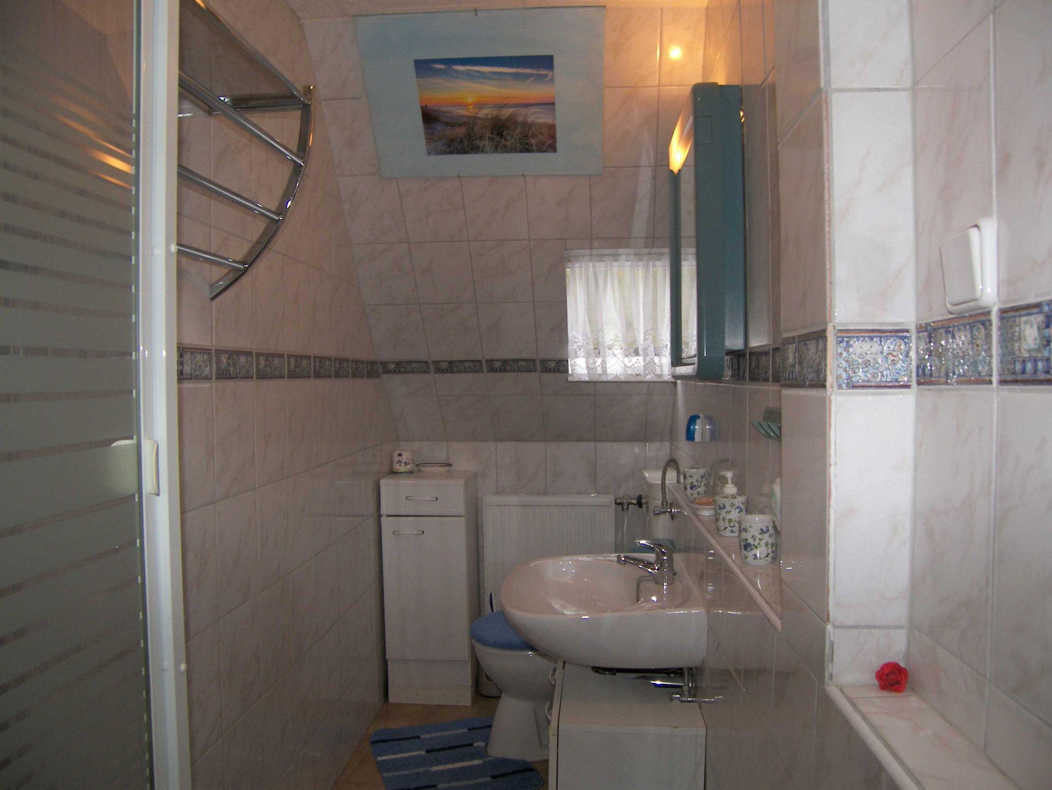 Das Badezimmer ist mit einer Dusche ausgestattet.