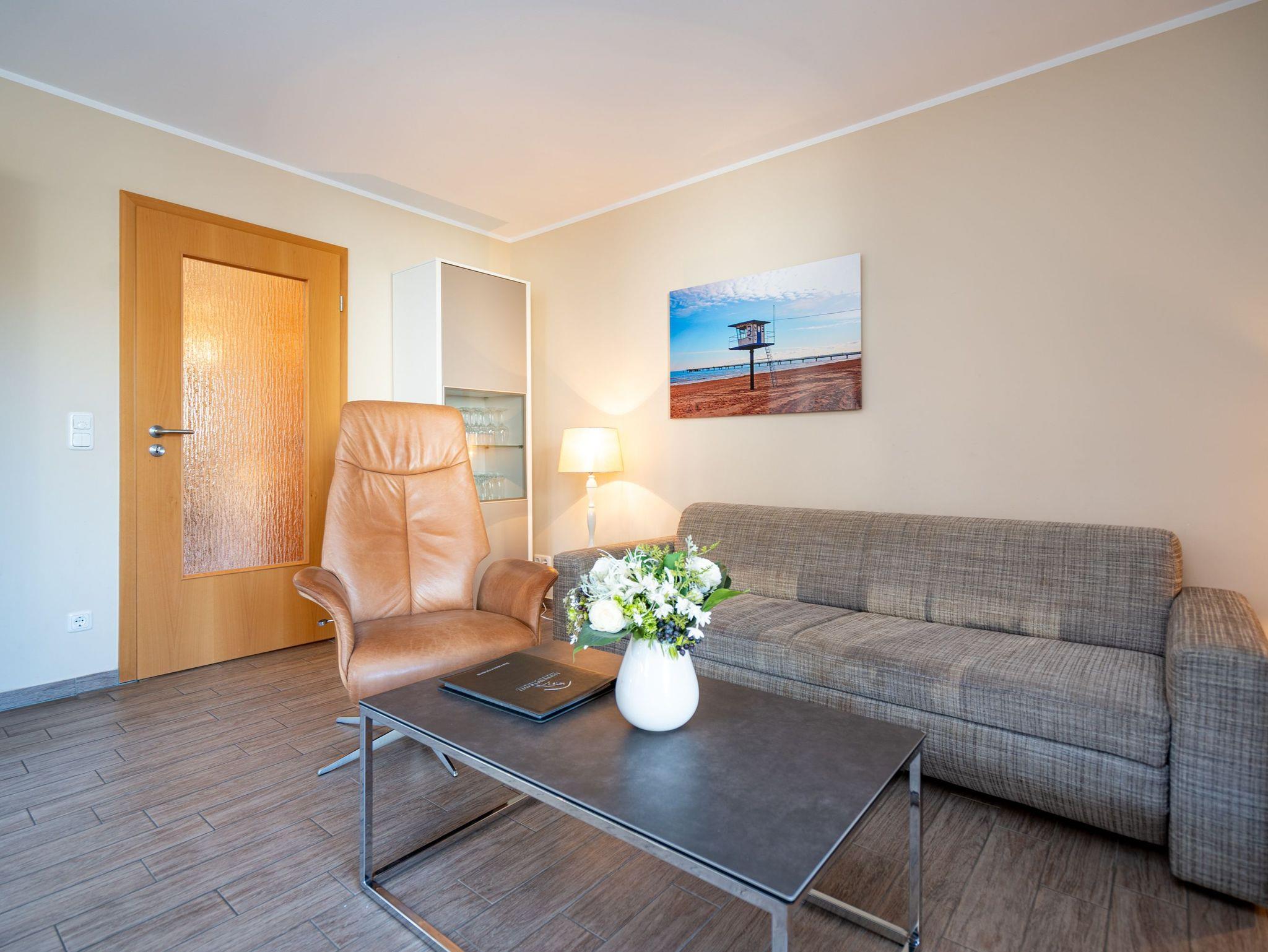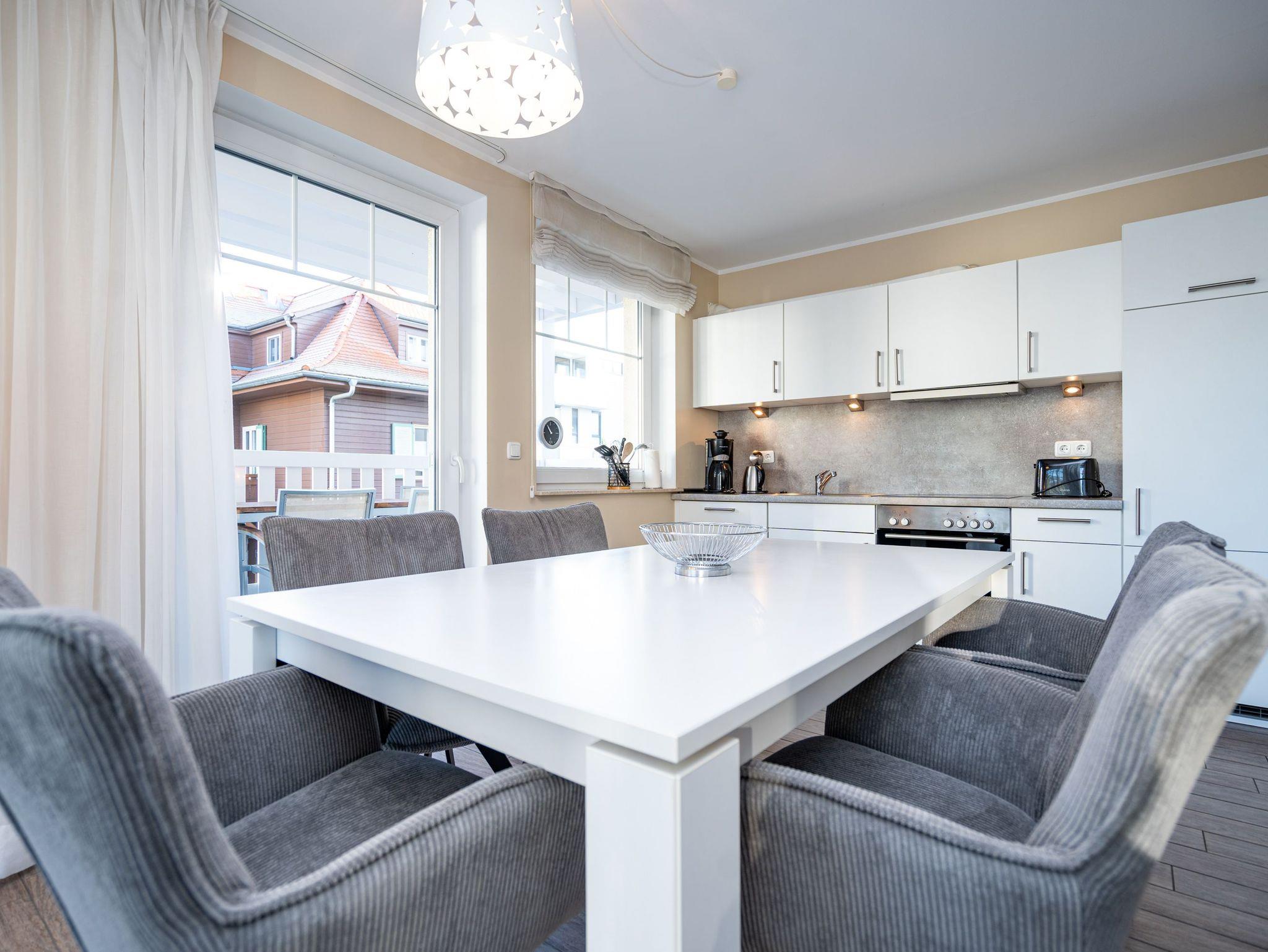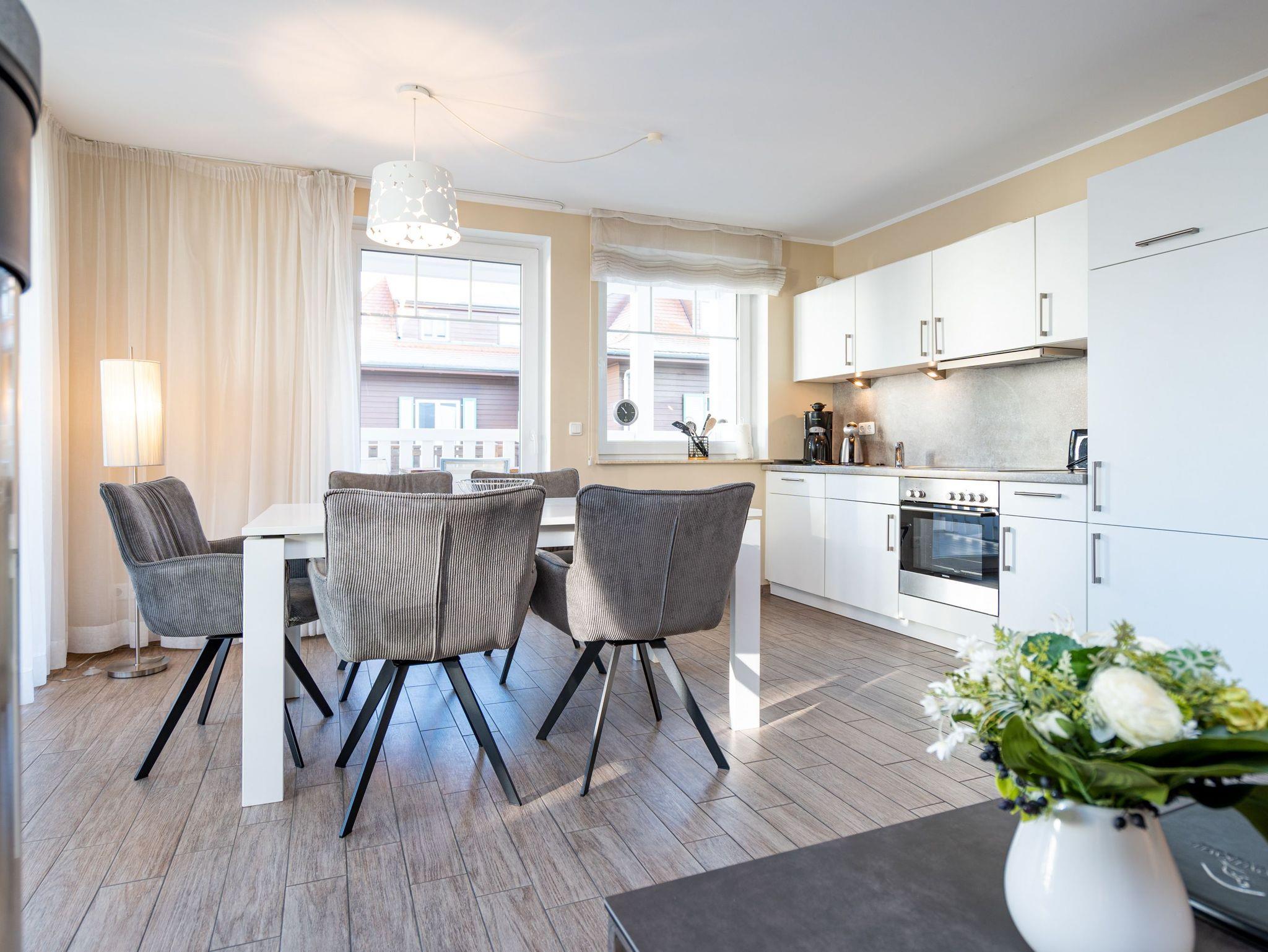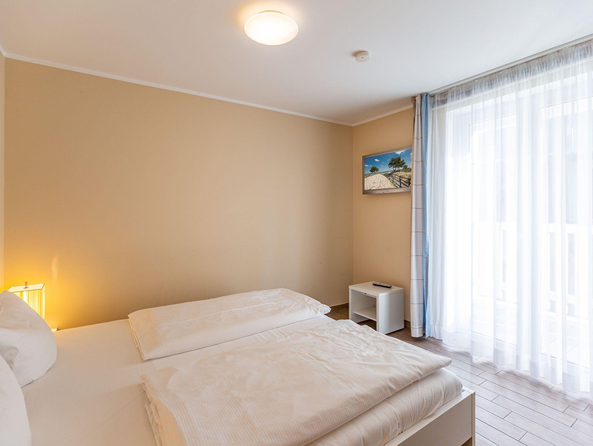 Idyllisch, von viel Grün umgeben und nur einen Steinwurf vom Strand und der Ostsee entfernt, wartet das 61 Quadratmeter große Appartement 06 im ersten Obergeschoss nur darauf, Ihnen den Urlaub mit seiner hellen und freundlichen Atmosphäre zu verschönern und dafür zu sorgen, dass Sie inmitten einer Wohlfühlumgebung neue Energie tanken können. Die Wohnung bietet mit ihren zwei Schlafzimmern Platz für 4 Personen und ein Kleinkind bis 3 Jahre (im Kinderreisebett; eine zusätzliche Matratze [&] Bettzeug müssen mitgebracht werden). Gleich auf drei Balkonen können Sie die frische Ostseeluft spüren und einatmen, sich gemütlich in die Sonne setzen und dem Meeresrauschen lauschen. Das große Wohn-Esszimmer eignet sich bestens zum Runterkommen, Entspannen, Kochen und Genießen. Von der bequemen Couch aus oder dem gemütlichen Sessel haben Sie Blick auf den echten Kaminofen und einen Flat-TV. Die zum Wohnzimmer hin offene Küchenzeile ist mit hochwertigen Geräten und feinem Porzellan ausgestattet. Der Esstisch mit den bequemen Stühlen lädt zum Zusammenkommen und Verweilen ein. Auf Wunsch kann ein Kinderhochstuhl (gegen Aufpreis) bereitgestellt werden. Beide Schlafzimmer sind hell und gemütlich mit jeweils einem großen Doppelbett eingerichtet. Warme Beige- und Brauntöne bringen Sie in eine entspannte Stimmung. Die Schränke bieten viel Ablagefläche. Das geräumige Bad verfügt über eine Dusche, WC und eine Waschmaschine. Außerdem gibt es in der Wohnung noch ein zusätzliches Gäste-WC. Ein Tag am Meer: Lockt das Wetter ans Wasser steht als besonderes Bonbon am Strand kostenfrei ein Strandkorb für Sie zur Verfügung. Genießen Sie Ihre Tage in diesem schönen Dünendomizil von der ersten Minute an. Handtücher liegen für Sie bereit und die Betten sind bei Anreise bezogen. Der WLAN-Anschluss ist kostenfrei nutzbar.