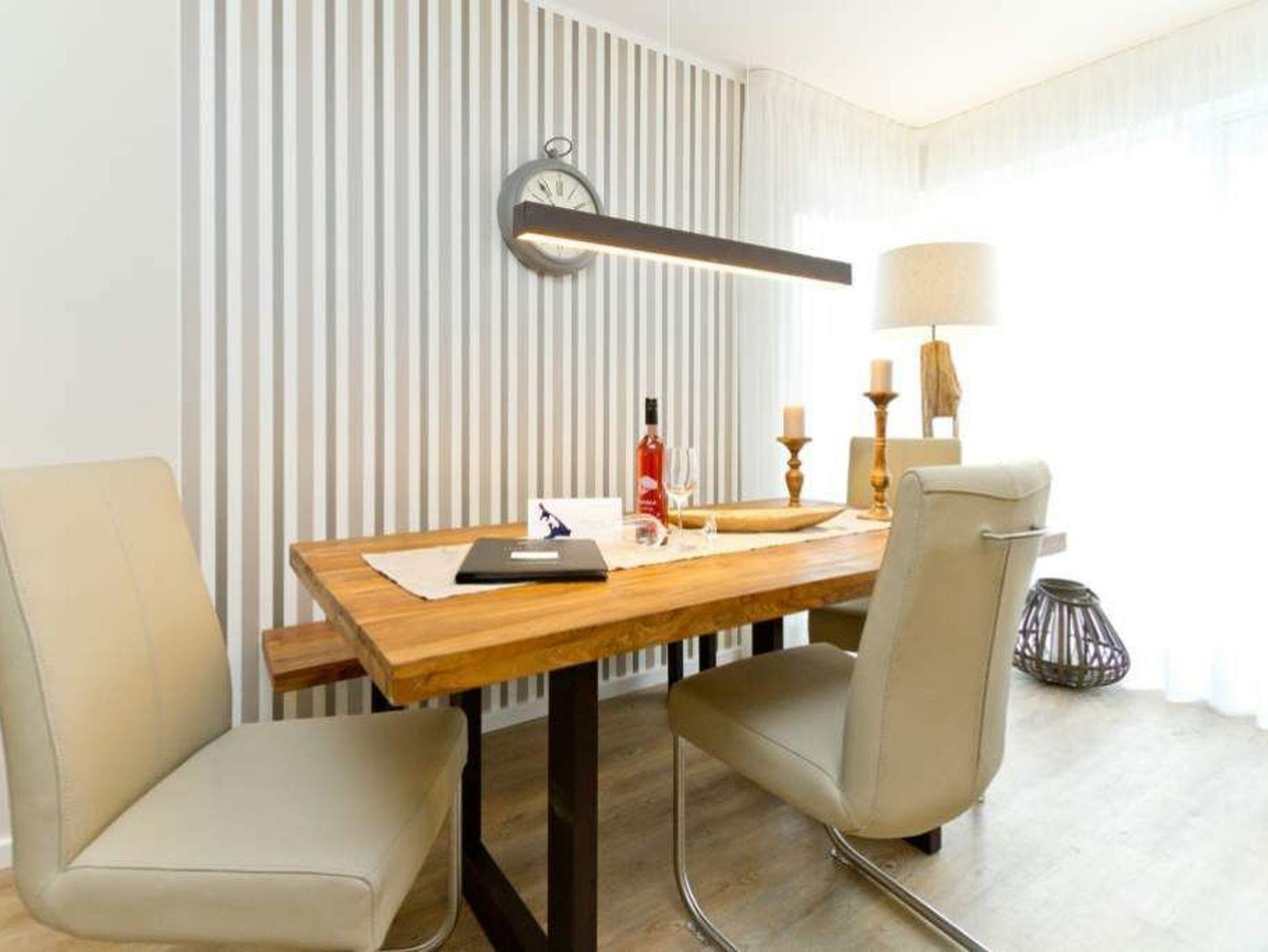 Im ersten Obergeschoss der neuen Villa Limora erwartet Sie eine wunderschön gestaltete 3-Raum-Ferienwohnung (65 qm) für bis zu 4 Personen (inkl. Kleinkind). Harmonisch abgestimmte Farben und Stoffe und hochwertige Möblierung gepaart mit stilvollen Details lassen hier die Arbeit der Innenarchitektin erkennen. Der Wohnbereich mit bequemer Sitzgruppe, Flat-TV und Kaminofen schließt sich an die komplett ausgestattete Küchenzeile mit Essplatz an. Zwei Schlafzimmer mit Boxspringbetten (1.SZ: Doppelbett 1,80x 2,00m/ 2. SZ: zwei Einzelbetten je 0,9x2,00m, hier passt auch ein Babyreisebett) und jeweils Flat-TV sorgen für erholsame Nächte. Das schöne Bad mit Glasdusche und WC wird durch ein zusätzliches Gäste-WC ergänzt. Auch der schöne, großzügige Süd- Balkon mit Gartenmöbel lädt zum Relaxen ein. In der Tiefgarage (Stellplatz 3) steht ein Pkw-Stellplatz zur Verfügung. Das WLAN- Netz in der Wohnung ist kostenfrei nutzbar.