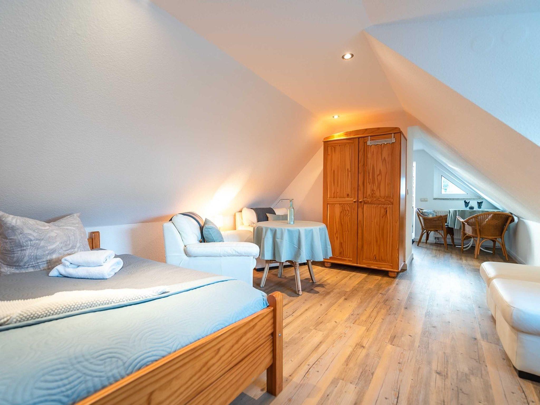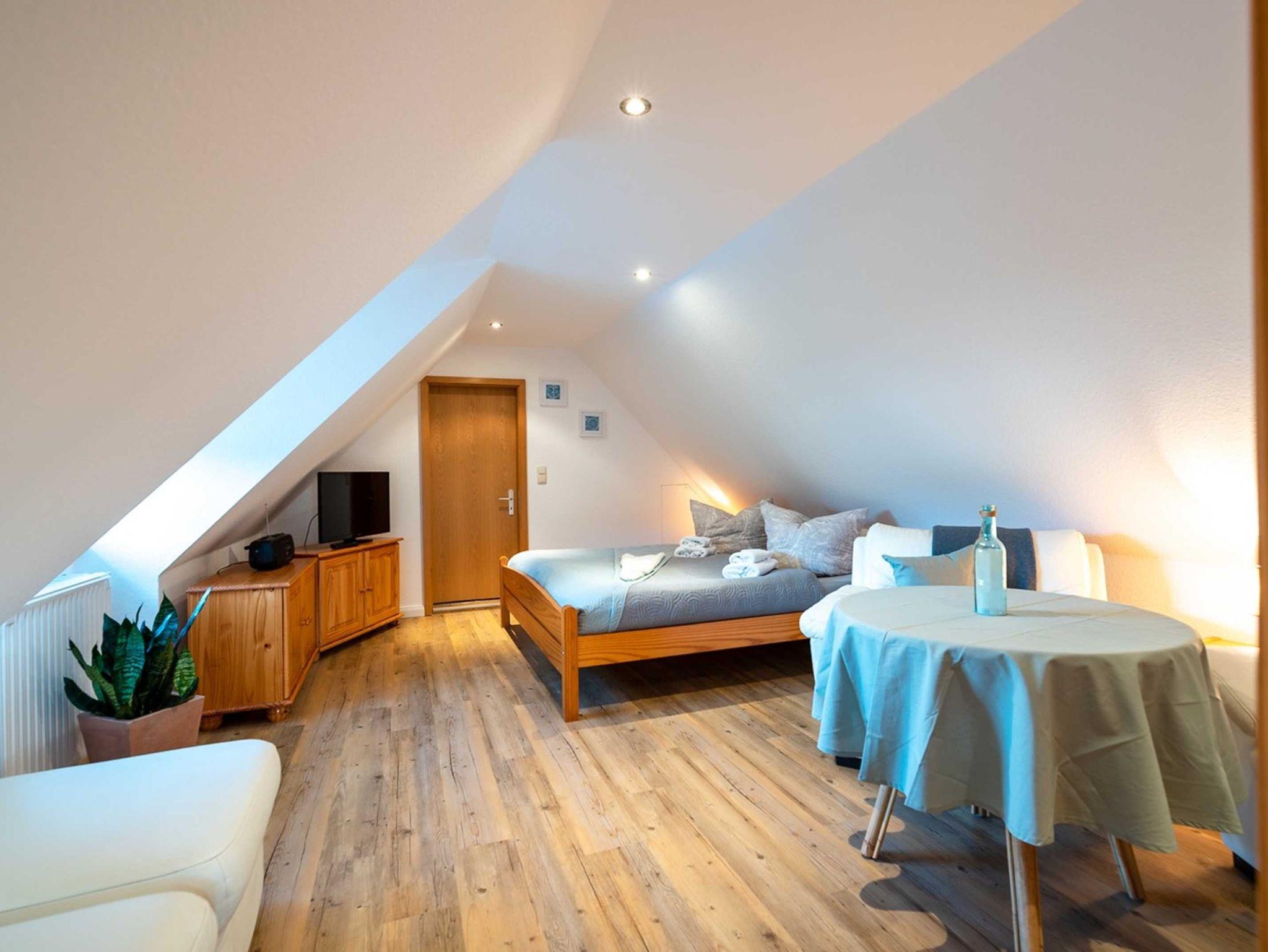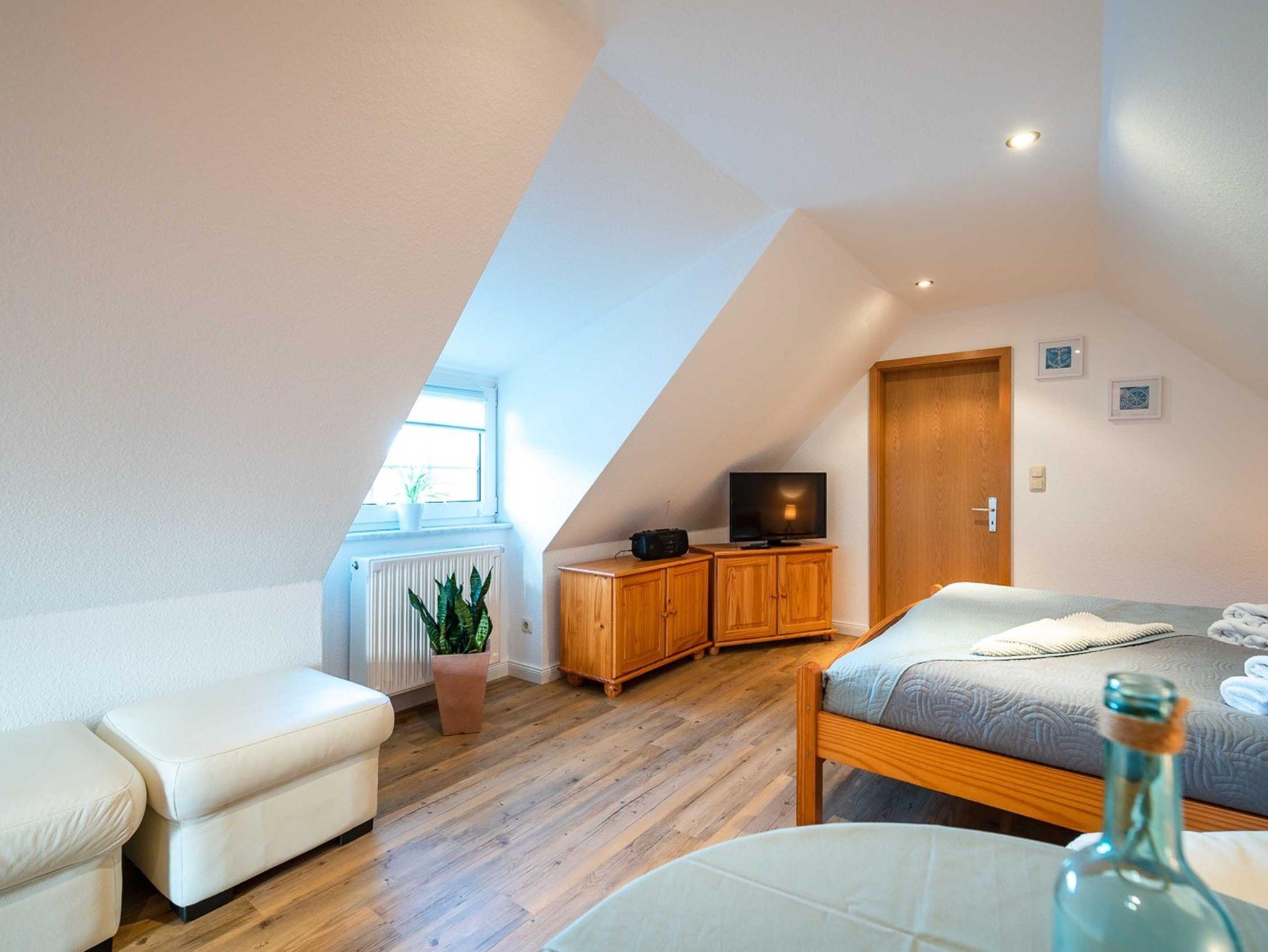 Die 28 qm große Ein-Raum-Ferienwohung befindet sich im ersten Oberschoss und verfügt über einen großen möblierten Balkon. Die Wohnung ist mit einer Pantry-Küche mit zwei Herdplatten, Mikrowelle und Kühlschrank und einem kleinen Essplatz sowie ein kombiniertes Wohn- und Schlafzimmer mit Doppelbett, gemütlicher Sitzecke, TV und Kleiderschrank ausgestattet. Bad mit Dusche und WC. Die Wohnung ist für drei Personen (maximal zwei Erwachsene und ein kleines Kind) geeignet. Ein Kinderreisebett kann auf Wunsch zur Verfügung gestellt werden.