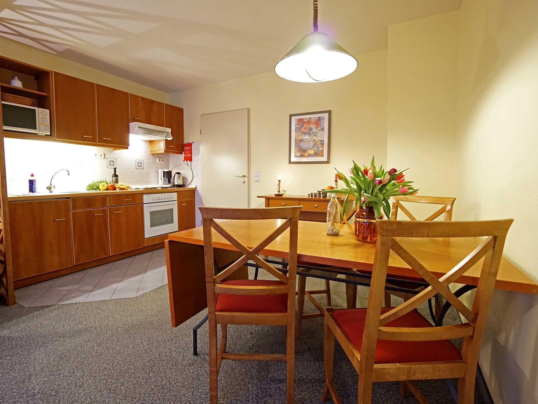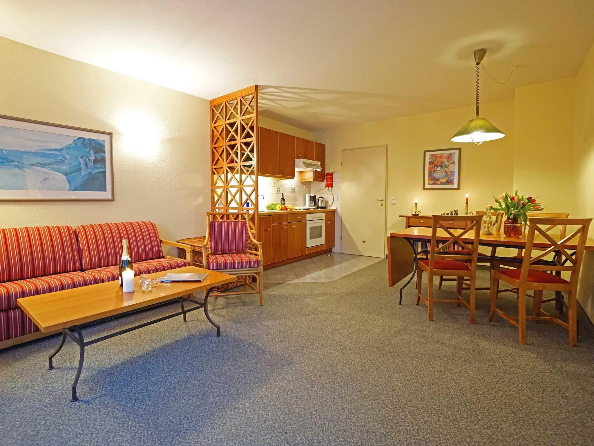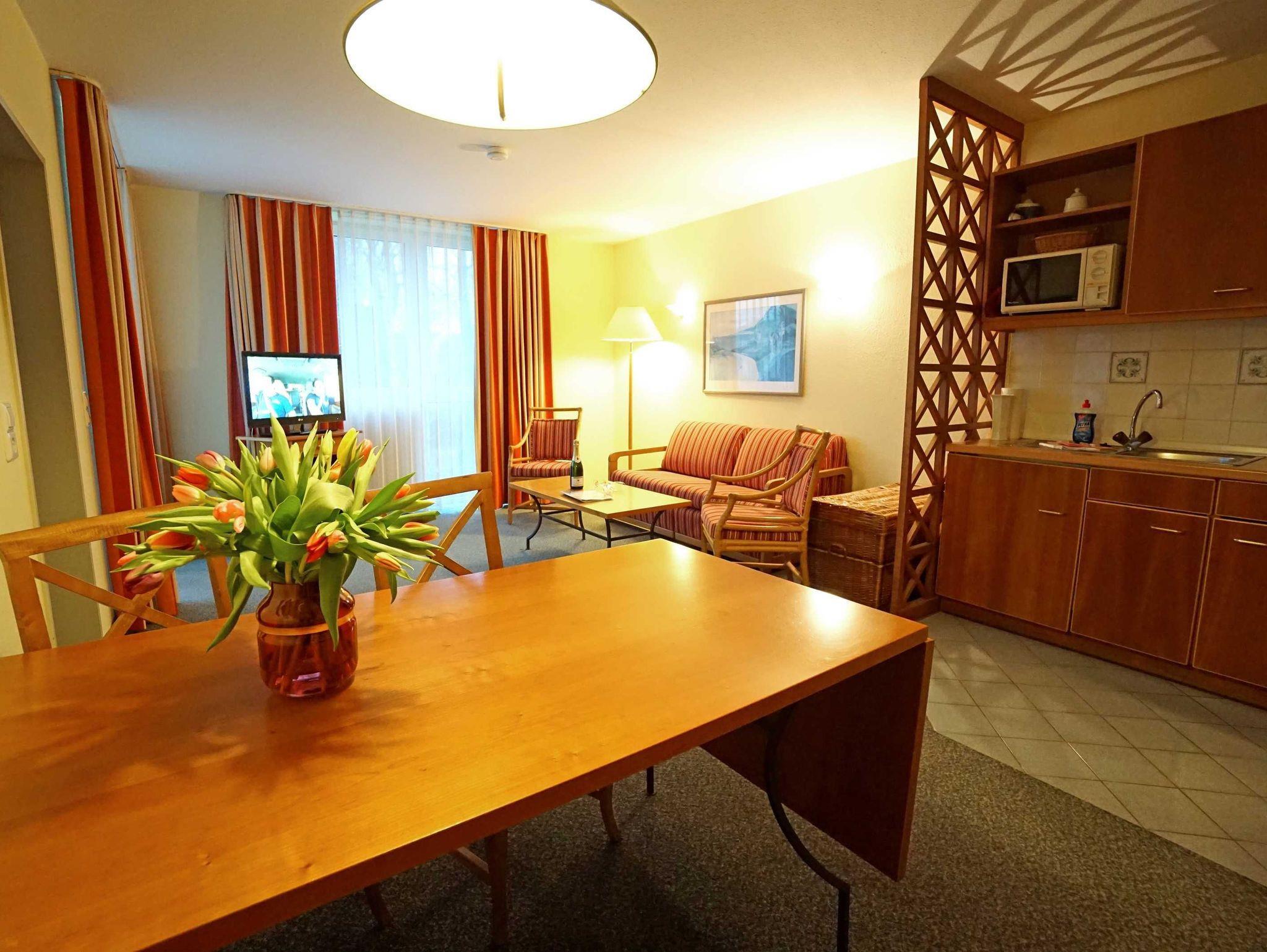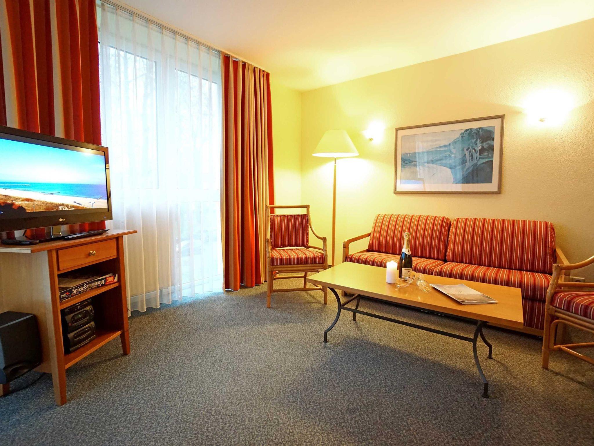 Freundliche, helle Zweizimmer Ferienwohnung (45qm) für 2 - 4 Personen mit Südwestbalkon, direkt an der Promenade in gepflegtem Park mit altem Baumbestand gelegen. Die Wohnung hat neben dem Wohn- und Essbereich eine offene Küche mit Mikrowelle, Herd und Backofen. Das Schlafzimmer verfügt über ein Doppelbett, die Doppelschlafcouch im Wohnbereich ist für die 3. und 4. Person.