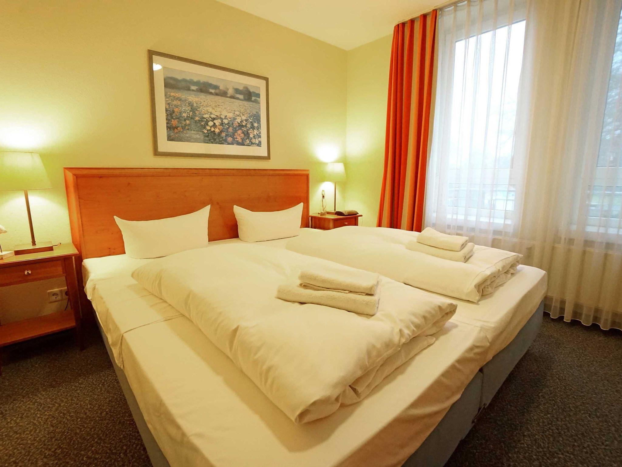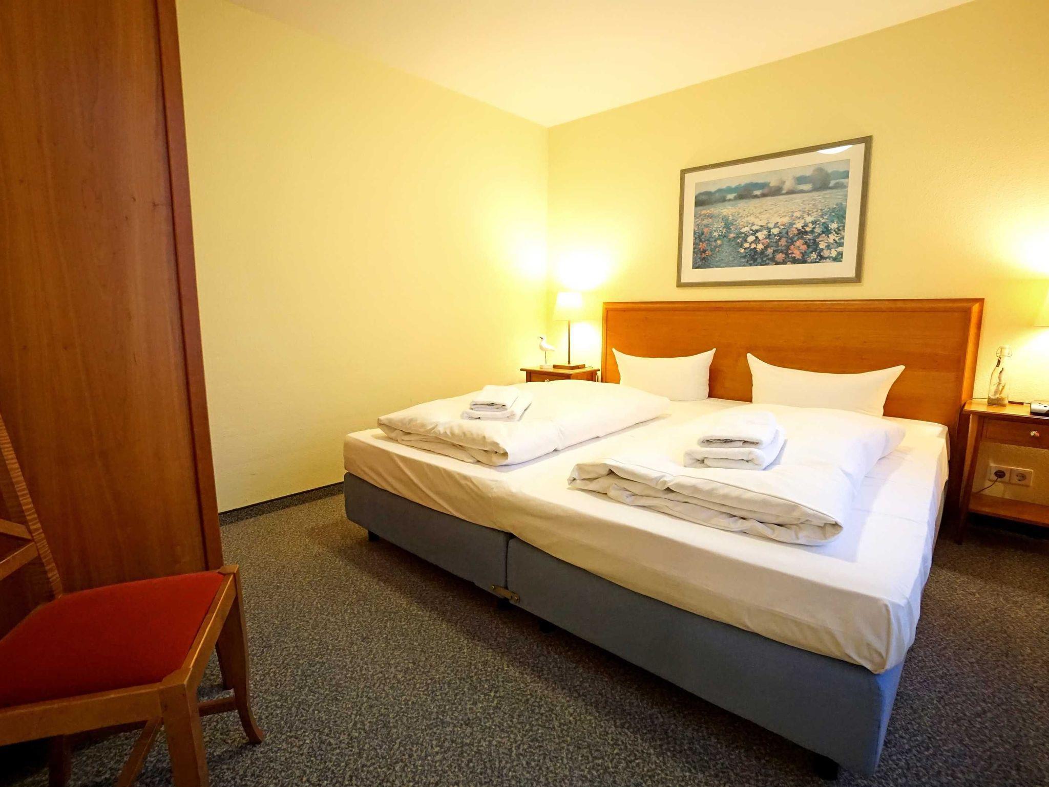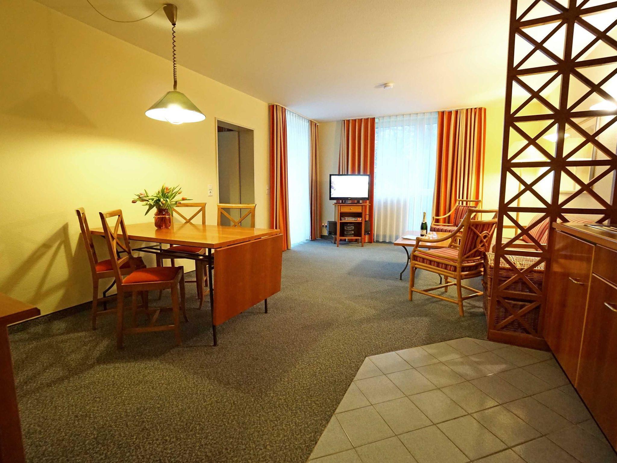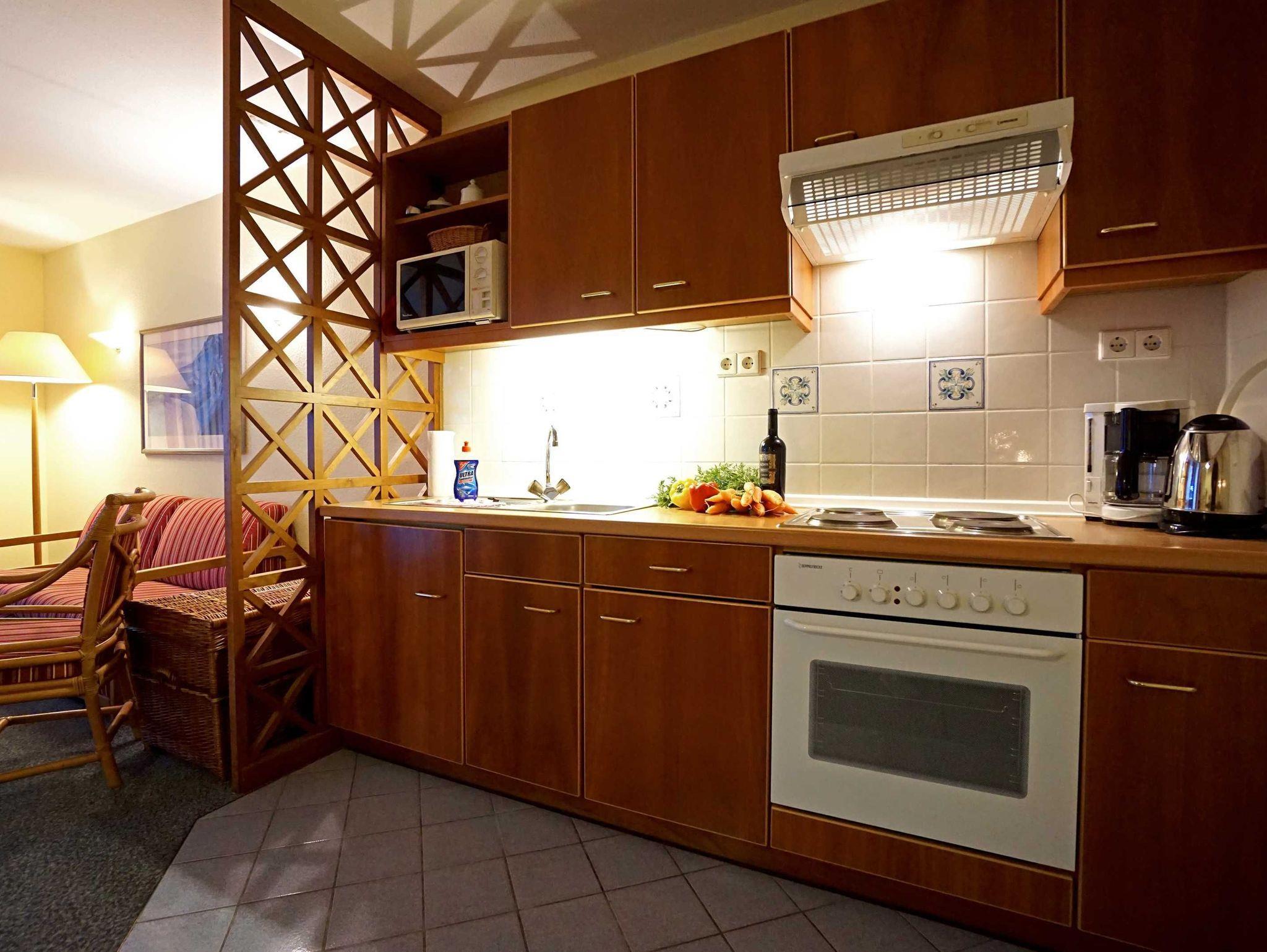 Freundliche, helle Zweizimmer Ferienwohnung (45qm) für 2 - 4 Personen mit Südwestbalkon, direkt an der Promenade in gepflegtem Park mit altem Baumbestand gelegen. Die Wohnung hat neben dem Wohn- und Essbereich eine offene Küche mit Mikrowelle, Herd und Backofen. Das Schlafzimmer verfügt über ein Doppelbett, die Doppelschlafcouch im Wohnbereich ist für die 3. und 4. Person.