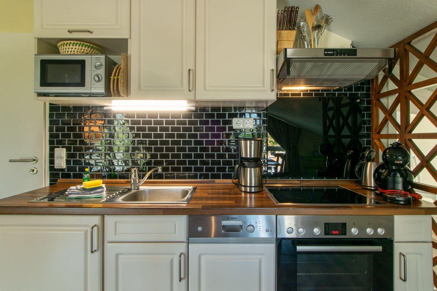 Das gemütliche Apartment bietet euch eine voll ausgestattete offene Küche mit Wasserkocher, Kaffeemaschine, Toaster, Ceranherd mit Backofen, Geschirrspüler, Mikrowelle und Kühlschrank mit Tiefkühlfach.