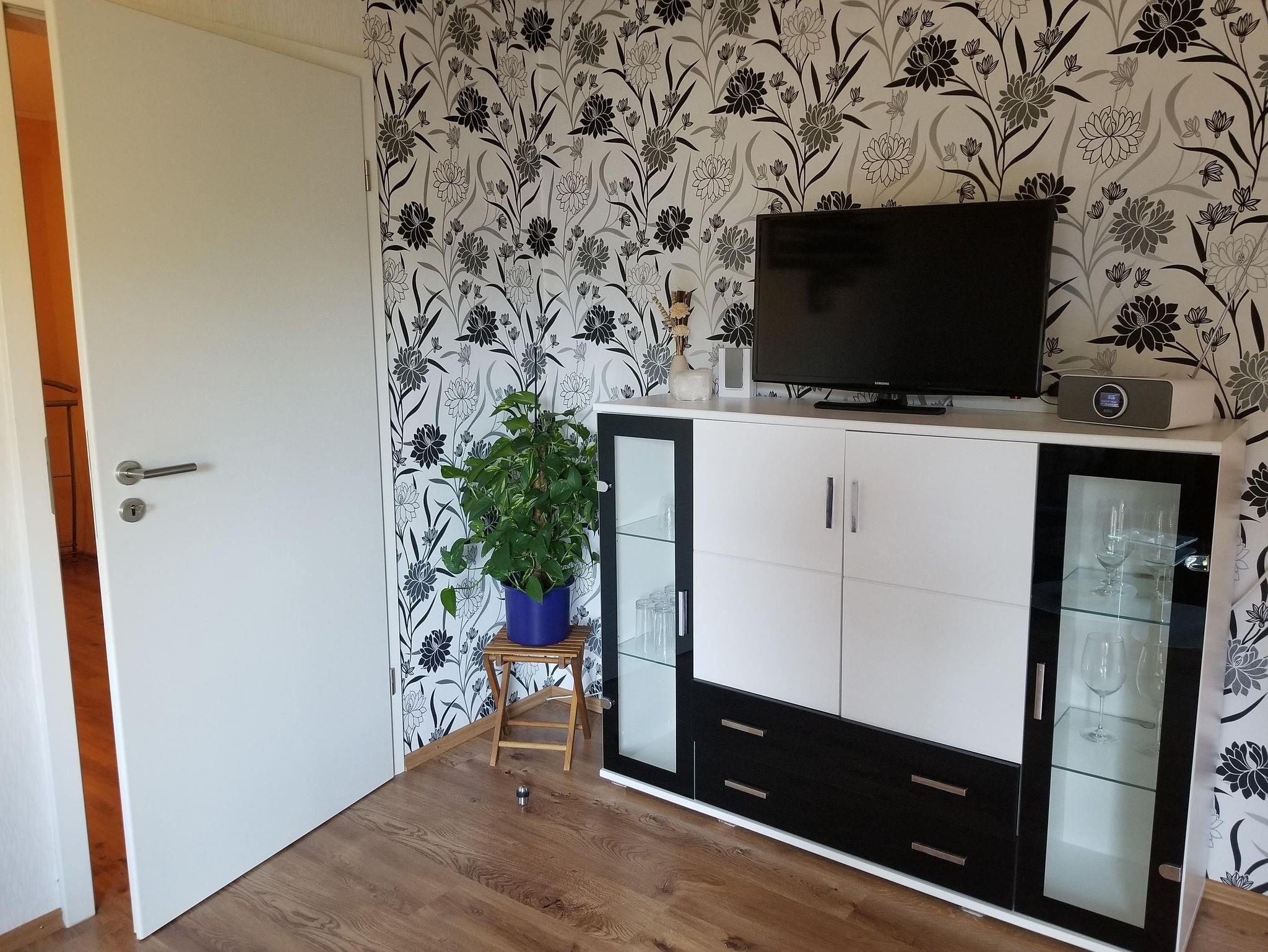 Einbauküche mit Geschirrspüler und Esstisch, großes Duschbad mit Waschmaschine und Wäscheständer, 1 Schlafzimmer mit Doppelbett - 2 Matratzen 90 x 200 - kein offenes Bettende, Wohnzimmer mit Schlafcouch. Gäste-Wc vorhanden, sowie geräumige Diele mit Garderobe und Schuhschrank. Kabelfernsehen, W-Lan, Spiele, Bücher und Puzzles für schlechtes Wetter vorhanden. Kostenloser Parkplatz direkt unten an der Straße gegenüber vom Haus.