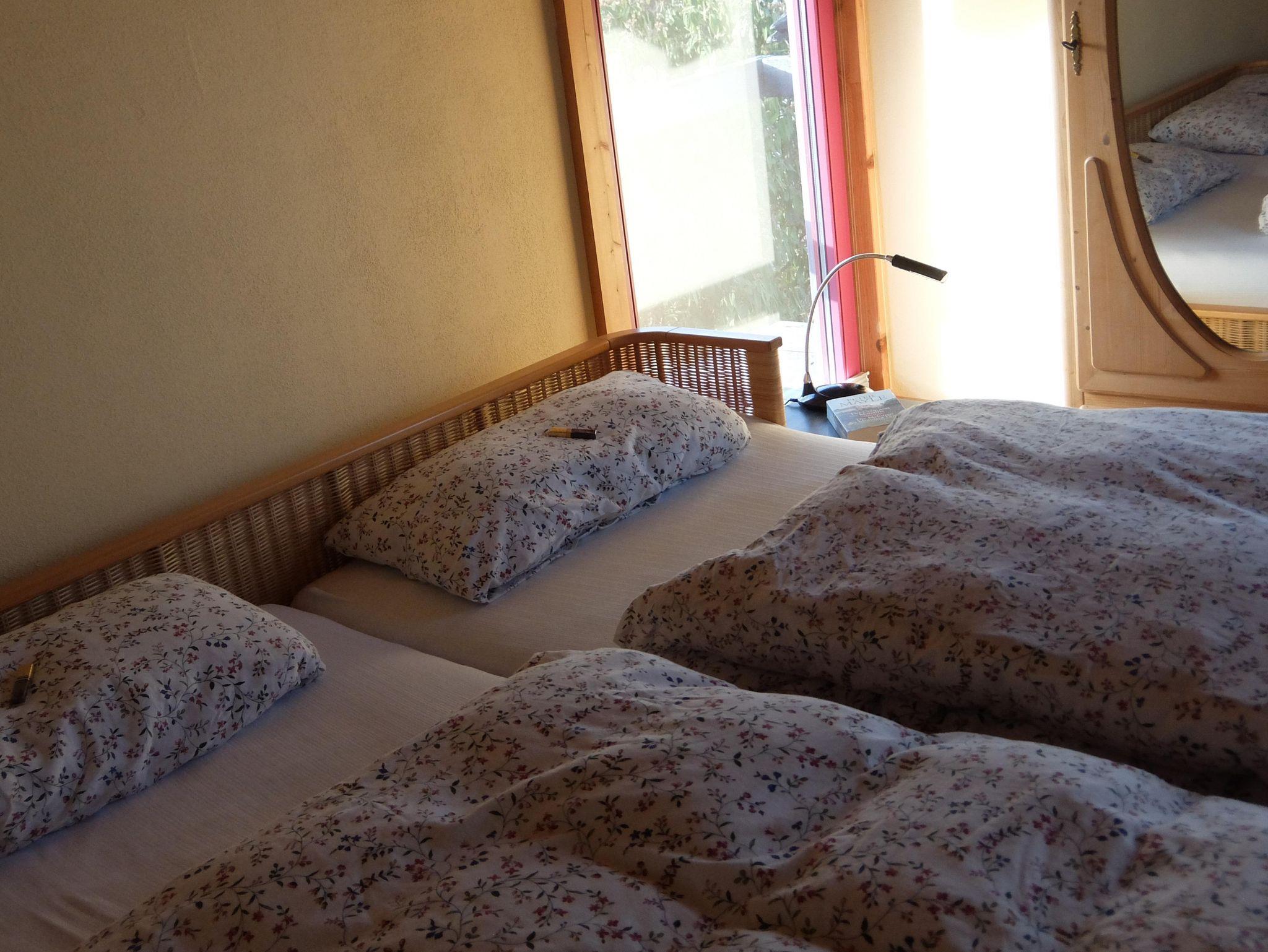 Unsere Ferienwohnung mit einer Gesamtfläche von 60 qm liegt im 1. Stock unseres Holzhauses und ist leider nur über eine Treppe, also nicht barrierefrei zu erreichen. Sie gliedert sich in Flur, Schlafzimmer, Wohnküche mit Spülmaschine, Panoramazimmer und Bad.