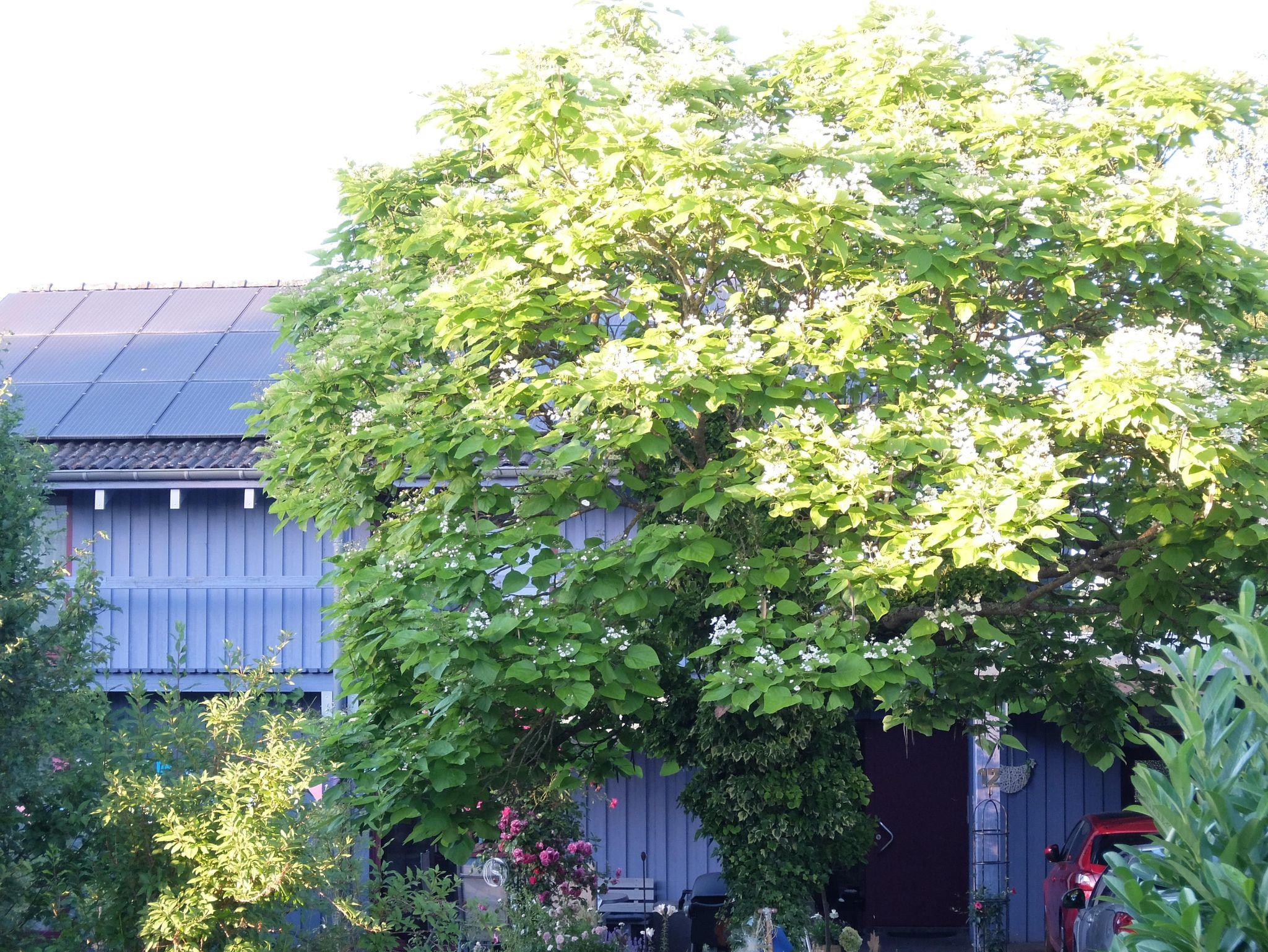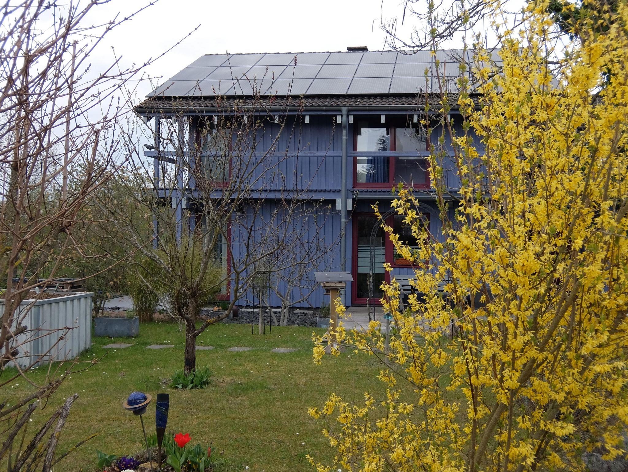 Unser Holzhaus bietet, bedingt durch hohe Räume und atmende Baumaterialien, ein angenehmes Wohnklima. Große Fensterflächen erlauben einen Blick in die umgebende Natur. Unsere Photovoltaikanlage ermöglicht uns, selbst produzierten Strom zu nutzen. Ein bepflanztes Flachdach und eine Zisterne speichern Regenwasser. Dank einer am Haus installierten Wallbox lässt sich ihr Elektrofahrzeug schnell aufladen. Auf dem Grundstück steht ein kostenloser Parkplatz zur Verfügung, Fahrräder können in einem abgeschlossenen Raum untergestellt werden. Unser großes, naturnah angelegtes Grundstück bietet Lebensraum für die heimische Tier– und Pflanzenwelt.