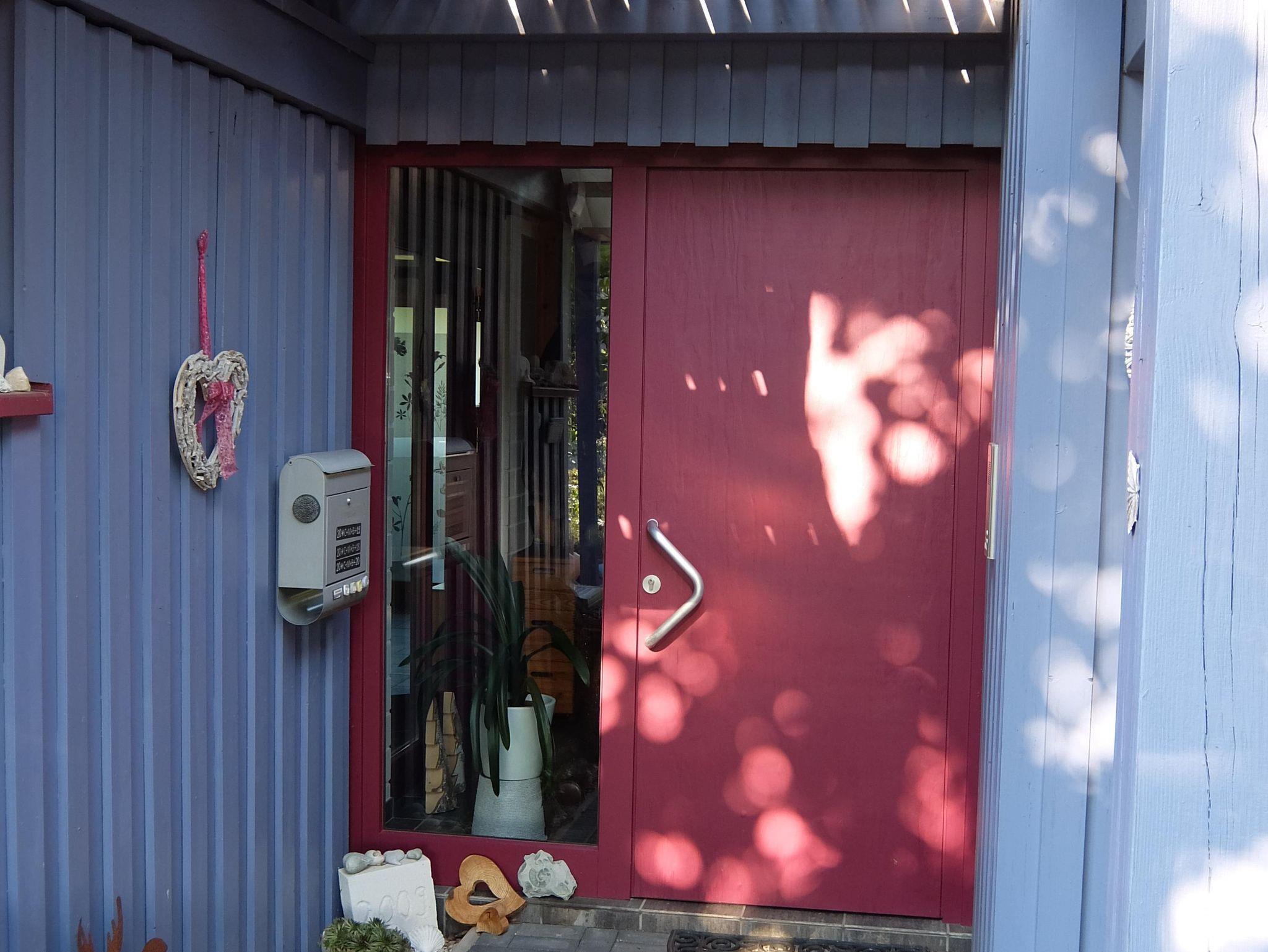 Große Fensterflächen erlauben einen Blick in die umgebende Natur. Unsere Photovoltaikanlage ermöglicht uns, selbst produzierten Strom zu nutzen.