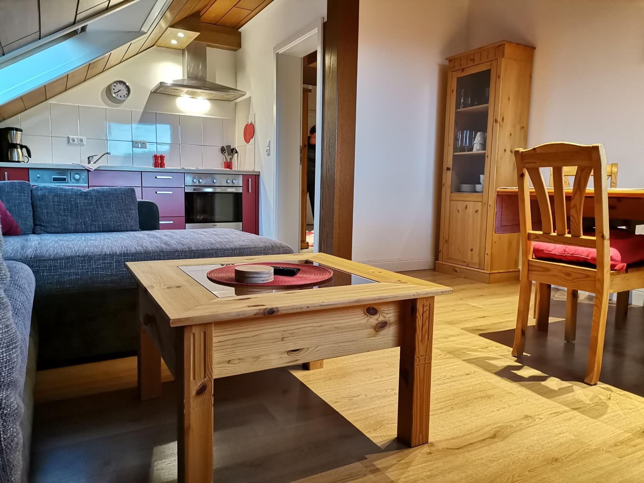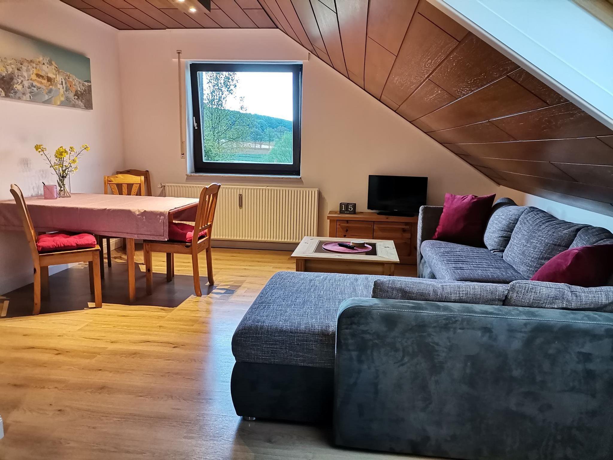 Ferienwohnung im 2.Obergeschoss für 6 Personen mit herrlicher Aussicht in alle 4 Himmelsrichtungen. Die Wohnung verfügt über Wohnzimmer mit Sitzecke, Eßecke, SAT-TV; Küche mit 4-Plattenherd, Backofen, Mikrowelle, Kühlschrank; 3 Schlafzimmer, davon 2 Zimmer mit franz. Bett (160 x 200), 1 Schlafzimmer mit 2 Einzelbetten, Bad mit Dusche und WC. Diese Wohnung hat KEINEN Balkon