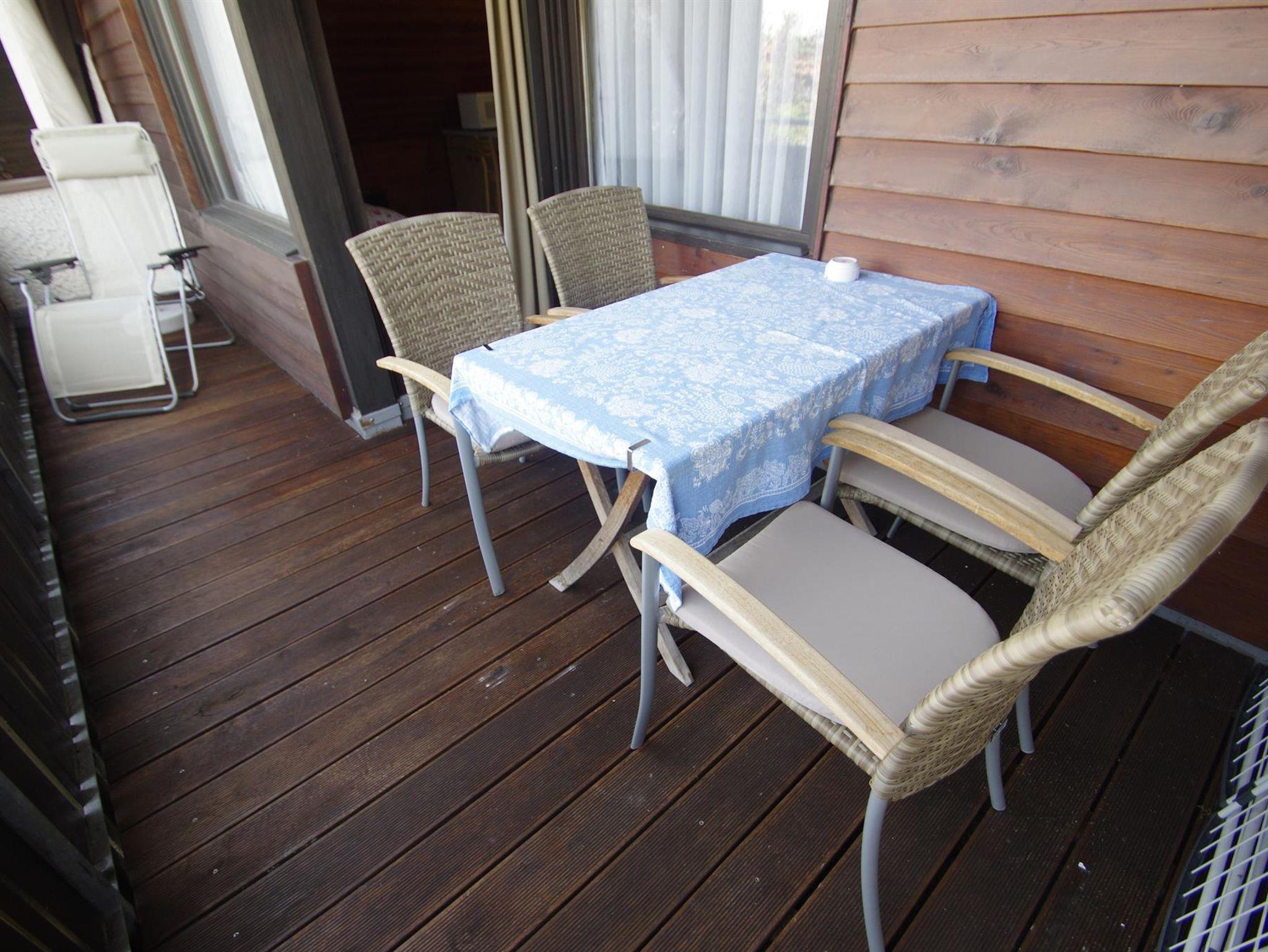 • Balkon mit einem Tisch, Stühlen, einem Sonnenschirm und einem Liegestuhl