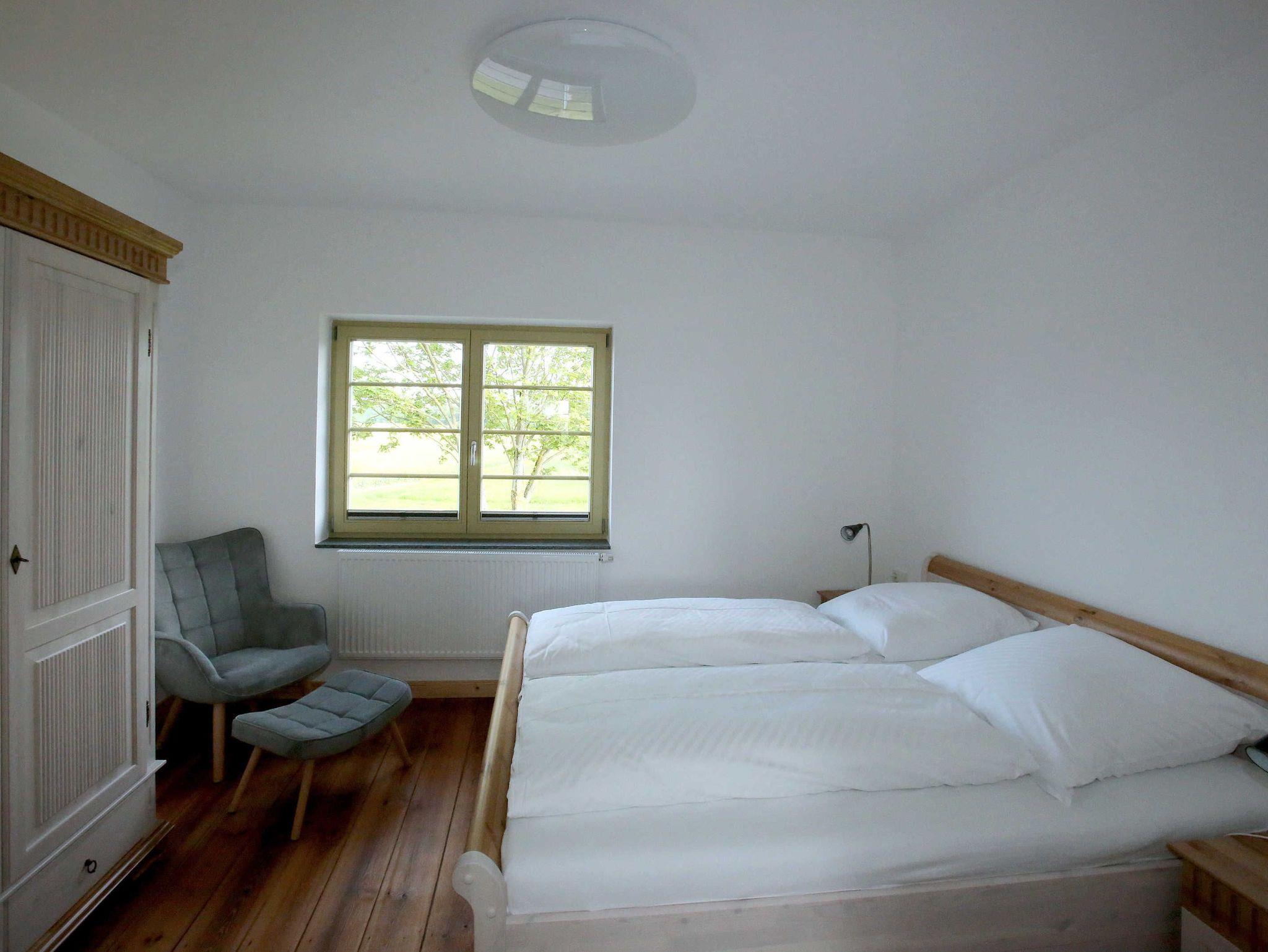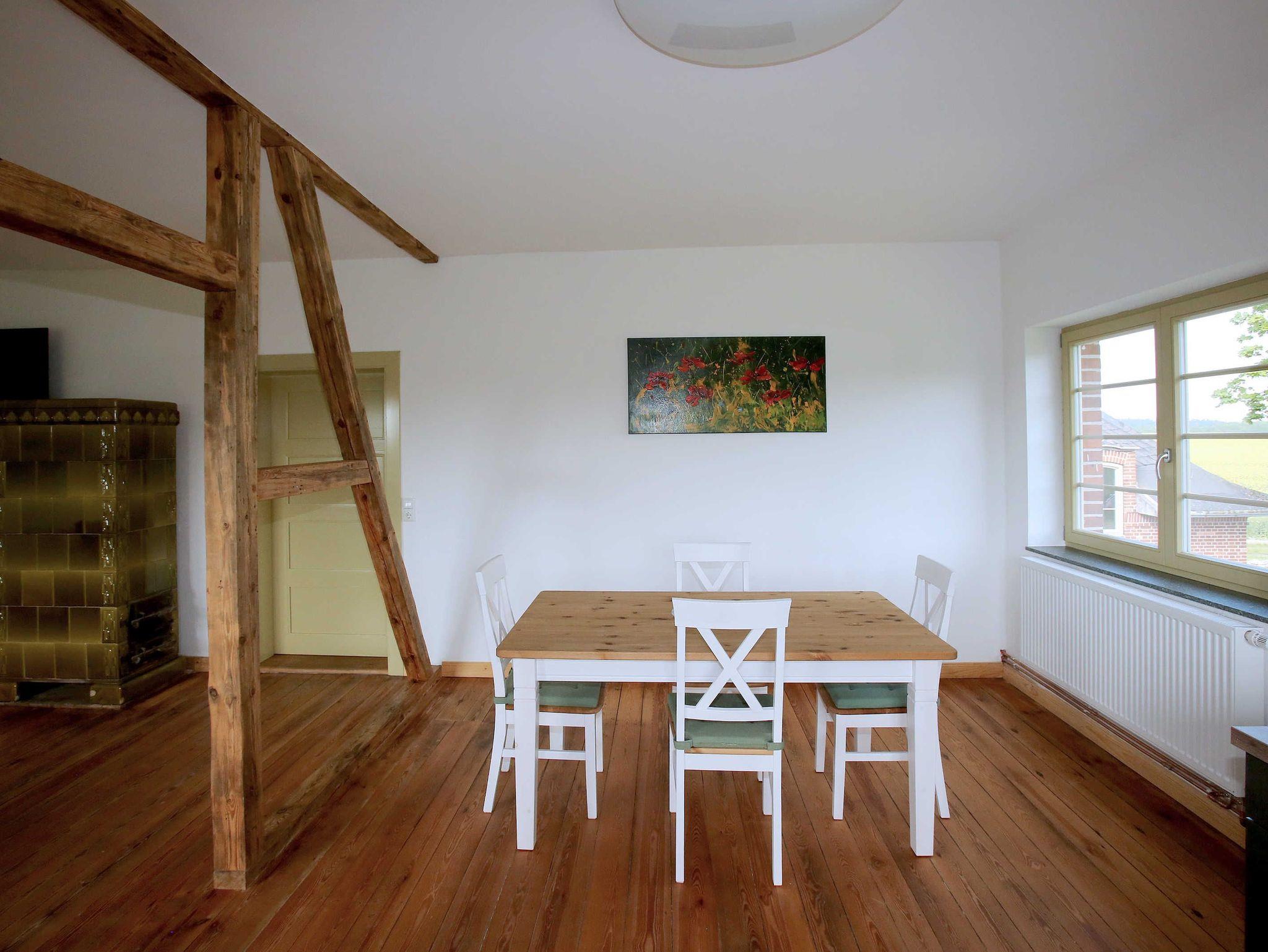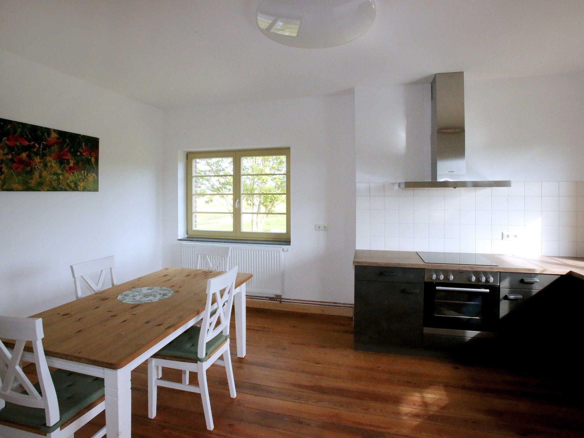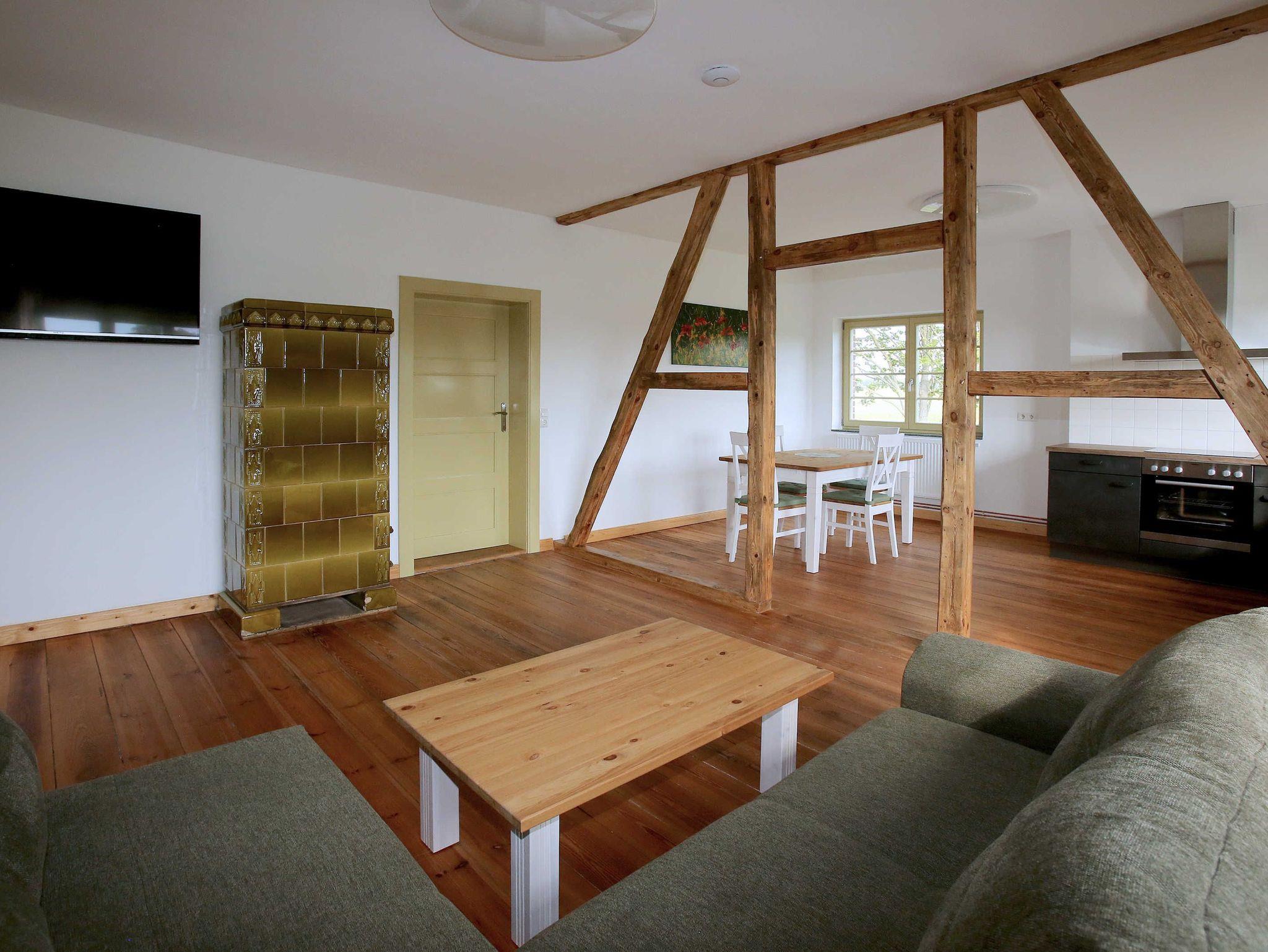 Die Ferienwohnung befindet sich im 1. Obergeschoss des Hauses. Das Wohnzimmer verfügt über eine Schlafcouch (1,50 x 2,00 m Liegefläche) zur Aufbettung. Das Schlafzimmer ist mit einem Doppelbett ausgestattet. Für Kinder bis zu 3 Jahren werden nach Verfügbarkeit ein Reise- Kinderbett und ein Hochstuhl angeboten. Bitte kontaktieren Sie bei Bedarf im Vorfeld den Gastgeber und stimmen Sie sich ab. Die Ferienwohnung verfügt über ein Badezimmer mit Dusche und WC. Die Küche ist mit Herd/Backofen und Geschirrspüler ausgestattet.