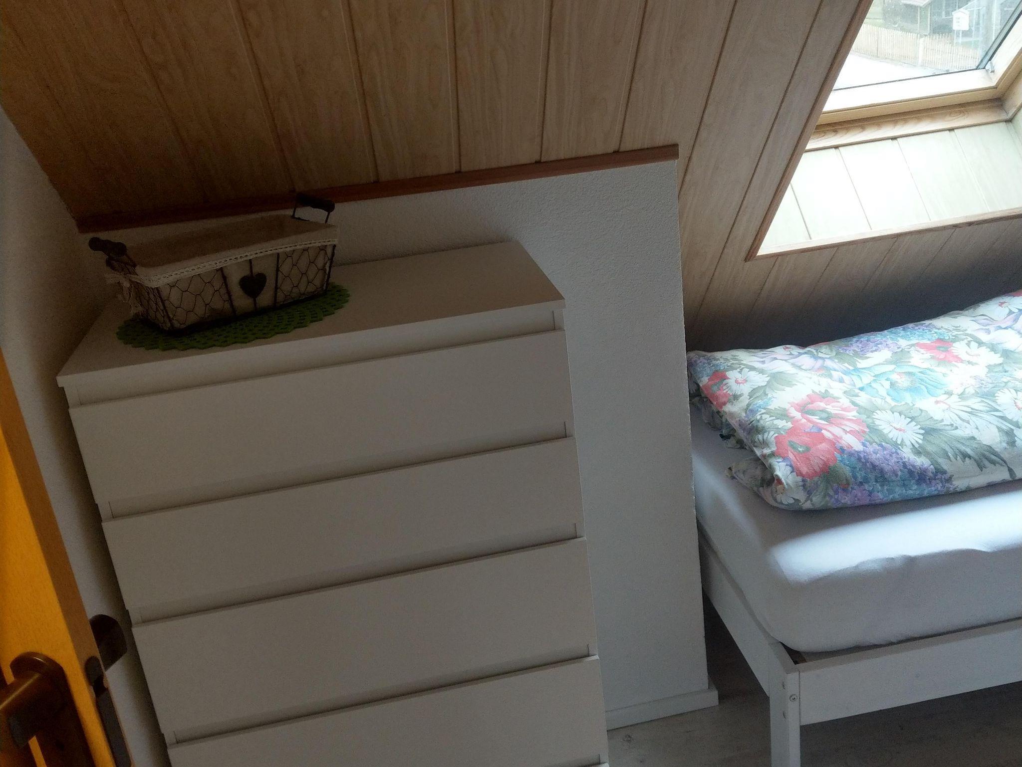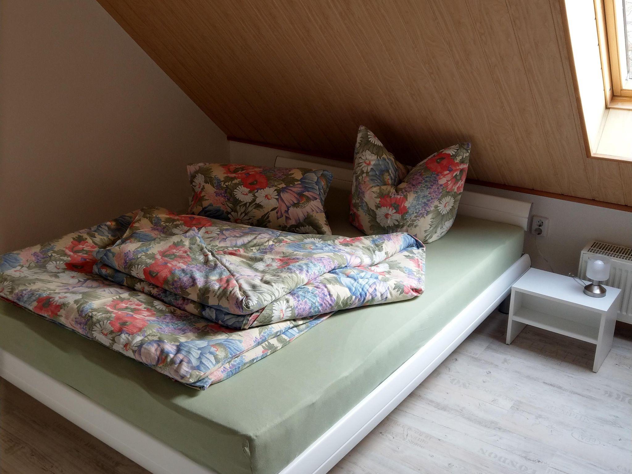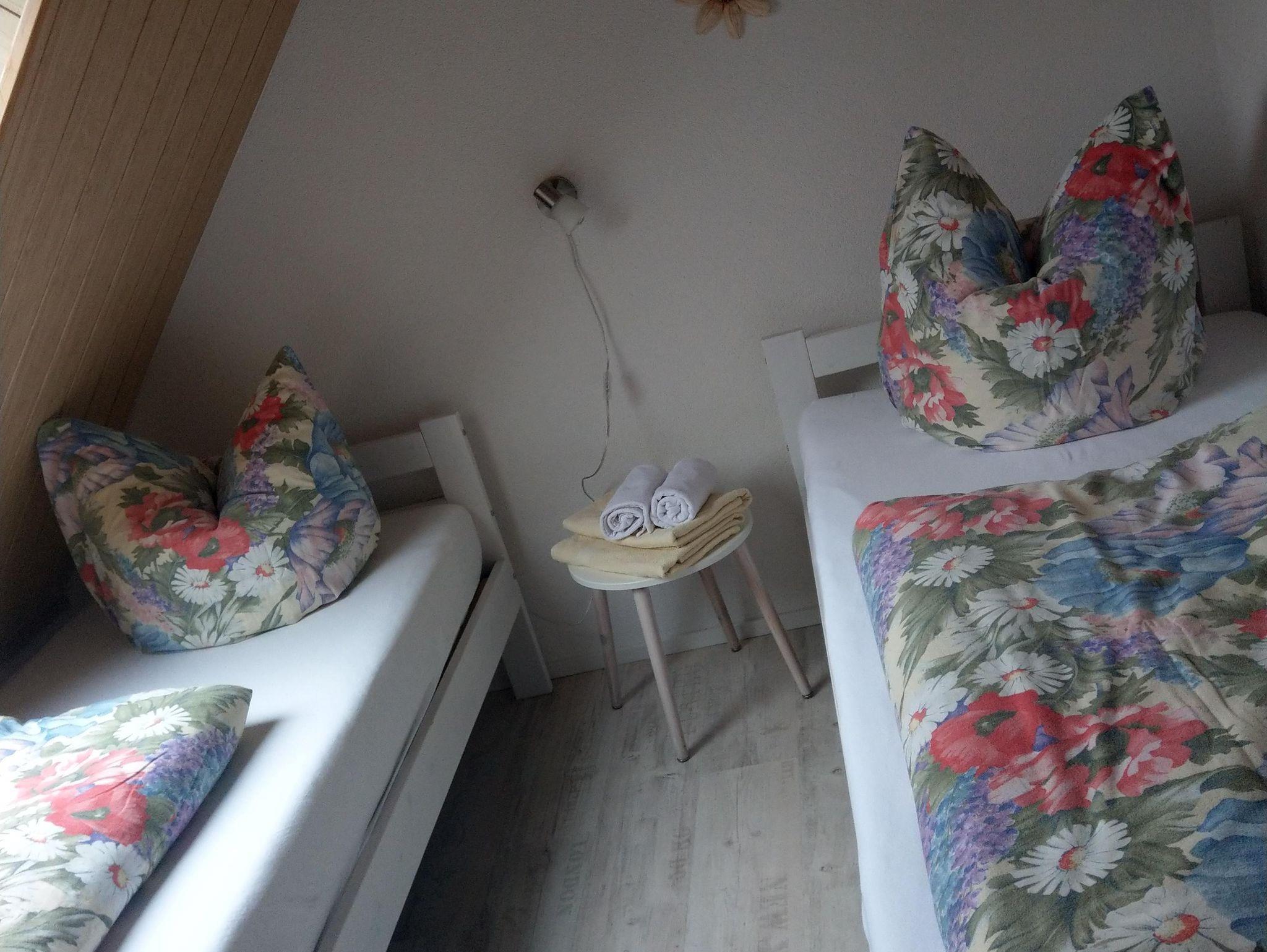 Unsere ca. 40 m² große Ferienwohnung ist auf zwei Etagen aufgeteilt. Im Erdgeschoss befindet sich der Wohnraum mit einem Essplatz für 4 Personen, einer gemütlichen Couch sowie einer Miniküche mit Kühlschrank, Mikrowelle, Toaster und Kaffeemaschine. Das kleine Bad verfügt über Dusche, WC, Waschtisch, Föhn und einen Handtuchheizkörper. Im Dachgeschoss sind 2 Schlafräume eingerichtet. Der Größere verfügt über ein Doppelbett, Kleiderschrank und Herrendiener. Im kleineren Schlafraum befinden sich zwei Einzelbetten, die durch einen Nachttisch getrennt sind sowie eine Wäschekommode.