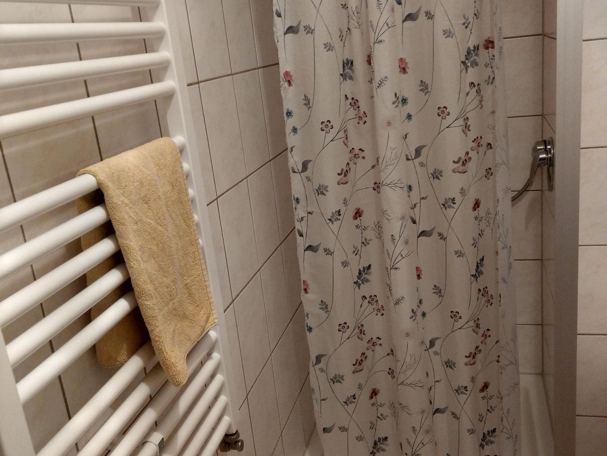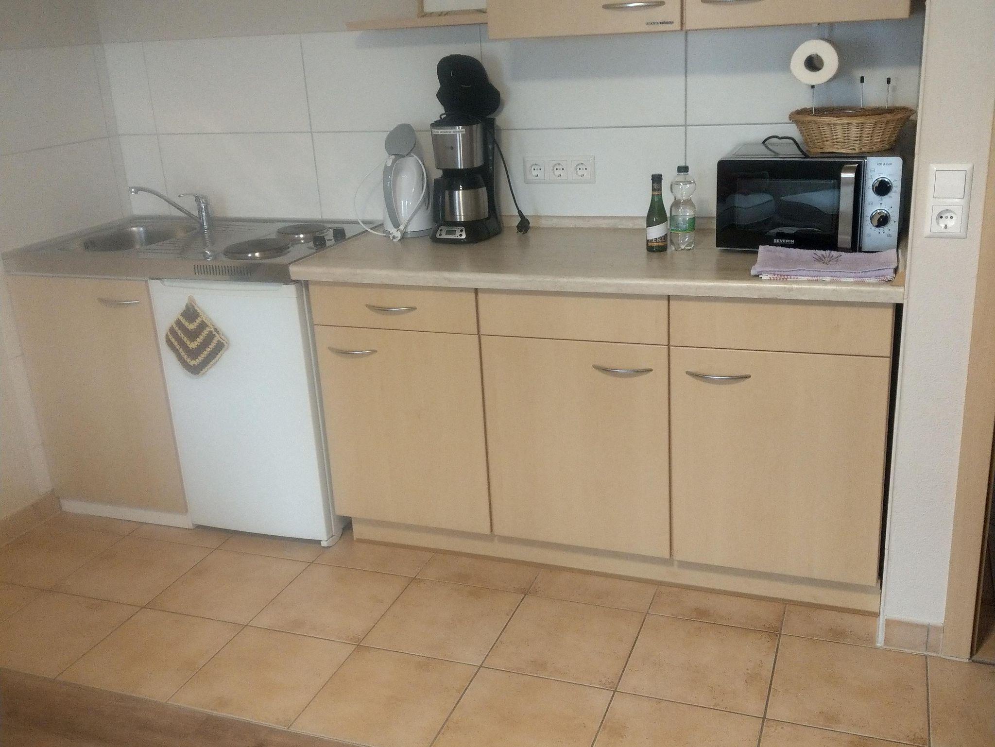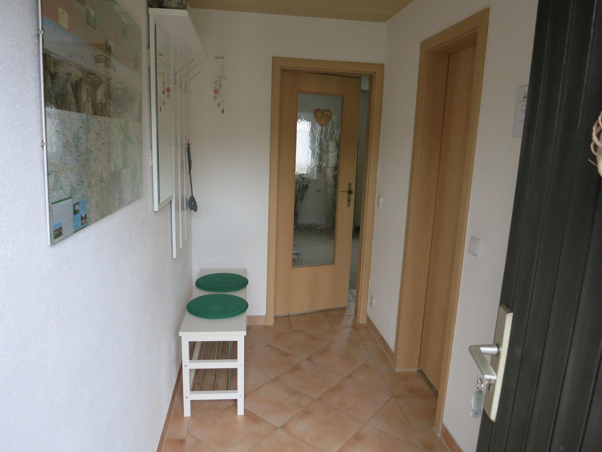 Unsere ca. 40 m² große Ferienwohnung ist auf zwei Etagen aufgeteilt. Im Erdgeschoss befindet sich der Wohnraum mit einem Essplatz für 4 Personen, einer gemütlichen Couch sowie einer Miniküche mit Kühlschrank, Mikrowelle, Toaster und Kaffeemaschine. Das kleine Bad verfügt über Dusche, WC, Waschtisch, Föhn und einen Handtuchheizkörper. Im Dachgeschoss sind 2 Schlafräume eingerichtet. Der Größere verfügt über ein Doppelbett, Kleiderschrank und Herrendiener. Im kleineren Schlafraum befinden sich zwei Einzelbetten, die durch einen Nachttisch getrennt sind sowie eine Wäschekommode.