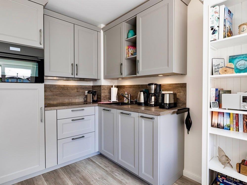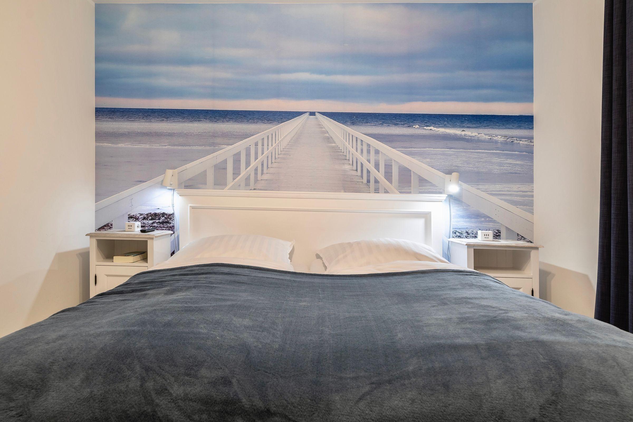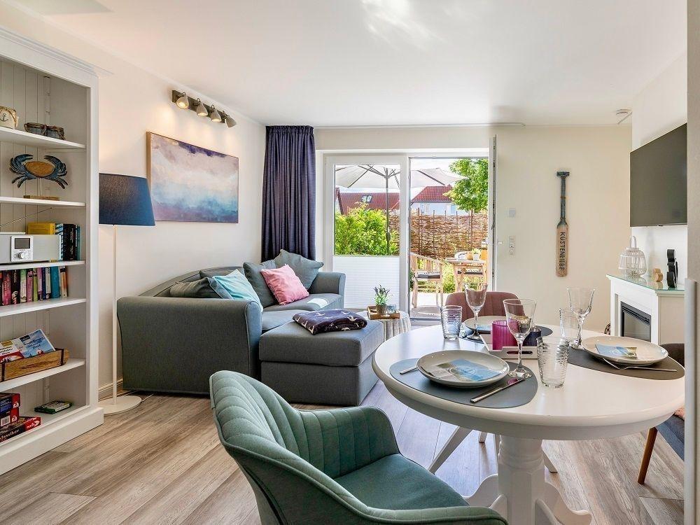 Die Ferienwohnung "Meerliebe" im Erdgeschoss besticht durch moderne Ausstattung und liebevolle Details. Der eigene Eingang führt in ein lichtdurchflutetes Wohnzimmer mit einem komfortablen Schlafsofa, großem Smart-TV und Elektrokamin. Eine vollausgestattete Einbauküche bietet zahlreiche Geräte, einschließlich Geschirrspüler und Kaffeemaschine. Das Schlafzimmer lädt mit einem großen Doppelbett (90 x 210 cm) zum Entspannen ein und verfügt über einen Smart-TV sowie Verdunklungsgardinen. Das helle Badezimmer ist mit einer großzügigen Dusche und einem Waschtrockner ausgestattet. Die Fußbodenheizung sorgt für angenehme Wärme, und kostenfreies WLAN ist verfügbar. Ein Parkplatz befindet sich direkt vor der Tür, während eine große abschließbare Box für Fahrräder oder Kinderwagen bereitsteht. Ein kleiner Hund bis 20 kg ist willkommen.