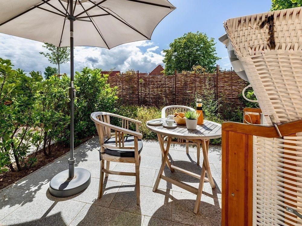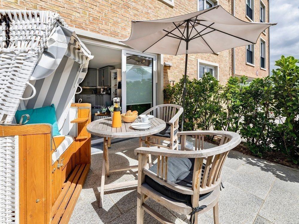 Der Außenbereich der Ferienwohnung Meerliebe bietet eine einladende und entspannende Atmosphäre. Die geschützte Süd-Westterrasse lädt mit einem gemütlichen Strandkorb und bequemen Gartenmöbeln ein, die Nachmittagssonne zu genießen. Ein Sonnenschirm sorgt für schattige Plätze während der heißen Tage. Hier finden bis zu 8 Sonnenstunden im Sommer statt, ideal für entspannte Stunden im Freien. Für sportliche Aktivitäten steht ausreichend Platz für Wassersportausrüstung zur Verfügung. Ein Wasseranschluss auf der Terrasse ergänzt das Angebot und erleichtert die Nutzung. Der gemeinschaftliche Außenbereich ist perfekt geeignet, um nach einem erlebnisreichen Tag die Seele baumeln zu lassen. Zudem kann vor der Haustür ein Parkplatz genutzt werden, was das Entladen des Autos erleichtert. Hunde bis zu einem Gewicht von 20 kg sind herzlich willkommen, und nahegelegene Freizeitmöglichkeiten wie eine Surf- und Segelschule runden den Außenbereich ab.
