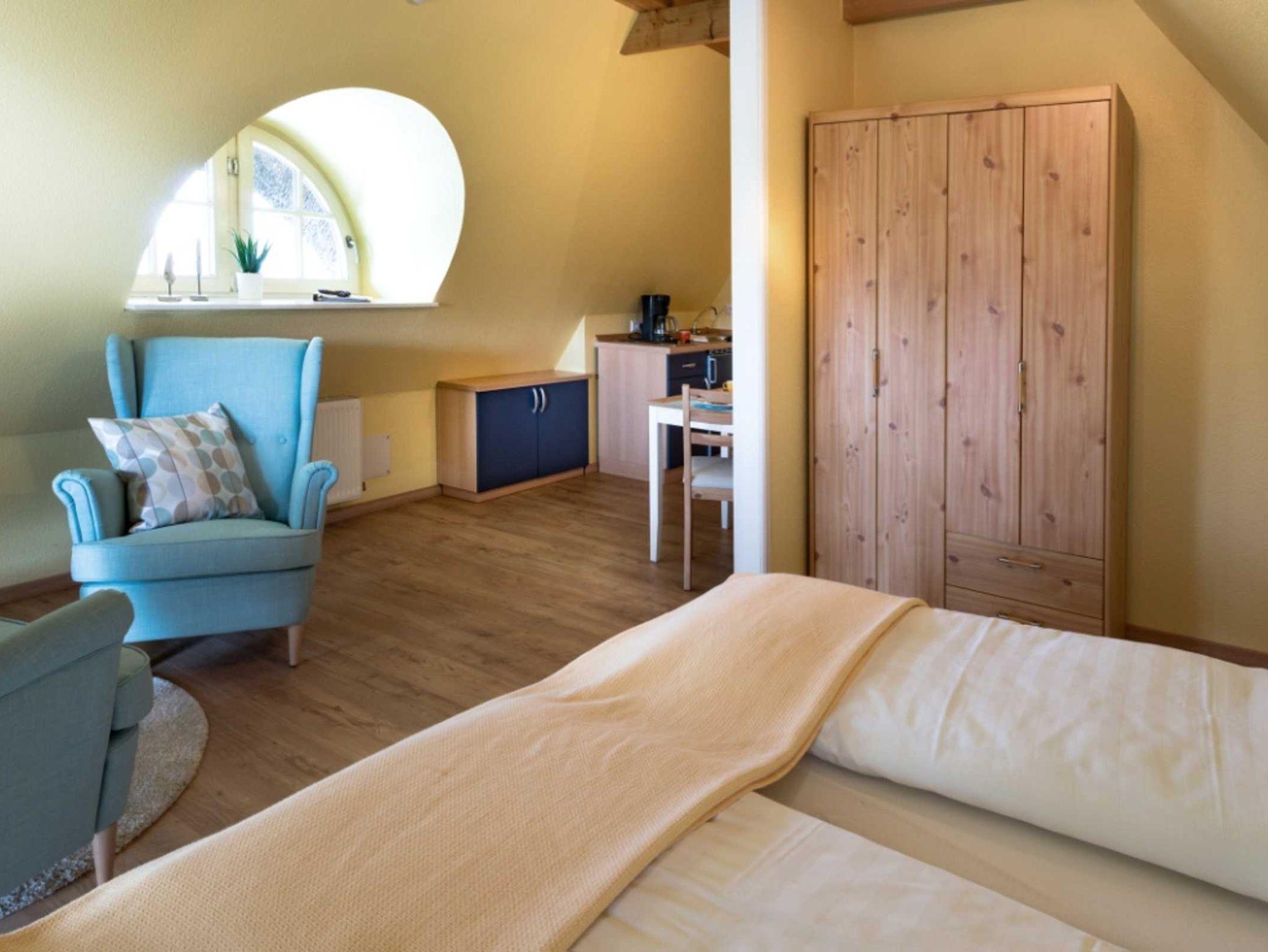 Wohnen Sie in einer der gemütlichen 40qm Ferienwohnungen (geeignet für 2 Personen) unter dem Reetdach des des 300 Jahre alten Fachwerkbauernhauses. Die Ferienwohnungen verfügen über ein Wohn-Schlafzimmer mit Doppelbett, einer Sitzecke mit Sessel und TV, einer Kochnische und einem separaten Bad mit Dusche und WC. Hunde auf Anfrage.