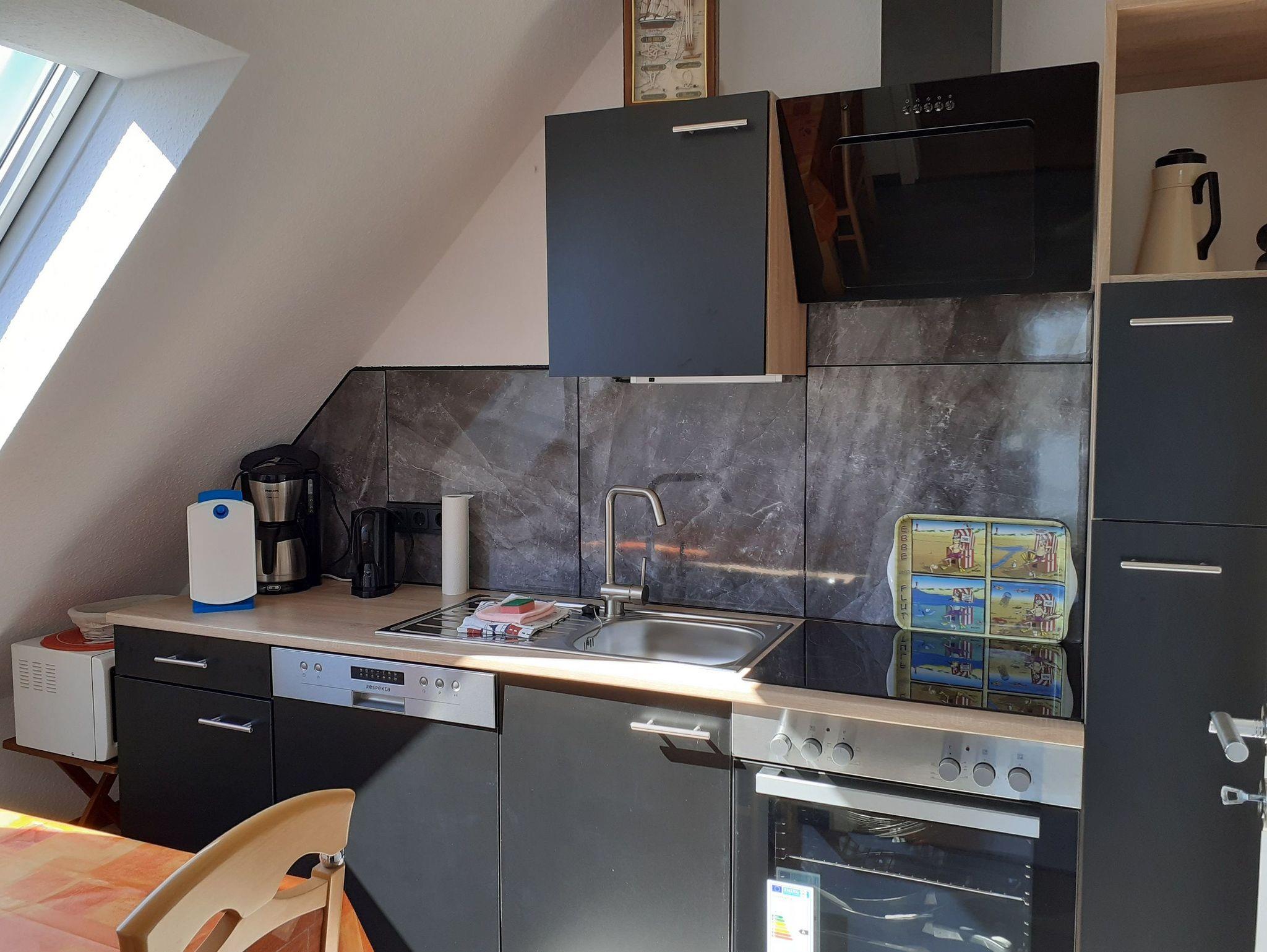Die Nichtraucherwohnung Arngast befindet sich im Obergeschoß und bietet einen gemütlichen Wohnraum, einen Schlafraum mit Doppelbett, eine separate Küche mit Sitzecke sowie ein Badezimmer mit Tageslicht und ebenerdiger Dusche. Sie ist komfortabel und gemütlich eingerichtet und mit Fliesen- und Laminatböden ausgestattet. Sie verfügt über einen Flachbild-Fernseher und einen Blu-ray-Player. In der Küche steht für die Selbstversorgung alles zur Verfügung (Geschirrspüler, Backofen, Wasserkocher, Mikrowelle, Kühlschrank mit Eisfach).