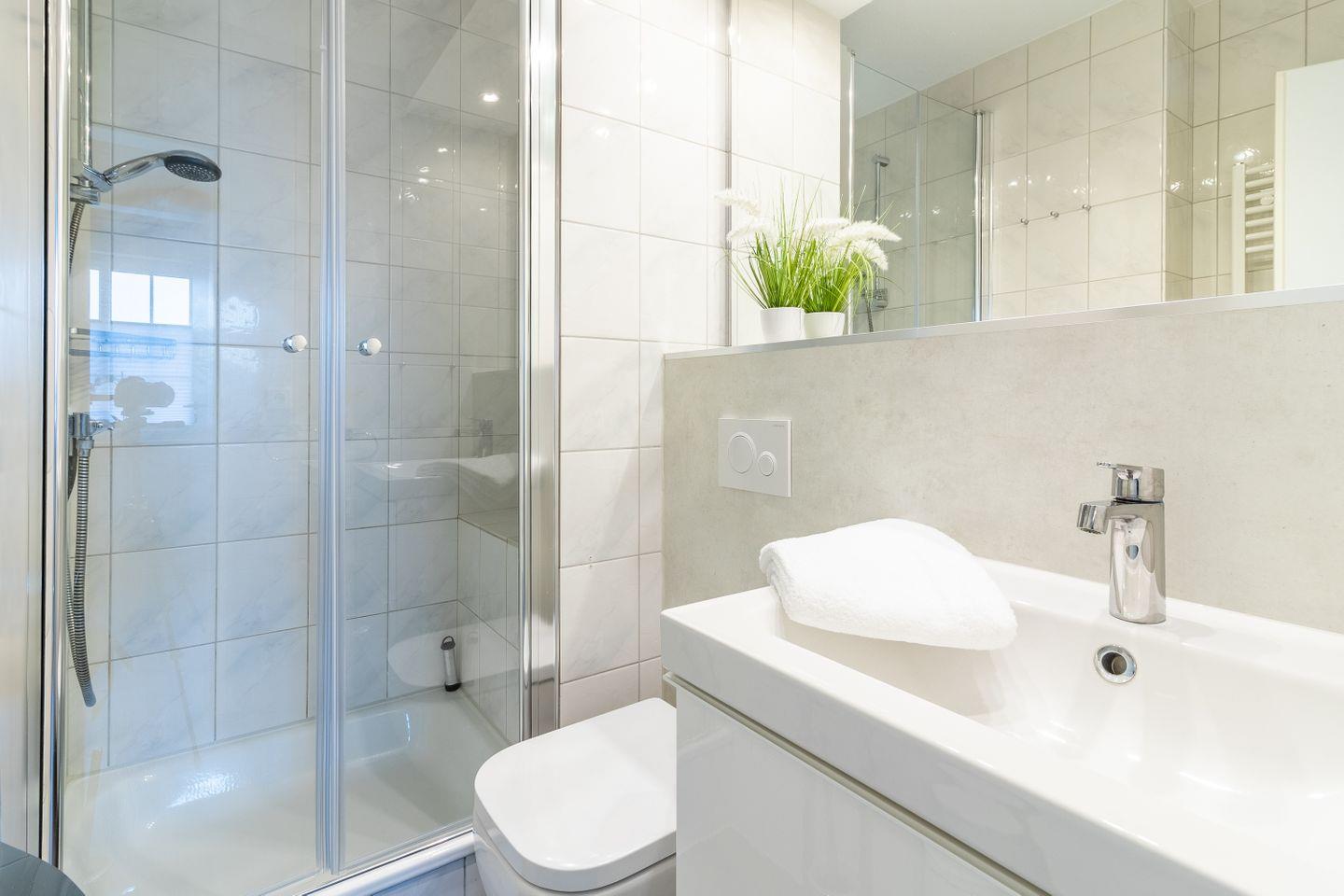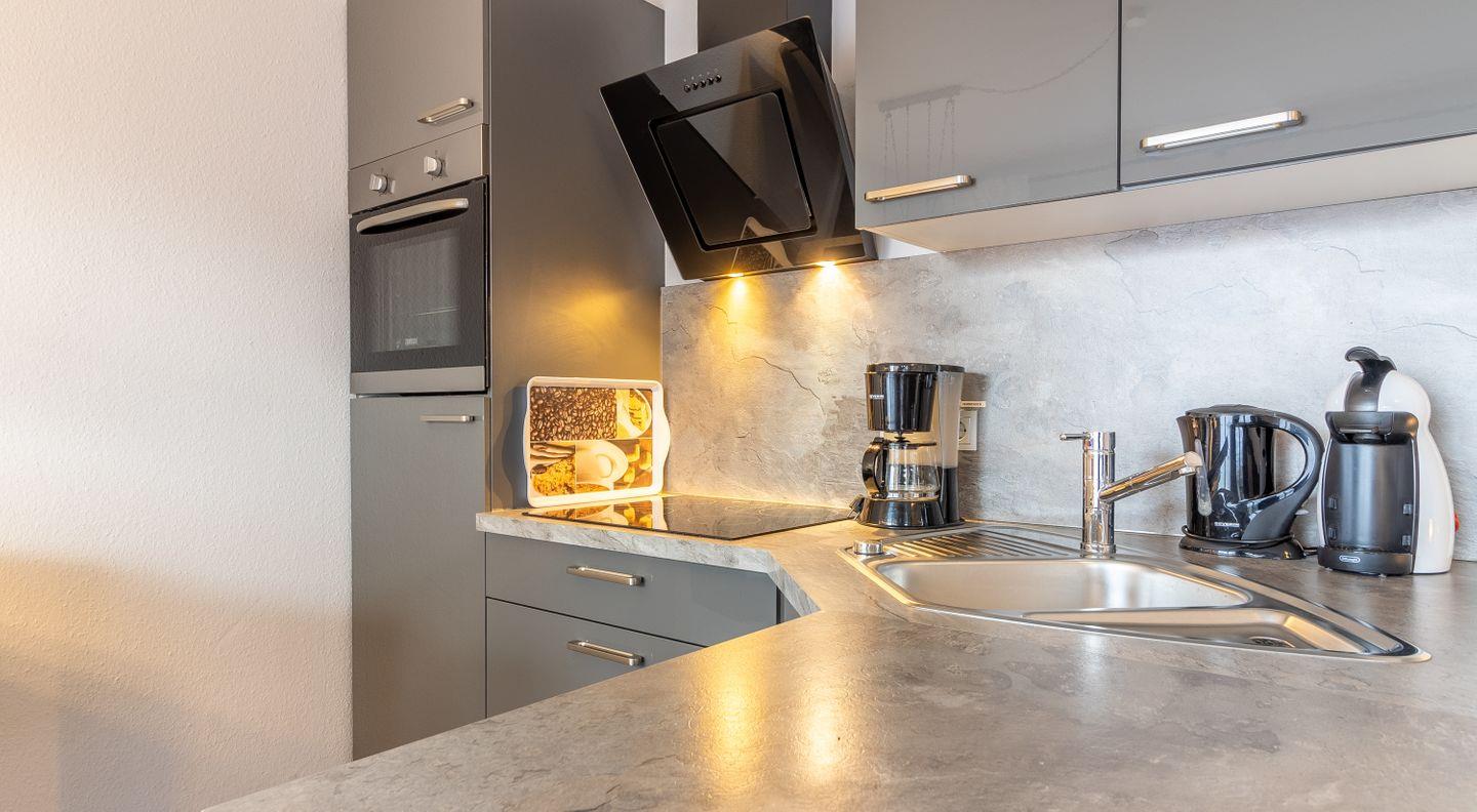 Die moderne Einbauküche in der Küche ist mit Spülmaschine, Backofen, Kühlschrank mit Eisfach, Mikrowelle und weiteren Elektrogeräten ausgestattet. Das Badezimmer präsentiert sich ebenfalls modern mit einer Dusche, WC, beheiztem Handtuchhalter und Fön.