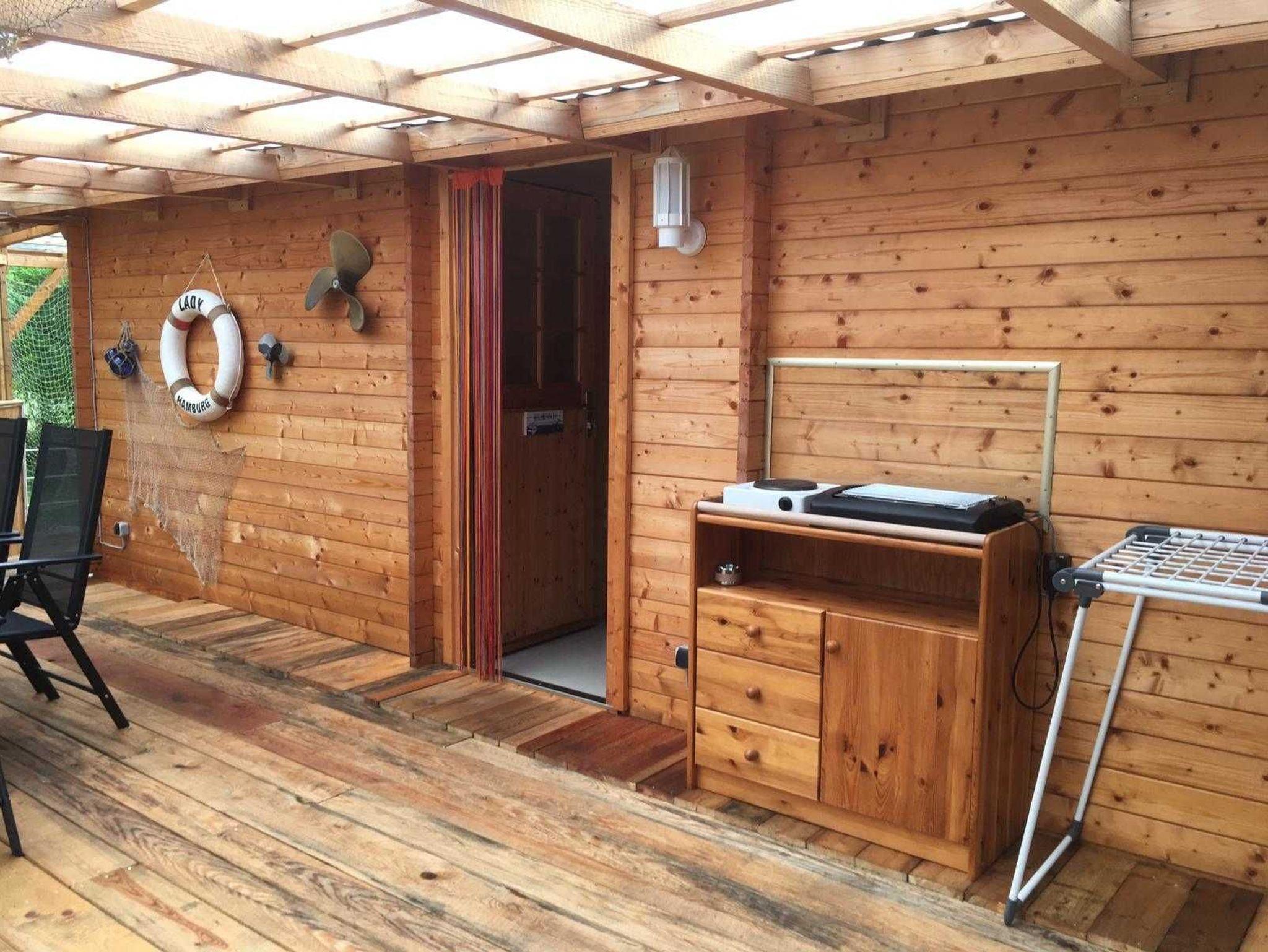 Terrasse überdacht mit Sitzecke und Sonnenliege, Elektrogrill und Hängematte, Wäscheständer
