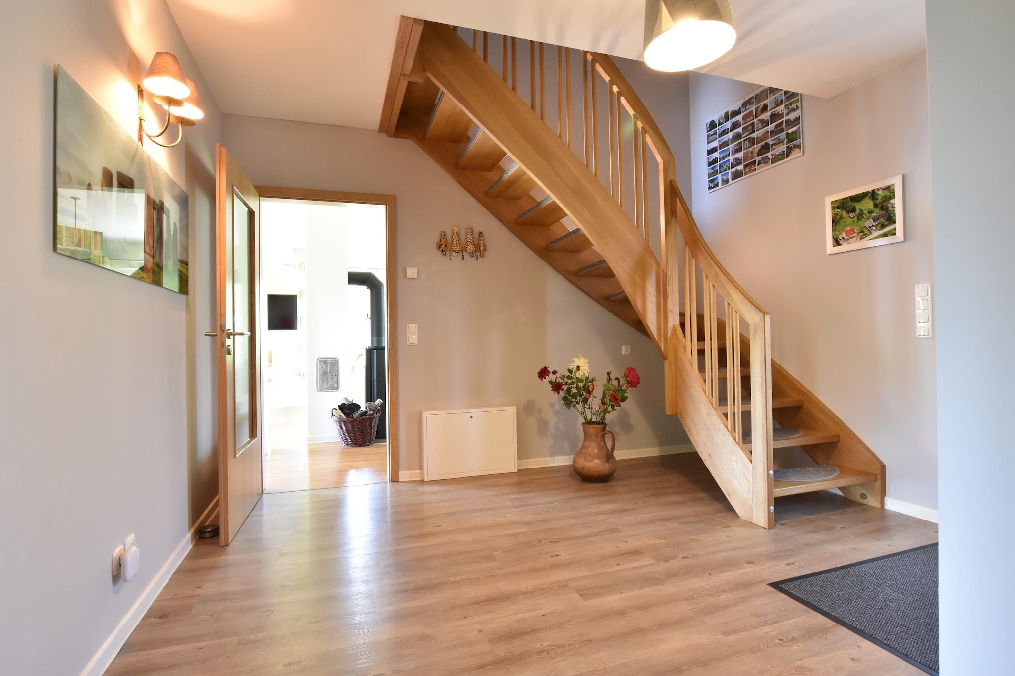 Parterre: (offene Küche(Kochplatte(4 Kochplatten, Ceranfeld), Wasserkocher, Toaster, Dunstabzugshaube, Kaffeemaschine, Backofen, Mikrowelle, Spülmaschine, Kühl-/Gefrierkombination), Wohn/Esszimmer(TV, Esstisch, Kaminofen, Radio), Schlafzimmer(Doppelbett), Badezimmer(Dusche, Waschbecken, Toilette), Wirtschaftsraum(Waschmaschine), Heizung) In der 1. Etage: (Schlafzimmer(Doppelbett), Schlafzimmer(3x Einzelbett), Schlafzimmer(Doppelbett, TV), Schlafzimmer(Doppelbett), Badezimmer(Badewanne, Dusche, Waschbecken, Toilette)) Babybett, Terrasse, Garten(umzäunt, 5000 m2), Fahrradabstellraum, Gartenmöbel, Liegen, Grill, Parkplatz, Trampolin, Sonnenschirm, Tischfußball, Fußballtor, Hochstuhl, Gesellschaftsspiele