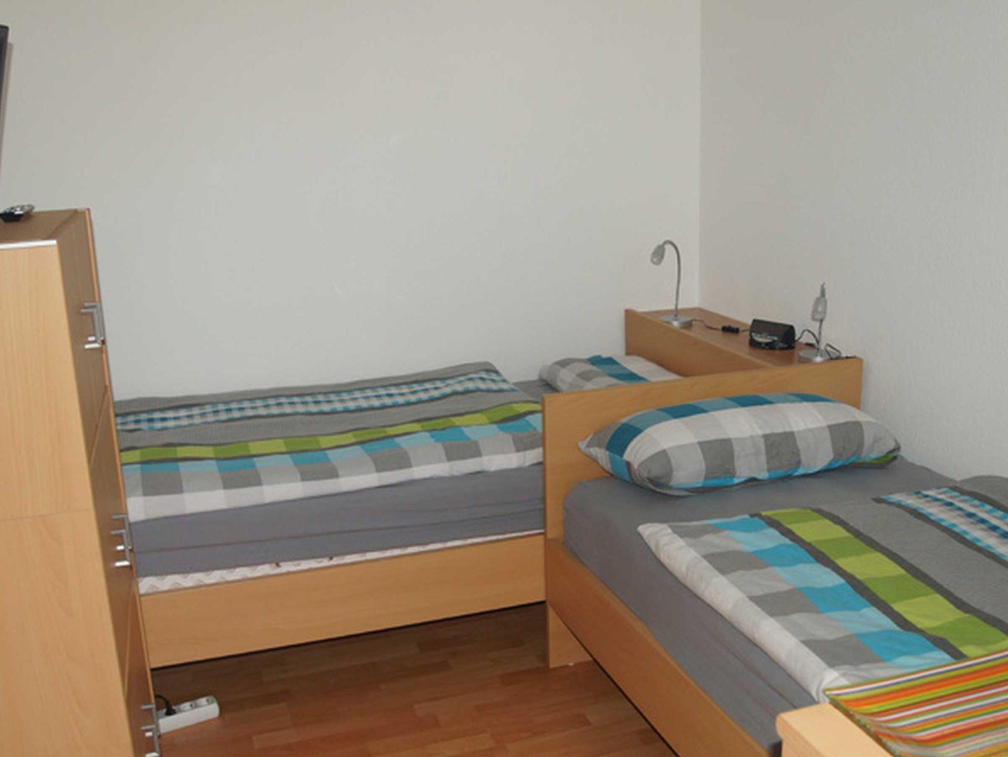 Die Ferienwohnung Dünenrose verfügt über ein separates Schlafzimmerm mit zwei Einzelbetten. Die offene Küche ist im Wohnzimmer integriert. Vom Schlafzimmer gibt es einen direkten Zugang auf den Balkon