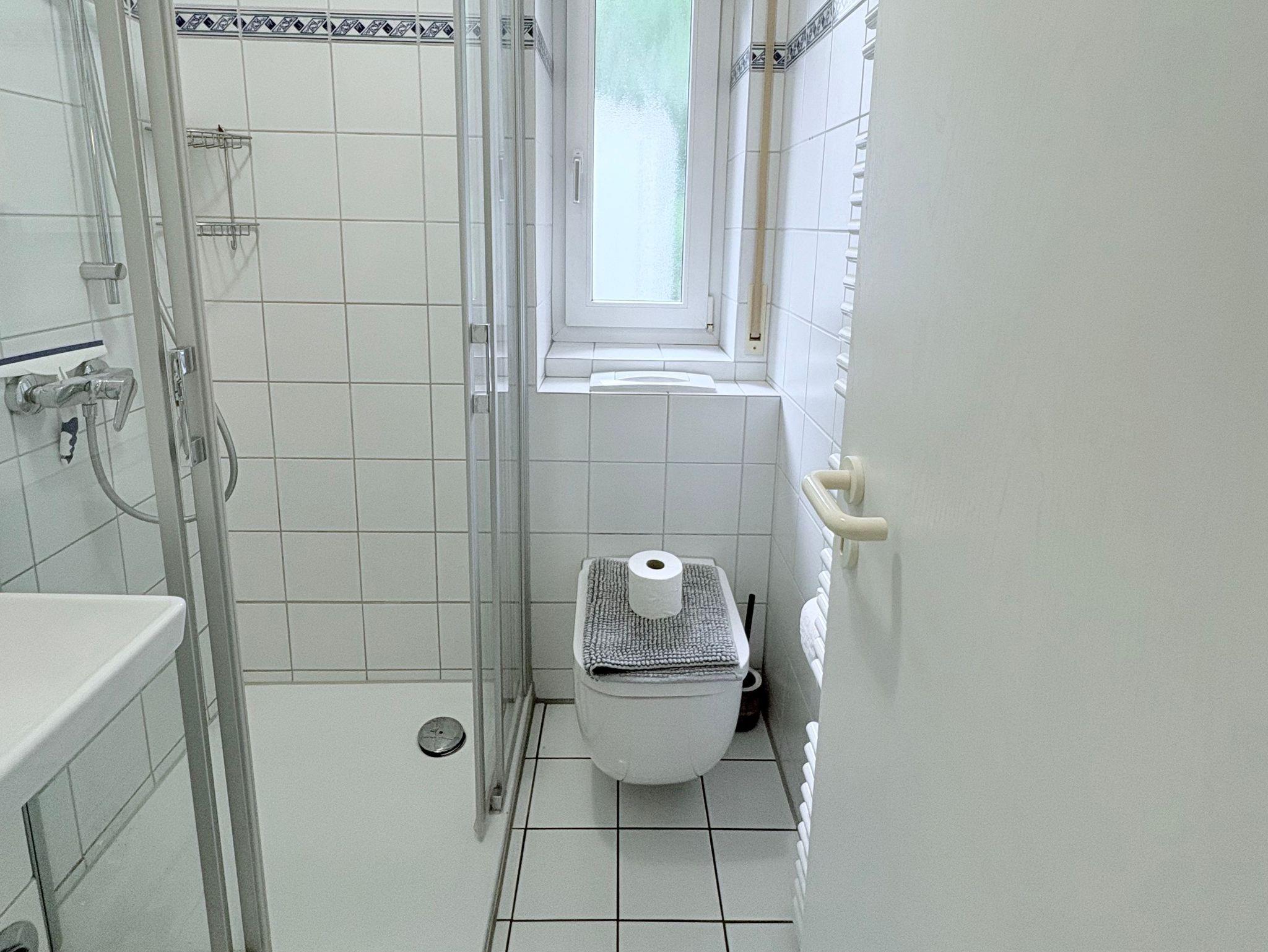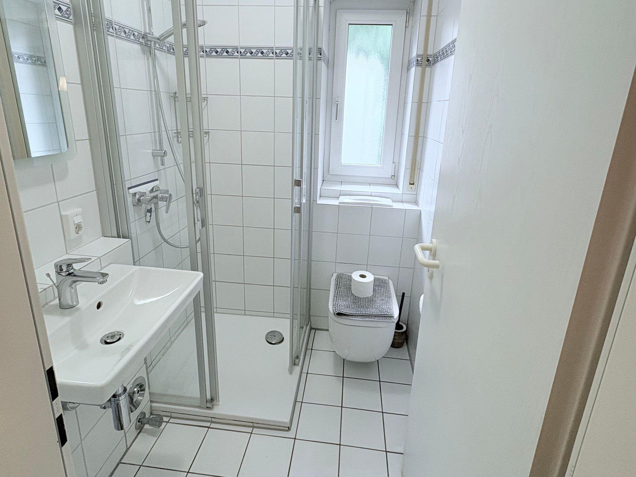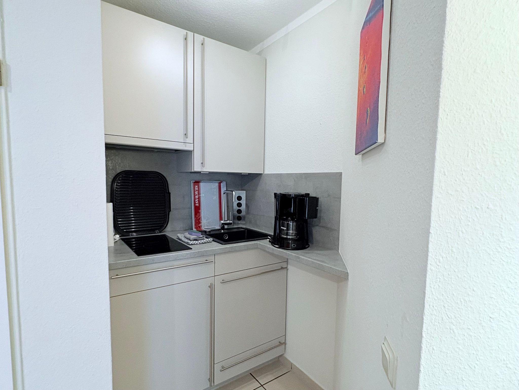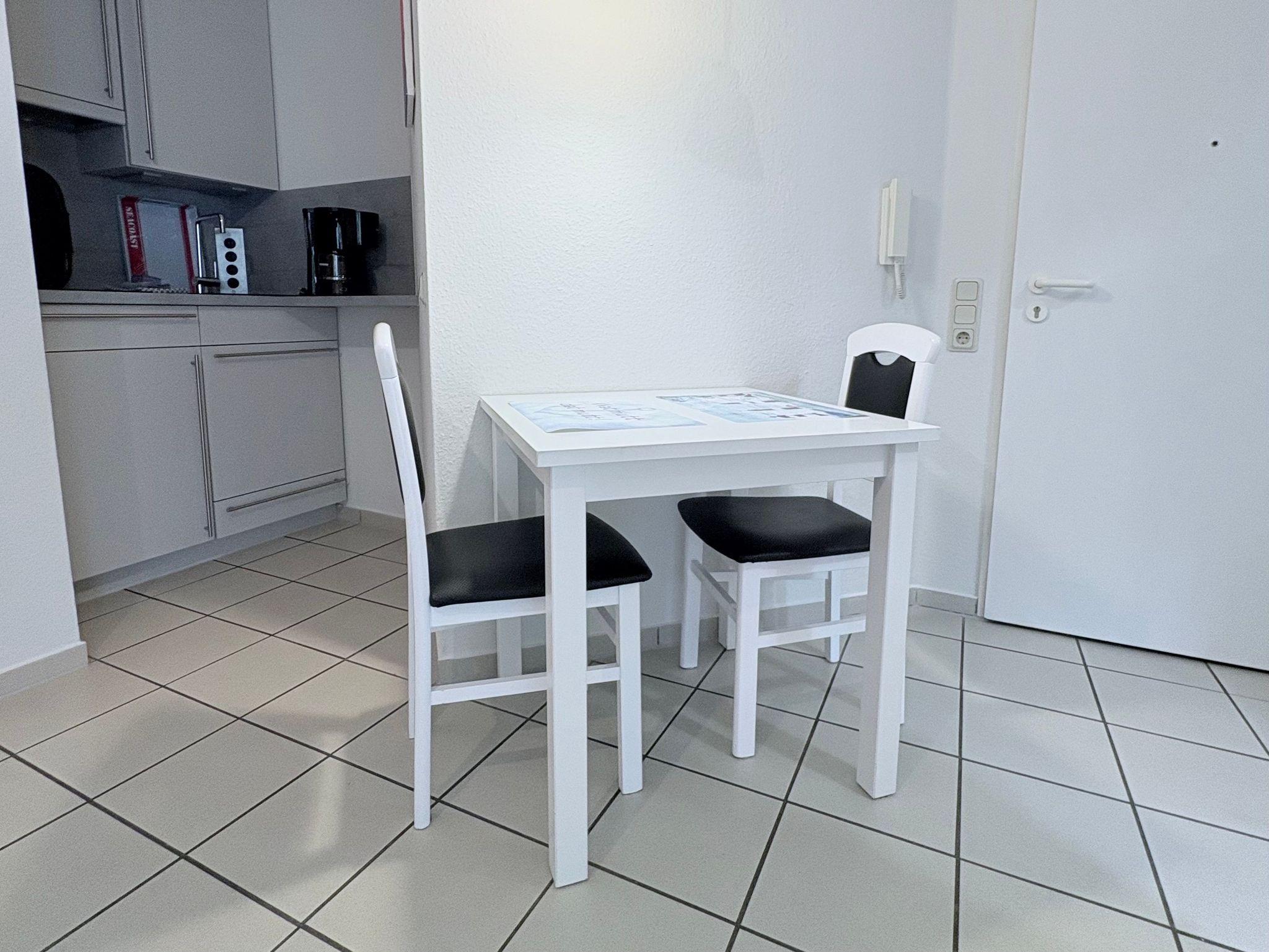 Die Wohnung ist aufgeteilt in einen gemütlichen Wohn- und Essbereich mit integrierter Küchenzeile, ausgestattet mit Ceranfeld, Kaffeemaschine und Toaster. Ein großes Sofa lädt zum Entspannen ein. Das separate Schlafzimmer mit Doppelbett sorgt für erholsame Nächte. Ein modernes Badezimmer mit Dusche und WC ergänzt die Ausstattung.