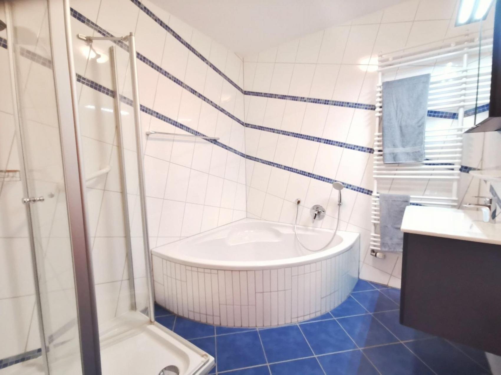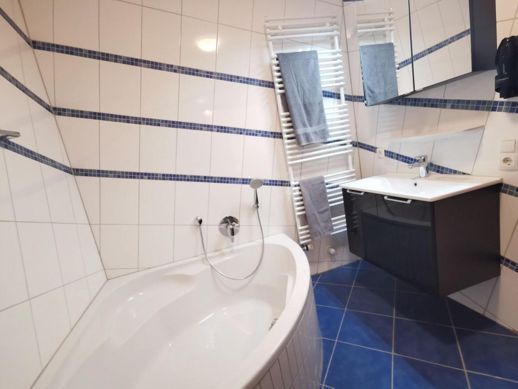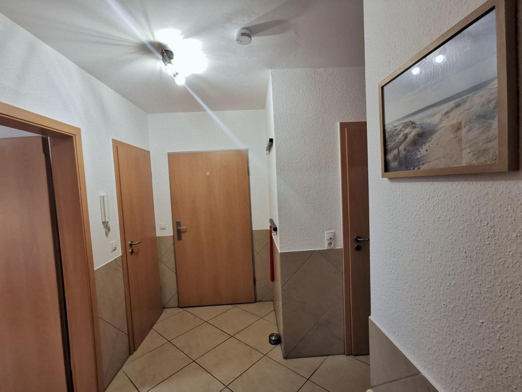 Auf 70m² finden Sie in unserer Ferienwohnung Nr.6 -Nordseetraum - alles was man für den komfortablen Urlaub benötigt. Angefangen mit dem Badezimmer: Sofort fällt ins Auge die außergewöhnliche Fliesenanordnung. Wir versichern Ihnen das man sich nach einem kurzen Augenblick daran gewöhnt hat. Eine Eckbadewanne und eine ebenerdige Dusche sind hier eingebaut. Neben dem Fön gibt es in diesem Badezimmer auch einen Handtuchtrockner. Ausgelegt ist das gesamte Badezimmer mit einer Fußbodenheizung. Das WC befindet sich in einem separaten Gäste WC. Das erste Schlafzimmer ist mit einem Doppelbett, einem Kleiderschrank sowie einem Fernseher ausgestattet. Das zweite Schlafzimmer hat zwei Einzelbetten sowie ei-nen Kleiderschrank. Dieses wird meist als Kinderzimmer genutzt. Ein großer offener Raum in dem sich Küche - Essbereich und Wohnzimmer befinden, bietet Licht von früh bis spät mit Zugang zur Terrasse und dem eigenen Garten. Auf der Terrasse haben wir einen Tisch mit 4 Stühlen bereitstehen. Der große Garten lädt zum Sonnenbaden oder gemütlichen Beisammensein zu jeder Tageszeit ein. Die Küche ist komfortabel ausgestattet mit einem Kühlschrank & Gefrierfach, einem Herd mit Ceranfeld, Backofen, Wasserkocher, Toaster, einer Kaffeemaschine und vielem mehr was man für die Zubereitung des Frühstücks, oder dem Mittagessen benötigt. Eine Spülmaschine lässt das Geschirr wieder ohne große Arbeit sauber werden. Ein Tisch mit 4 Stühlen sind vor Ort um gemeinsam zu Essen - oder für die Gesellschaftsspiele am Abend.Eine Ledercouch- Garnitur bietet genügend Platz für die ganze Familie vor dem Fernseher. Der komplette Wohn-, Ess- und Küchenbereich ist mit Fußbodenheizung ausgestattet. Hinzukommt eine Waschmaschine in einem separaten Abstellraum in der Ferienwohnung. Ein PKW-Stellplatz ist unmittelbar am Haus. Unsere Ferienwohnung befindet sich im Strandweg 3 - in unmittelbarer Nähe zum Badestrand Horumersiel.