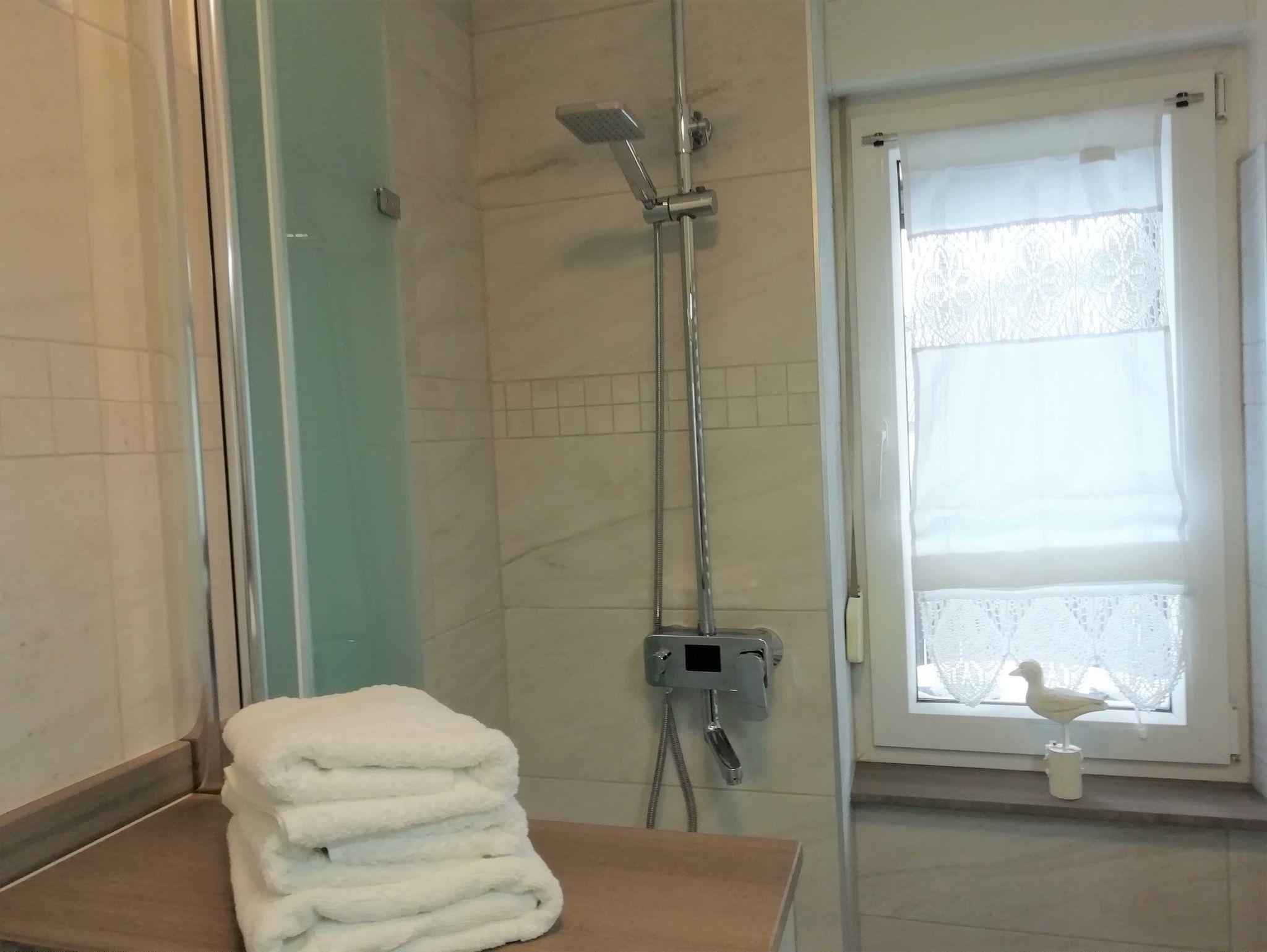 Das Badezimmer ist mit einer Dusche und einer Waschmaschine ausgestattet.