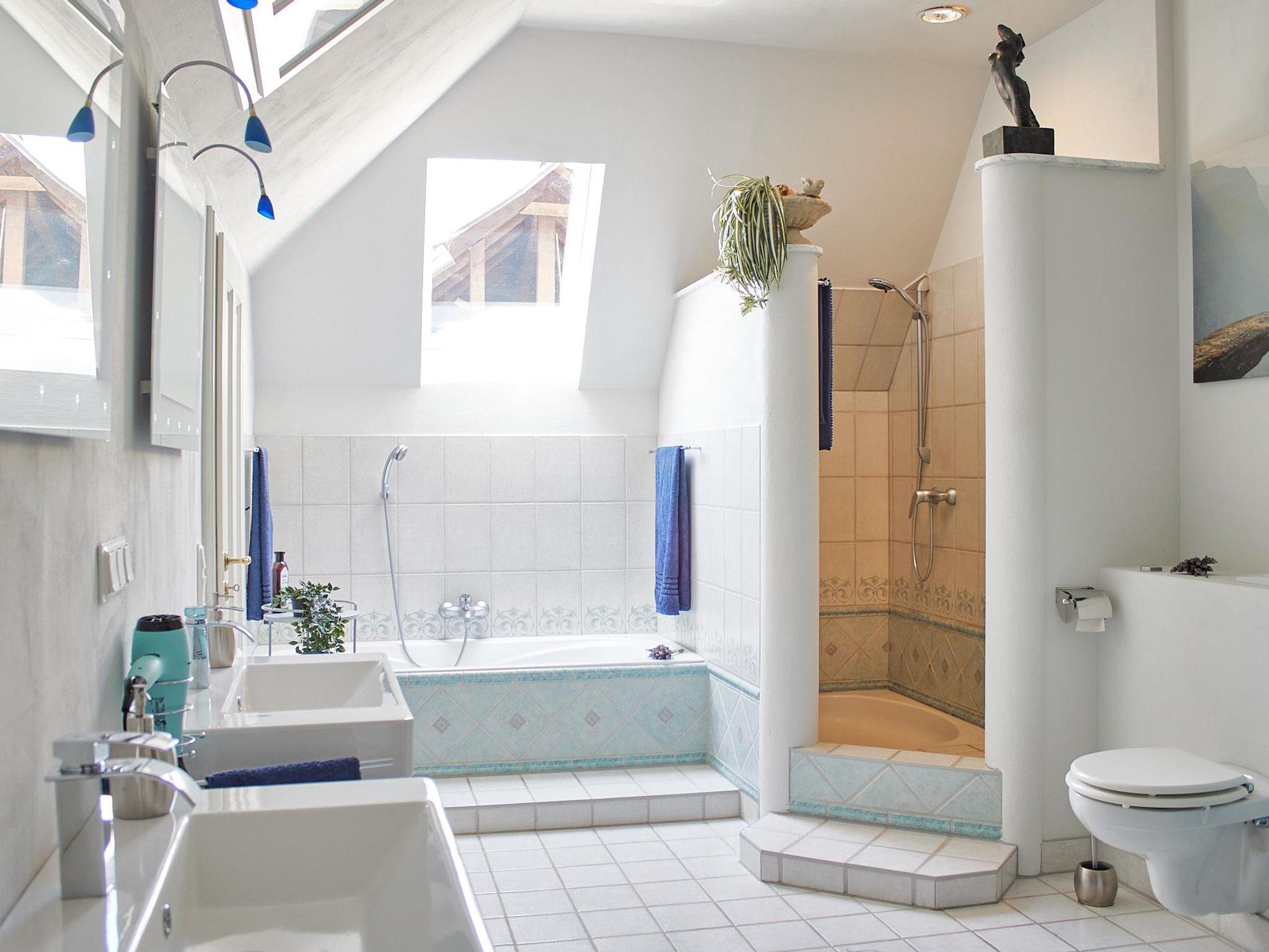Badezimmer Ein großräumiges Badezimmer mit Dusche, Badewanne, zwei Waschbecken, WC, Sauna, Haartrockner, Waschmaschine und Wäscheständer.
