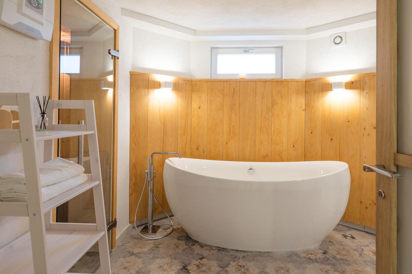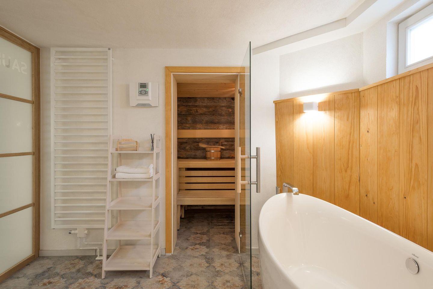 Im Untergeschoss befindet sich ein weiteres Schlafzimmer und der großzügige Wellnessbereich mit einer geräumigen Sauna, dem Nassbereich und einer frei stehenden Badewanne.