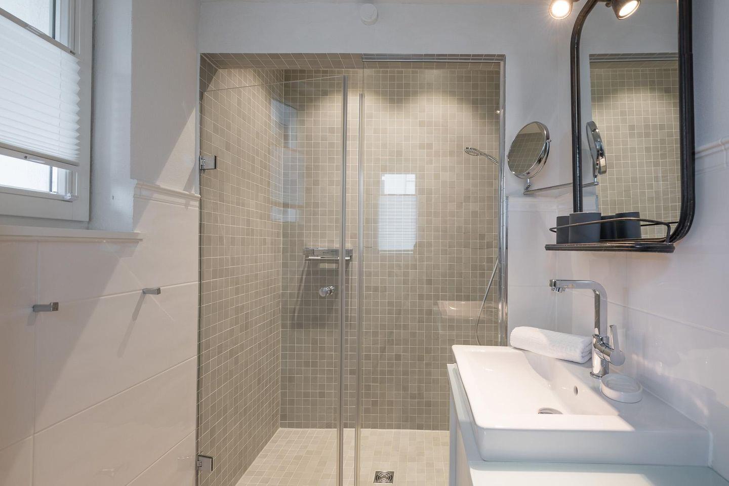 Das moderne Duschbad mit bodengleicher Dusche und ein kleiner Hauswirtschaftsraum mit Waschmaschine runden das Bild ab.