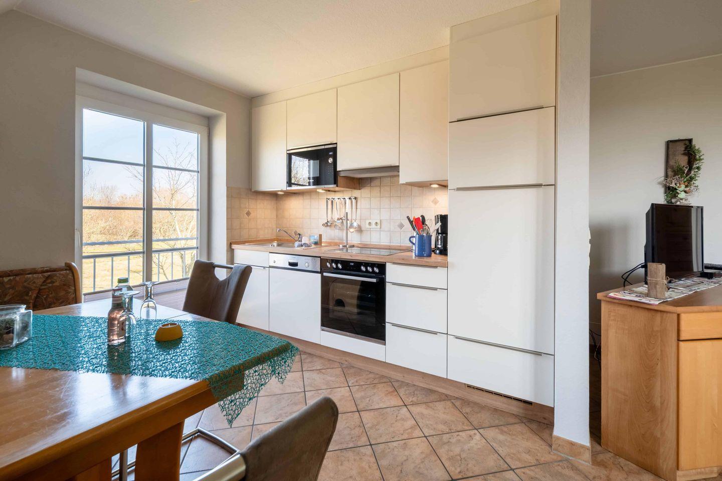Der helle Wohnraum bietet Ihnen eine gemütliche Sofaecke mit TV, einen Essbereich und eine offene Küchenzeile mit Geschirrspüler, Glaskeramikherd, Backofen, Kühlschrank mit Gefrierfach, Kaffeemaschine und Wasserkocher. Im Schlafzimmer steht Ihnen ein Doppelbett (180 x 200) für Ihren erholsamen Schlaf zur Verfügung. Das zweite Schlafzimmer ist mit einem Etagenbett ausgestattet. Das Duschbad rundet das Bild ab.