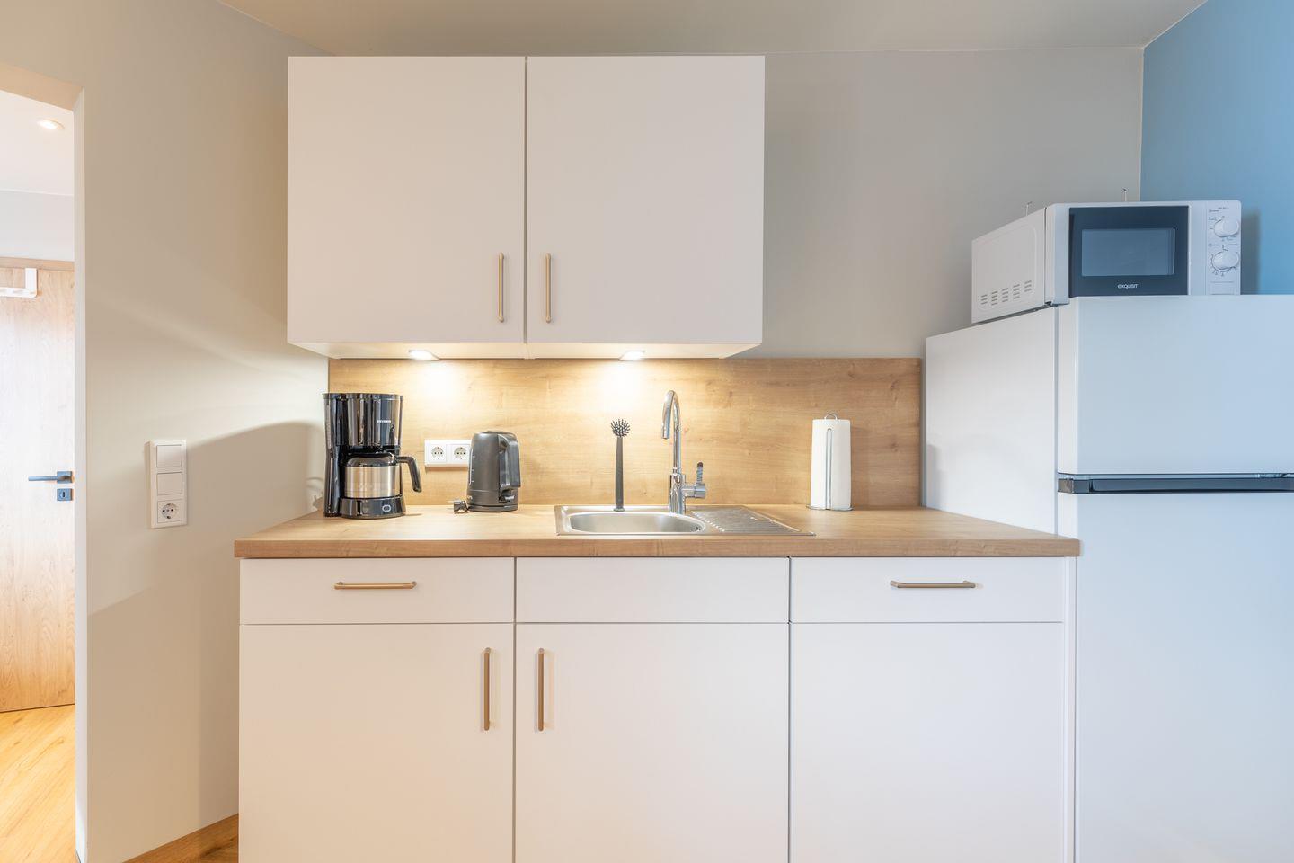 Die Ferienwohnung im Erdgeschoß eignet sich perfekt für Pärchen oder Alleinreisende: Ein Schlafzimmer mit einem bequemen Doppelbett (180 × 200) und eine komfortable und gut ausgestattete Einbauküche mit Ceranfeld, Backofen, Geschirrspülmaschine, Mikrowelle, Kaffeemaschine (Filtergröße 4). Der Wohnbereich verfügt über ein gemütliches Sofa und einen Flachbild-TV. Das moderne Badezimmer ist mit einer ebenerdigen Dusche, WC und Waschbecken eingerichtet.