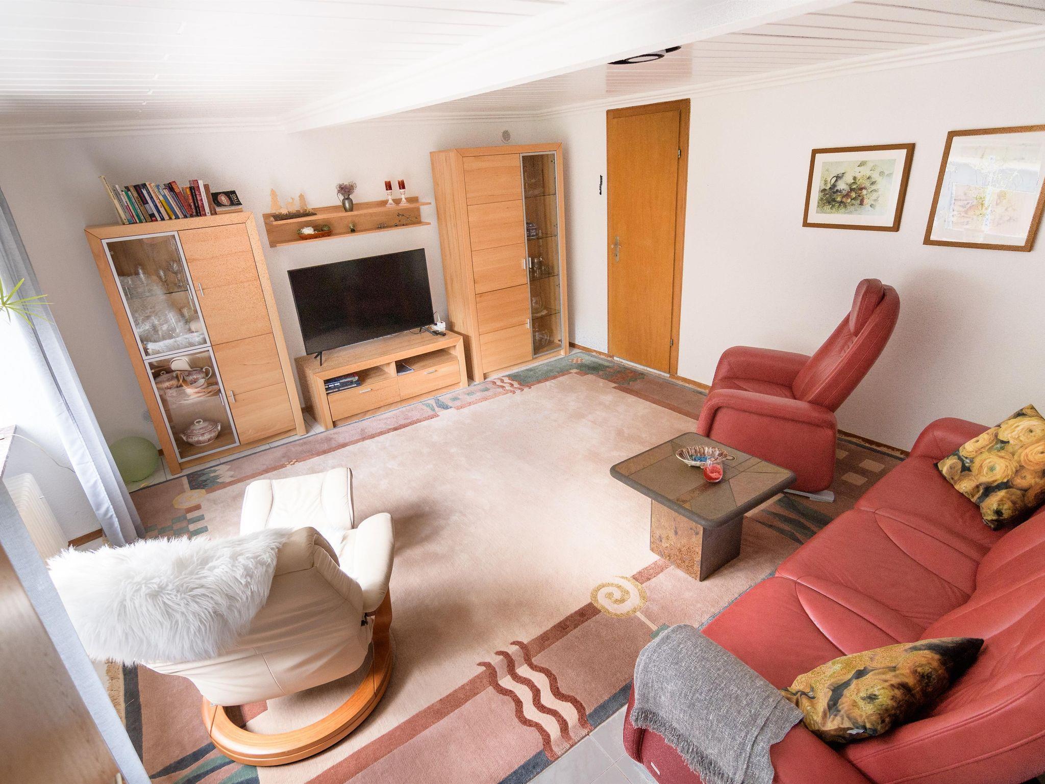 Das helle, gemütliche Wohnzimmer ist mit sehr bequemen Möbeln ausgestattet, sowie mit einem Smart TV und WLAN. Im angrenzenden, kleineren Zimmer hat eine Person Platz zum Übernachten auf einer Schlafcouch.