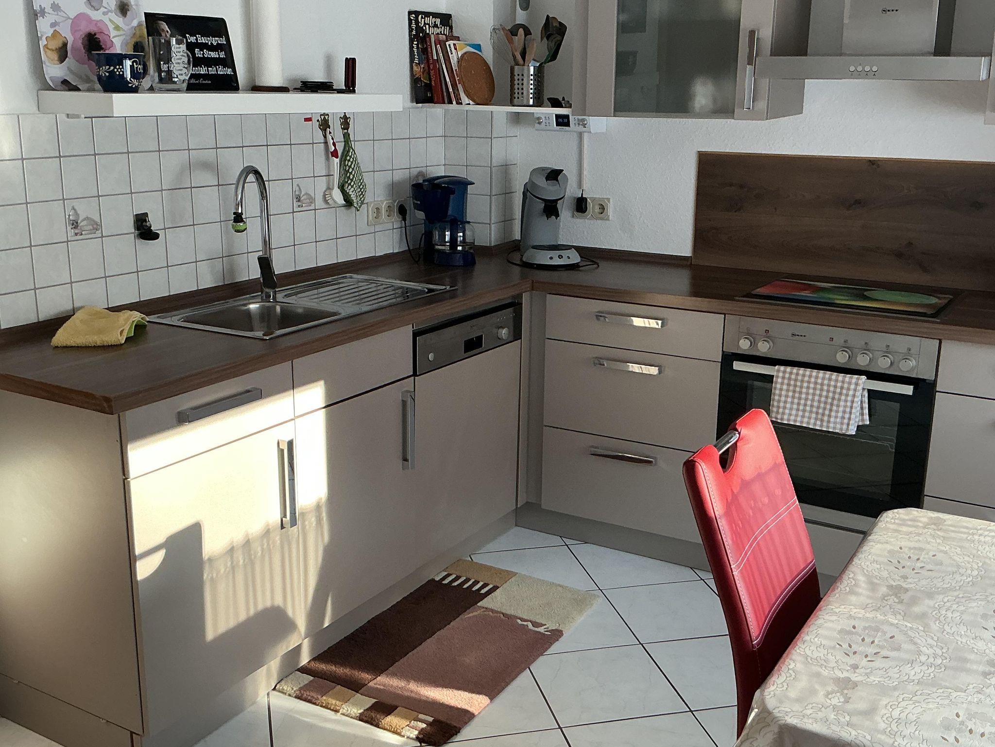Die Wohnküche ist mit Spülmaschine, Kühl- und Gefrierschrank, Wasserkocher, Kaffeemaschine, Toaster, Mikrowelle, Herd mit Cerankochfeld, Backofen, Bügeleisen und -brett ausgestattet.