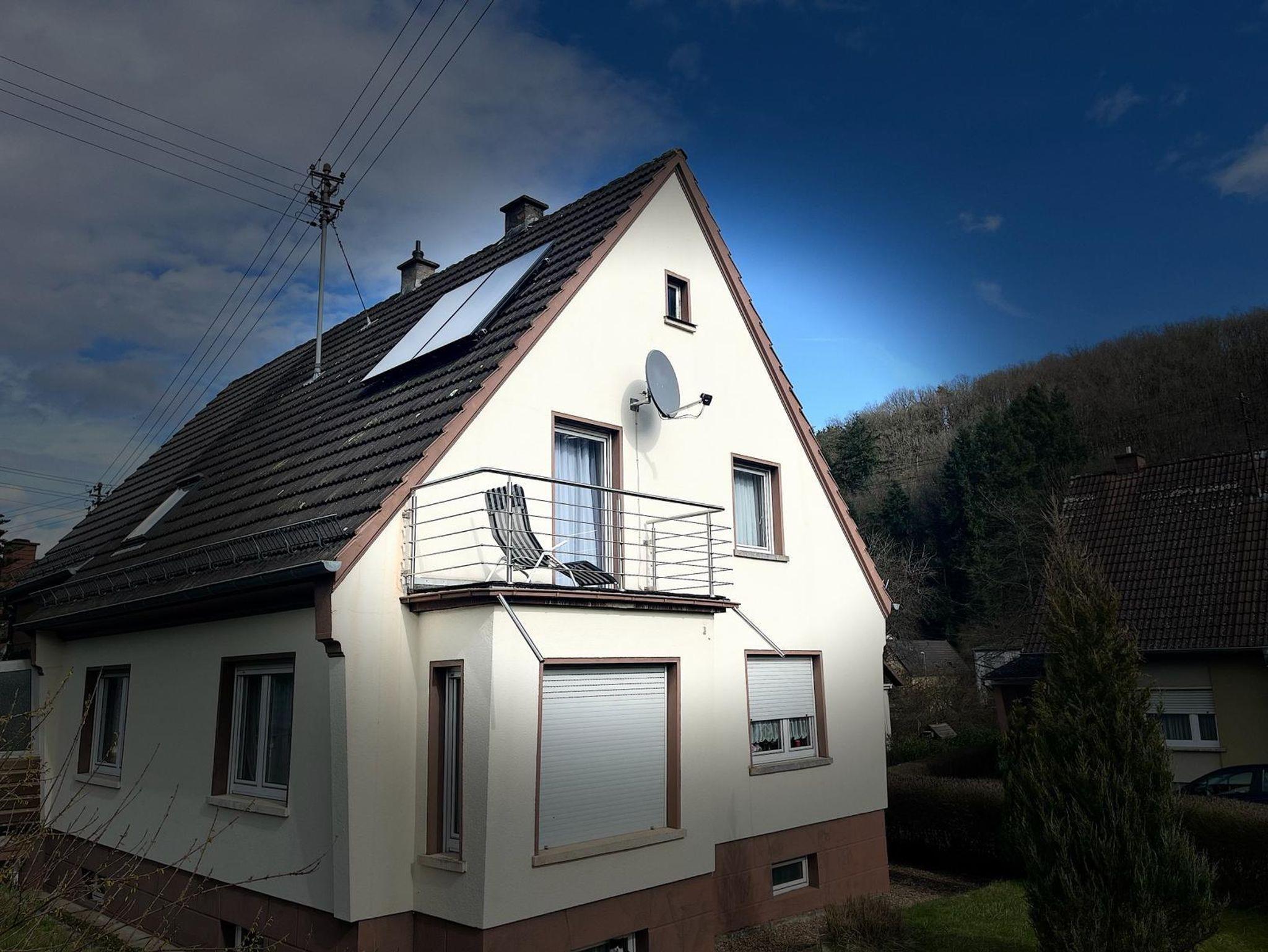 An der Frontseite sieht man den Eingang zum Haus, sowie den PKW-Stellplatz vor der Garage und den großen, überdachten Balkon. Dort lädt die Aussicht in die Natur zum Träumen ein. Es ist eine wahre Freude in der Morgensonne das Frühstück zu genießen. An warmen Sommerabenden kann man sogar das Rauschen des nahegelegenen Bachs hören und dabei relaxen.