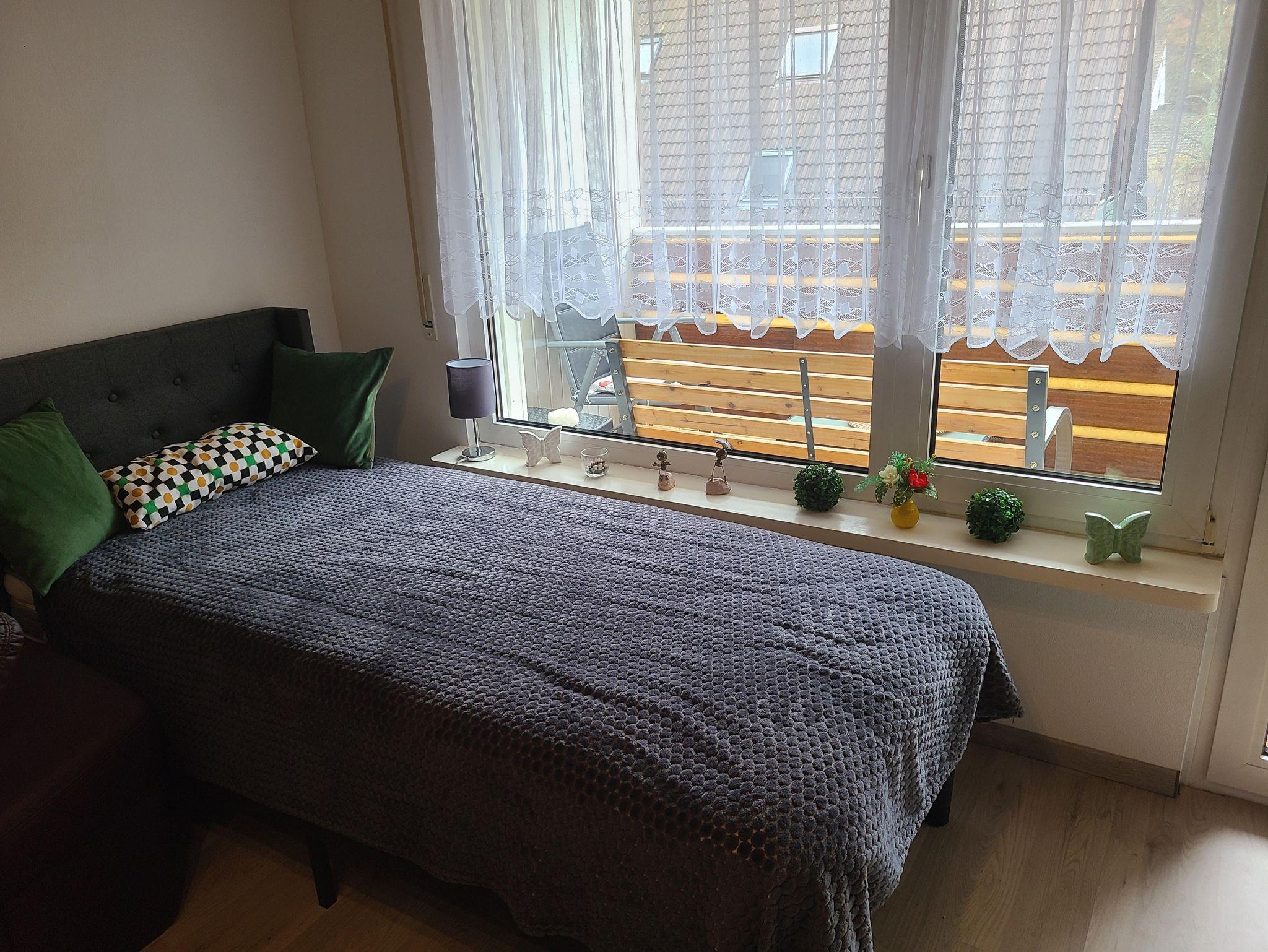 Im großen Schlafzimmer exestiert der Zugang zum kleinen Balkon. Auf dem komfotrtabelen Doppelbett beginnt