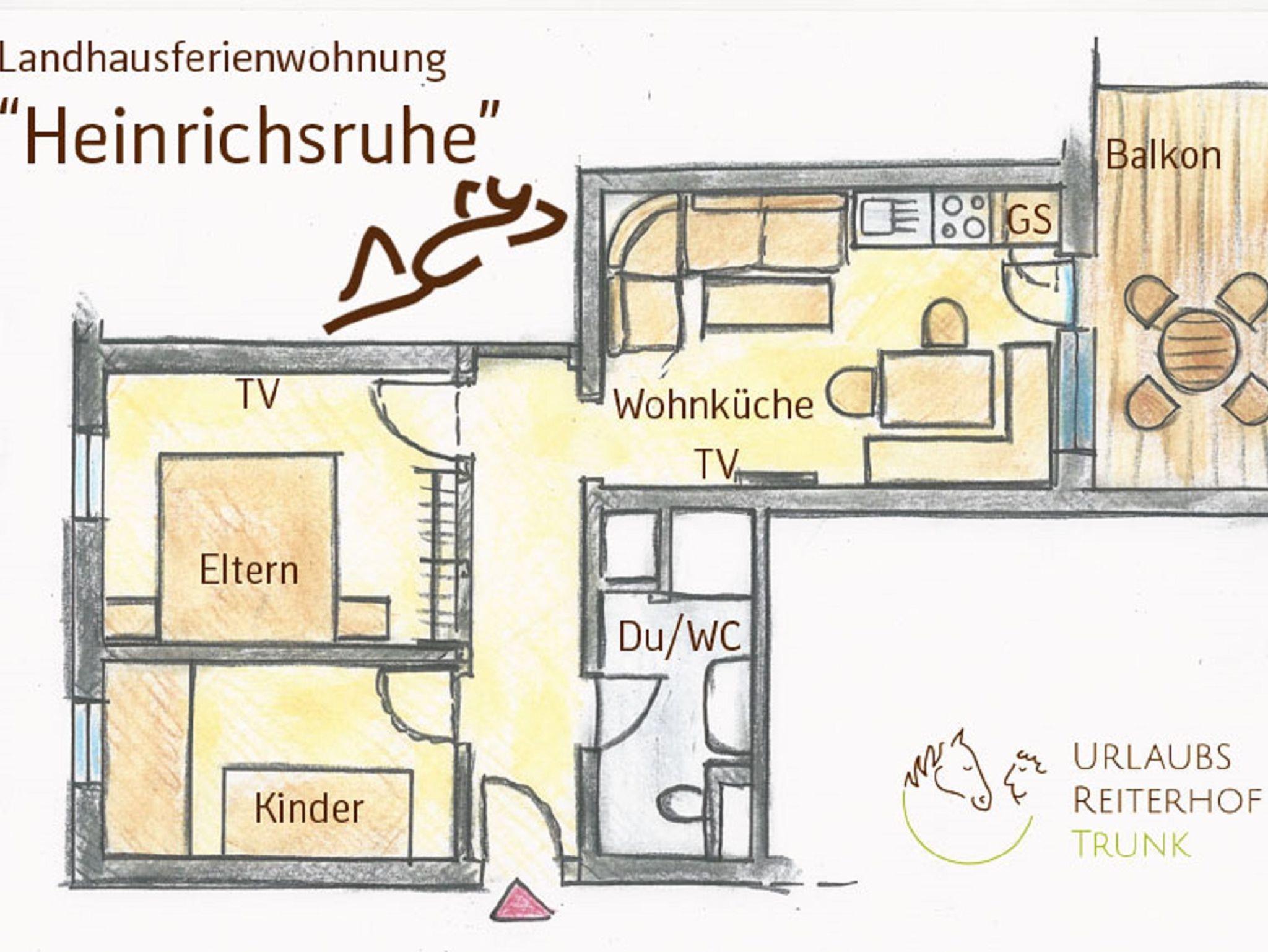 Urlaubsreiterhof Trunk, Ferienwohnung Heinrichsruhe mit zwei Schlafzimmern und Balkon