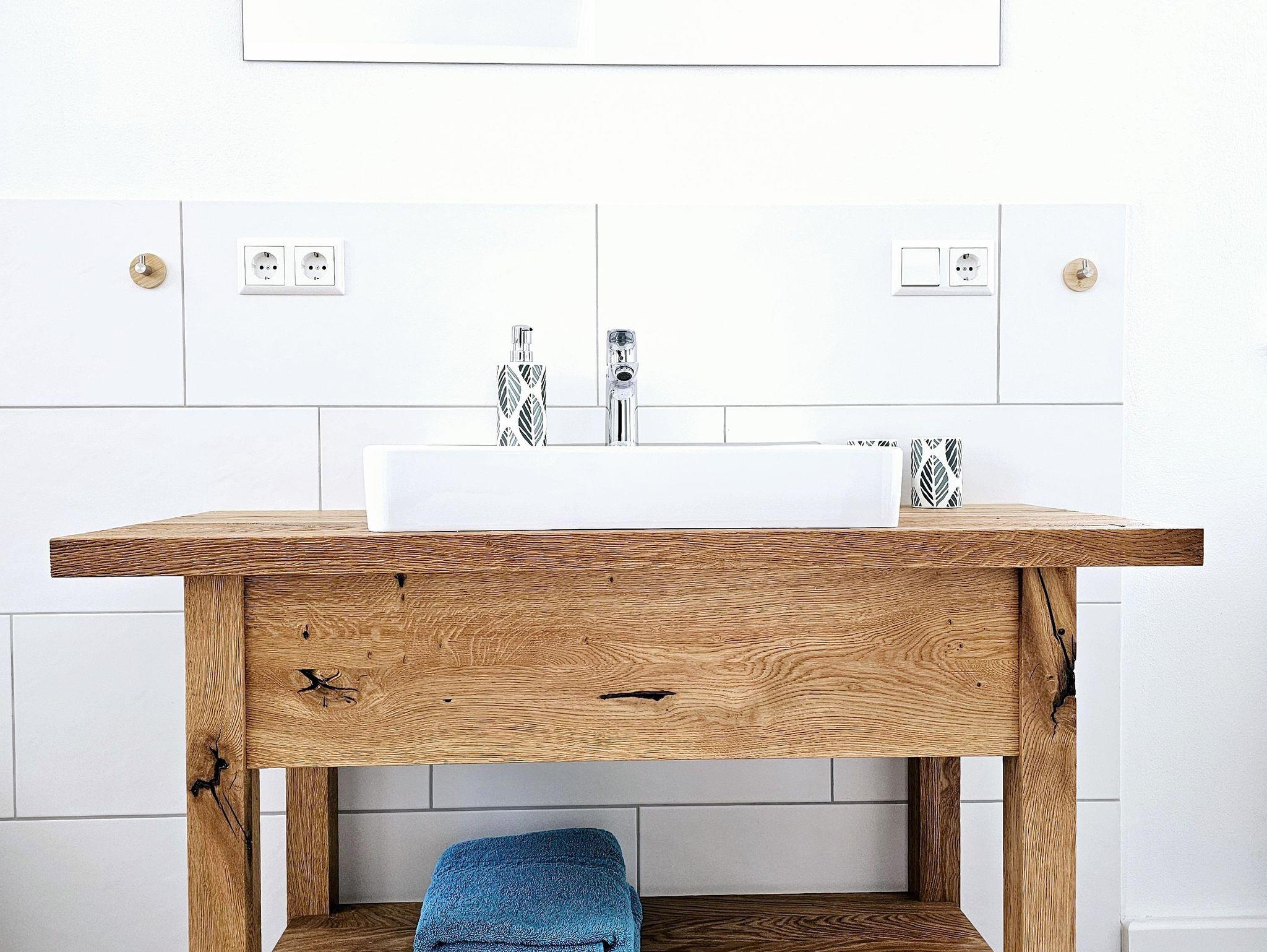 Im vorderen Bereich der Wohnung ist ein großzügiges Badezimmer mit ebenerdiger Dusche, Waschbecken und Toilette. Haarföhn und Handtücher liegen für unsere Gäste selbstverständlich bereit.