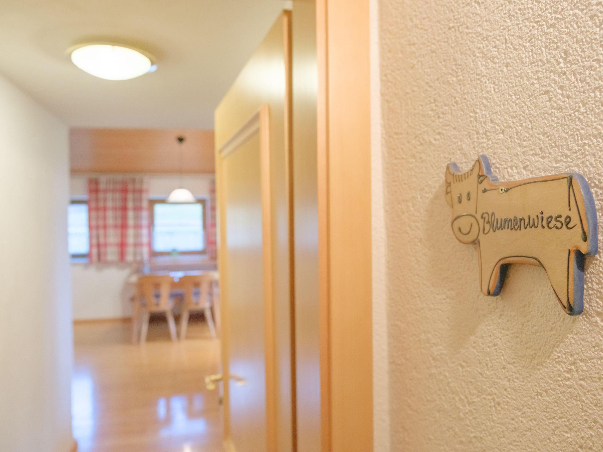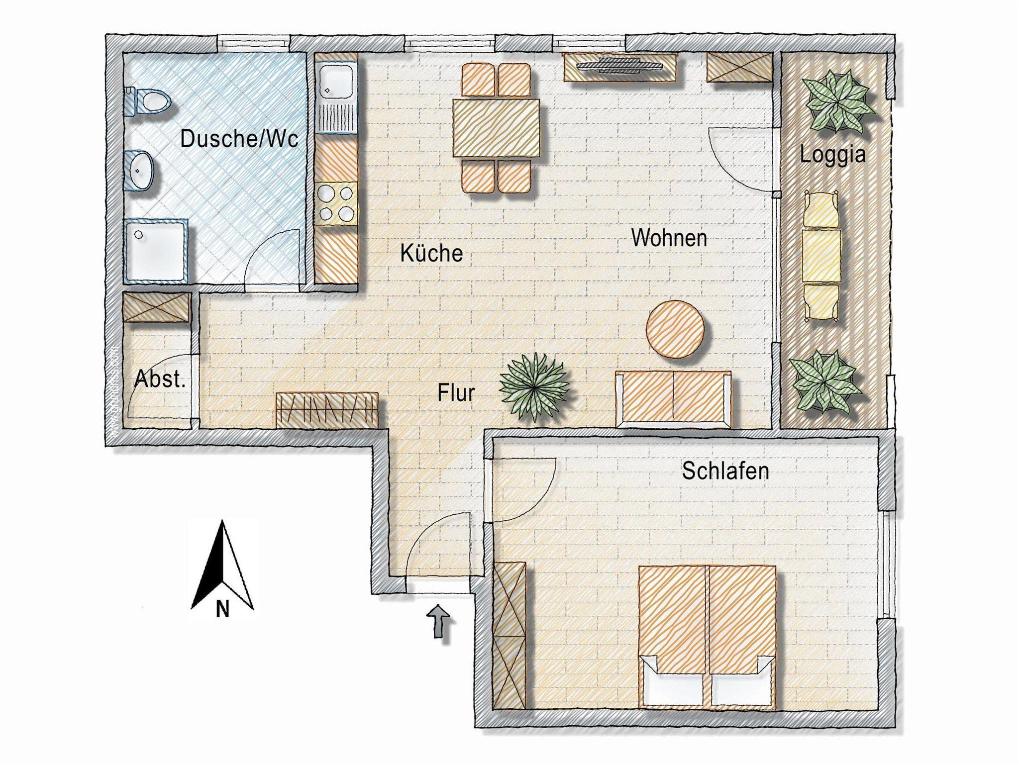 Diese Ferienwohnung Blumenwiese ist nach Osten und Norden ausgerichtet und verfügt über ein Schlafzimmer, eine Wohnküche mit Spülmaschine, TV, Du/Wc, Abstellraum und eine Loggia.