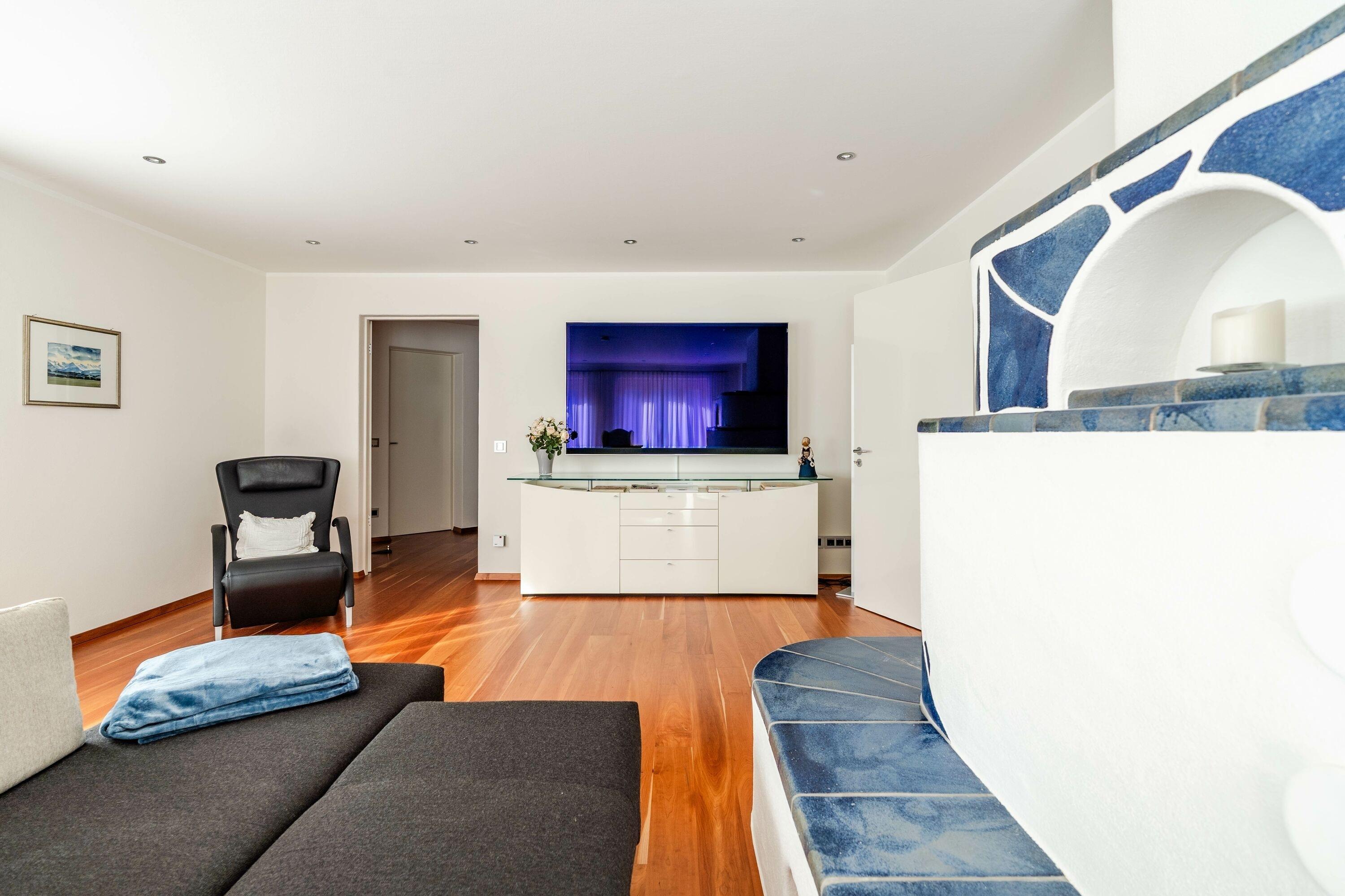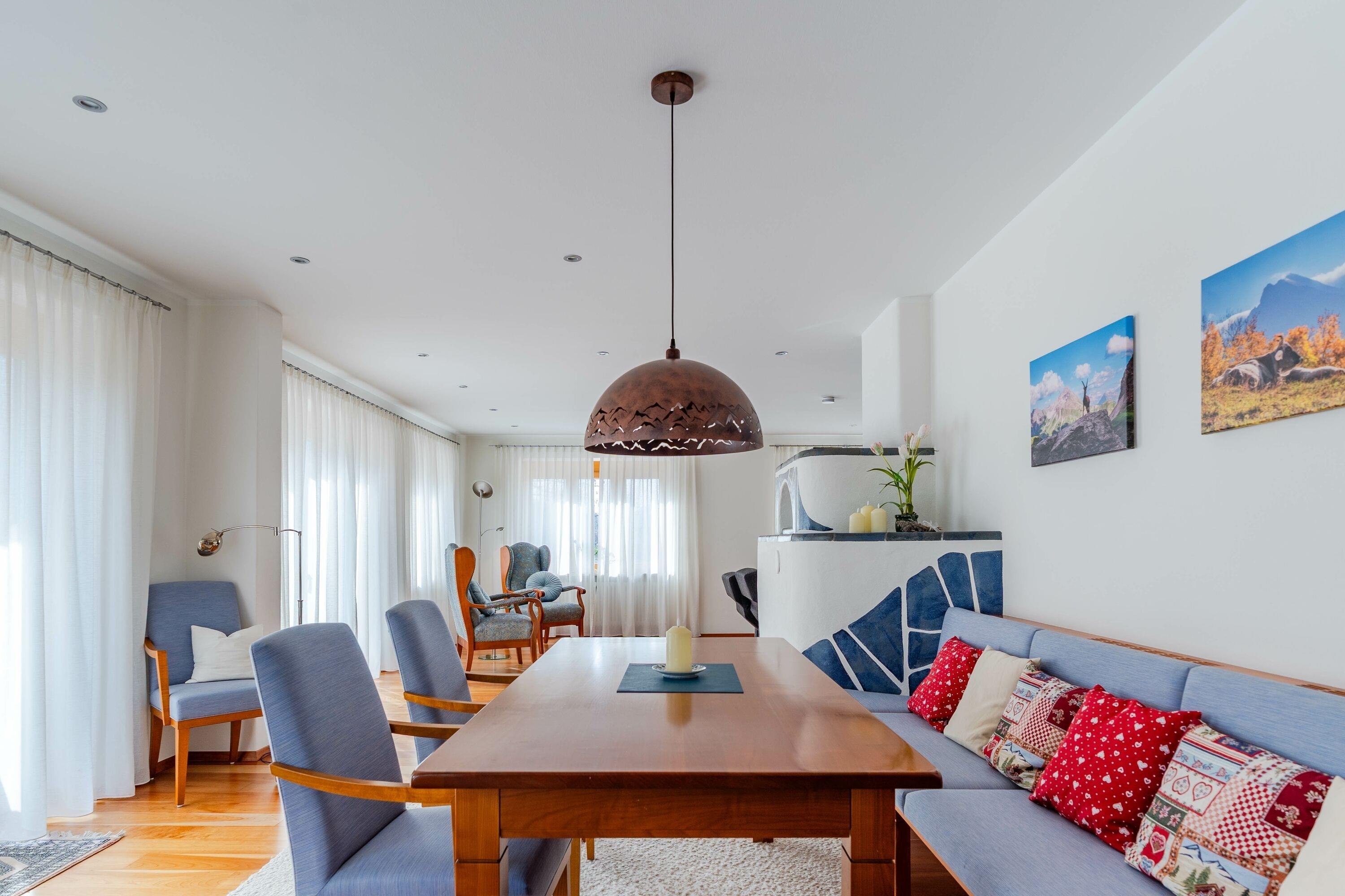 Der Wohnbereich ist hell und gemütlich gestaltet. Zwei klassische Ohrensessel, ein Relaxsessel, ein 2-Sitzer-Sofa und ein großer Fernseher sorgen für entspannte Abende. Der vorhandene Grundofen schafft eine schöne Atmosphäre, wird jedoch nicht genutzt. Vom Wohn- und Essbereich gelangen Sie direkt auf die Südterrasse, auf der Sie dank elektrischer Markisen auch an sonnigen Tagen angenehm sitzen können. Auch die Rollläden im Haus sind elektrisch bedienbar.