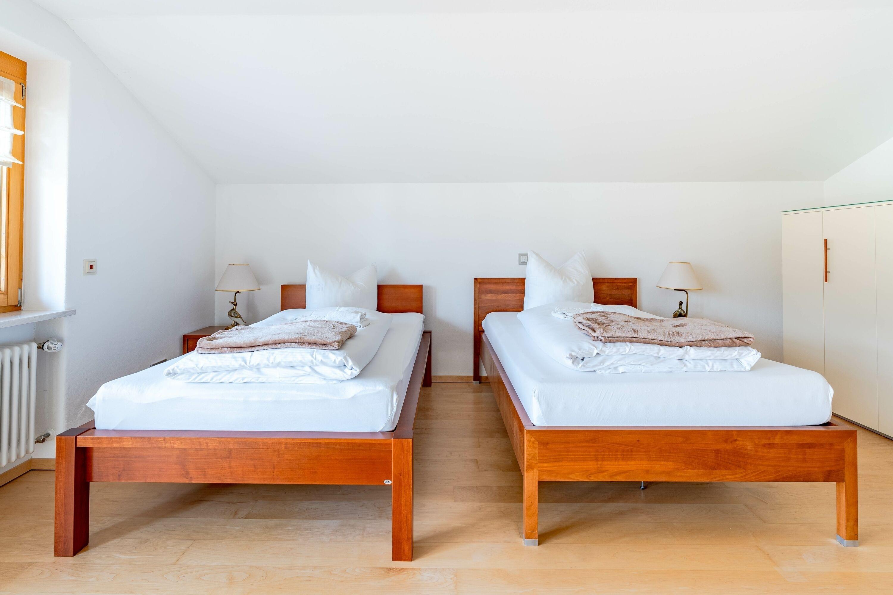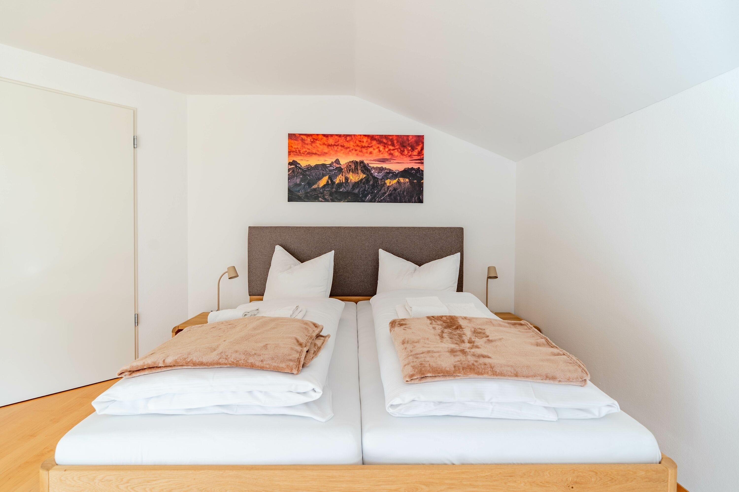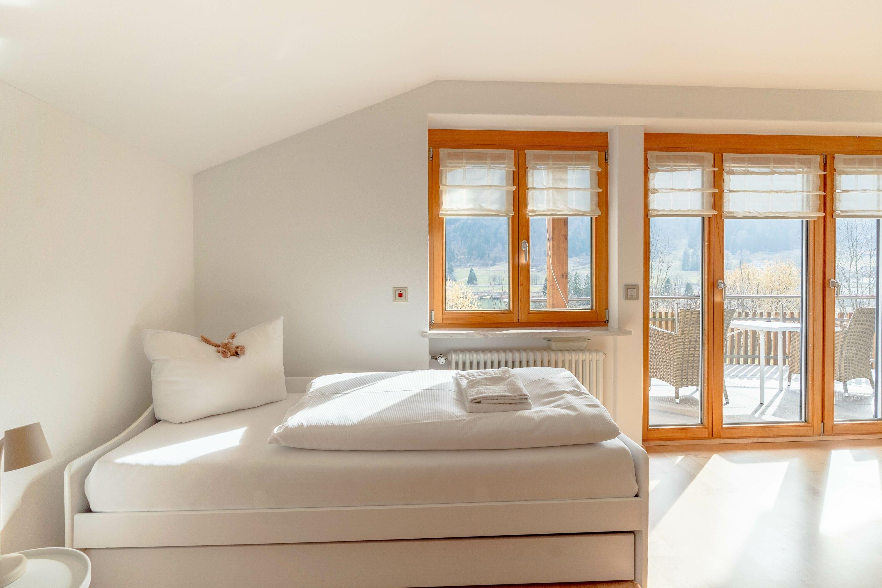 Die Schlafzimmer sind gemütlich und komfortabel im Obergeschoss eingerichtet. Das erste und zweite Schlafzimmer teilen sich einen Balkon, von dem man die Aussicht auf die wunderschönen Berge und den kleinen Alpsee genießen kann.