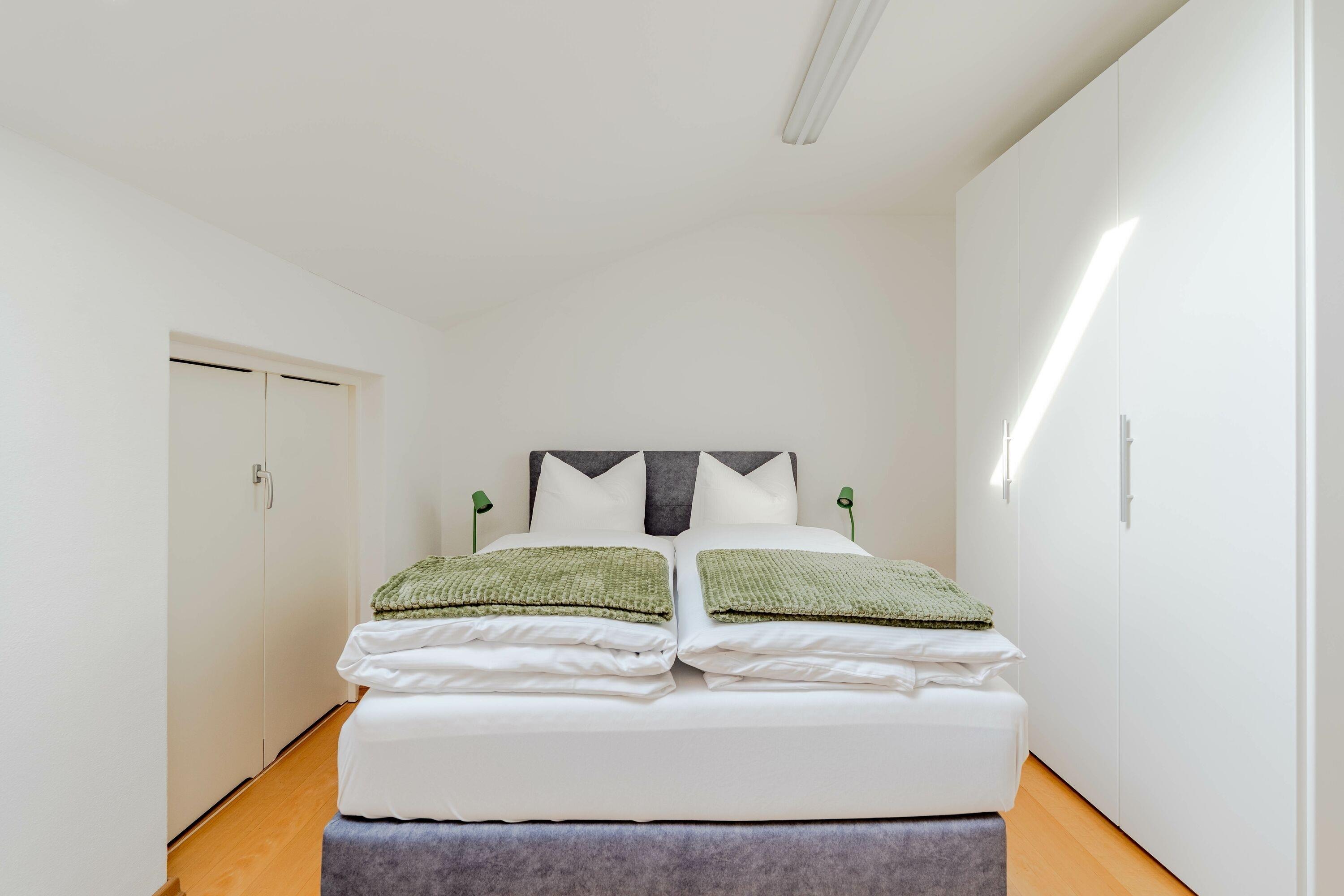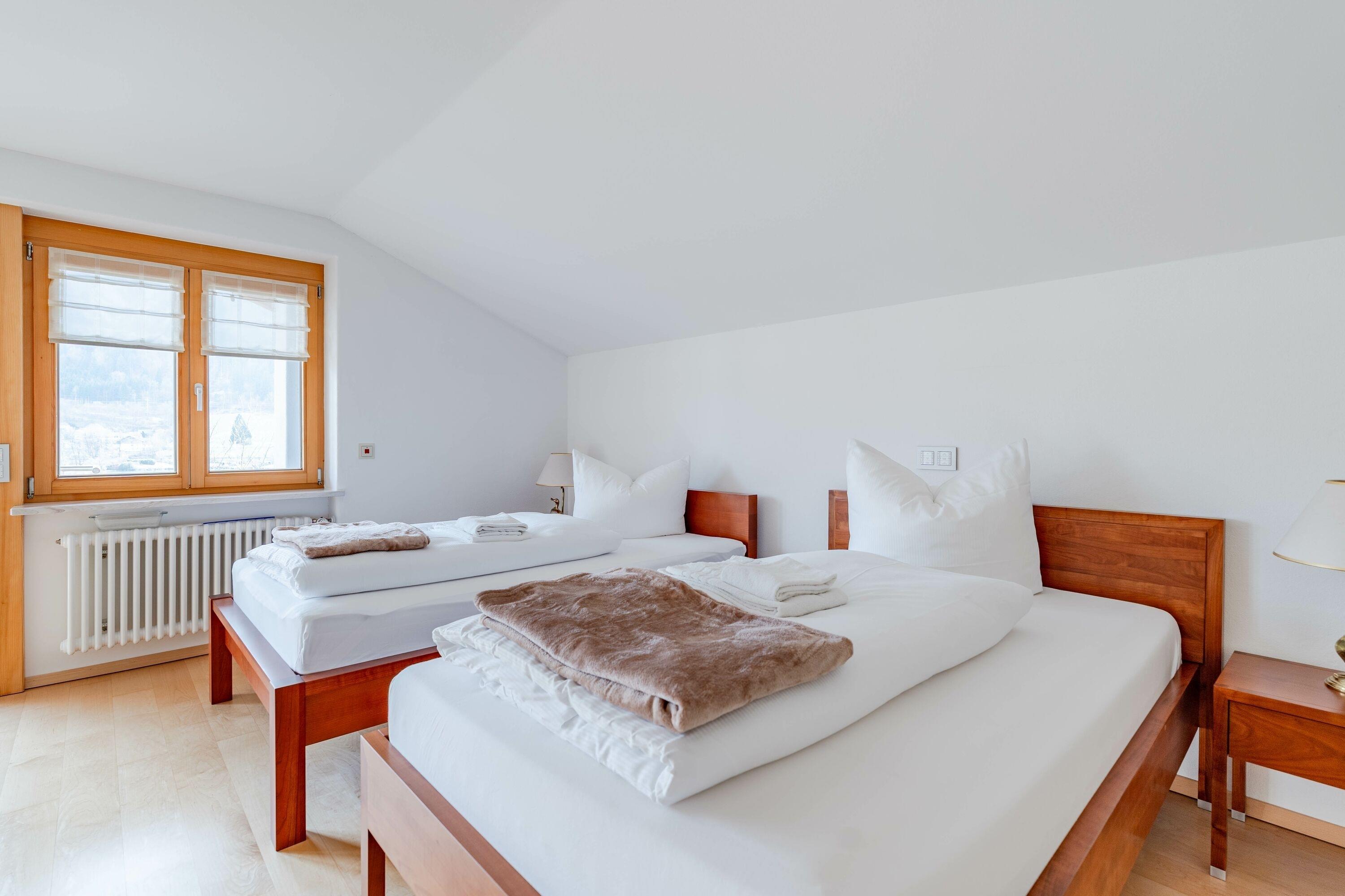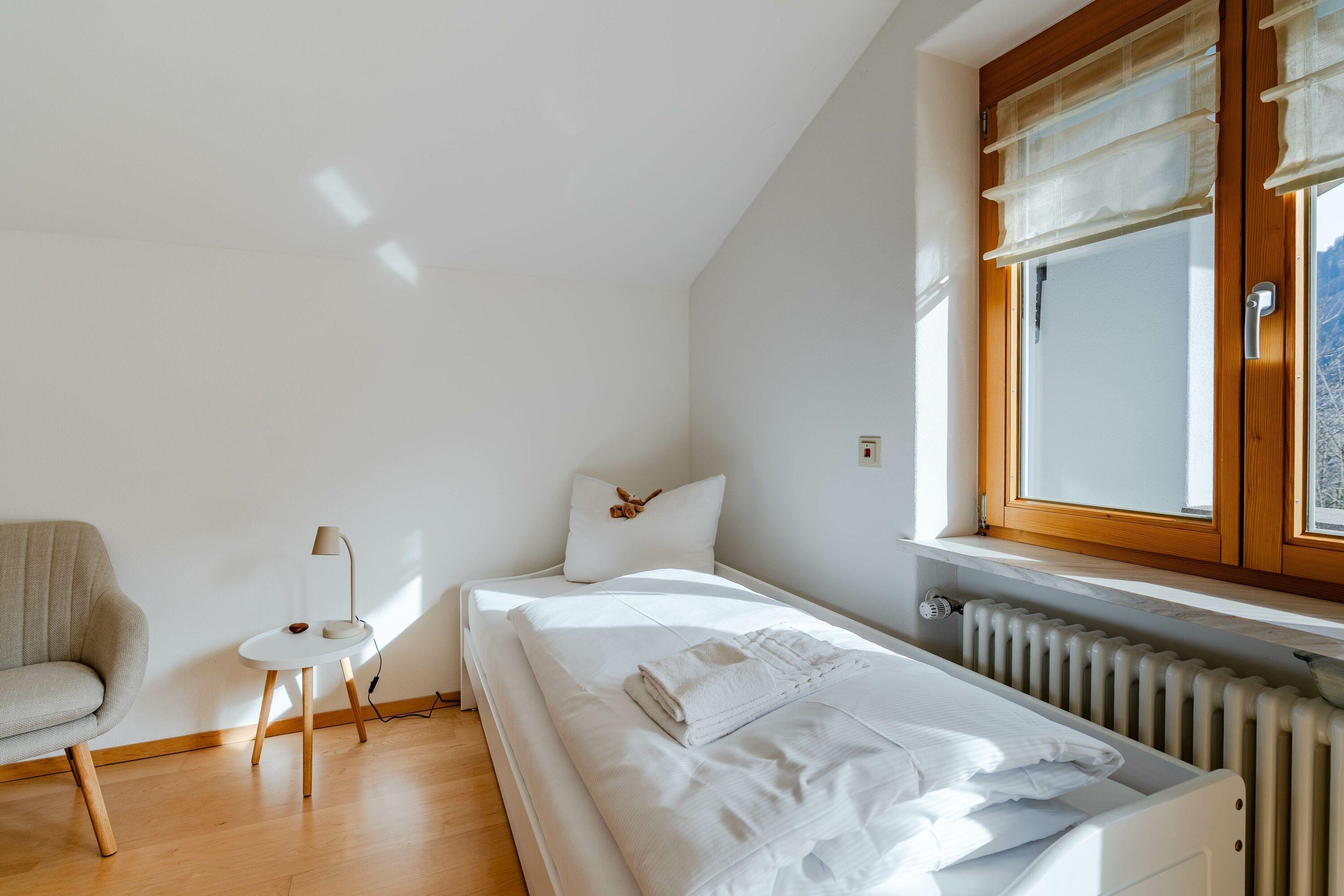 Die Schlafzimmer sind gemütlich und komfortabel im Obergeschoss eingerichtet. Das erste und zweite Schlafzimmer teilen sich einen Balkon, von dem man die Aussicht auf die wunderschönen Berge und den kleinen Alpsee genießen kann.