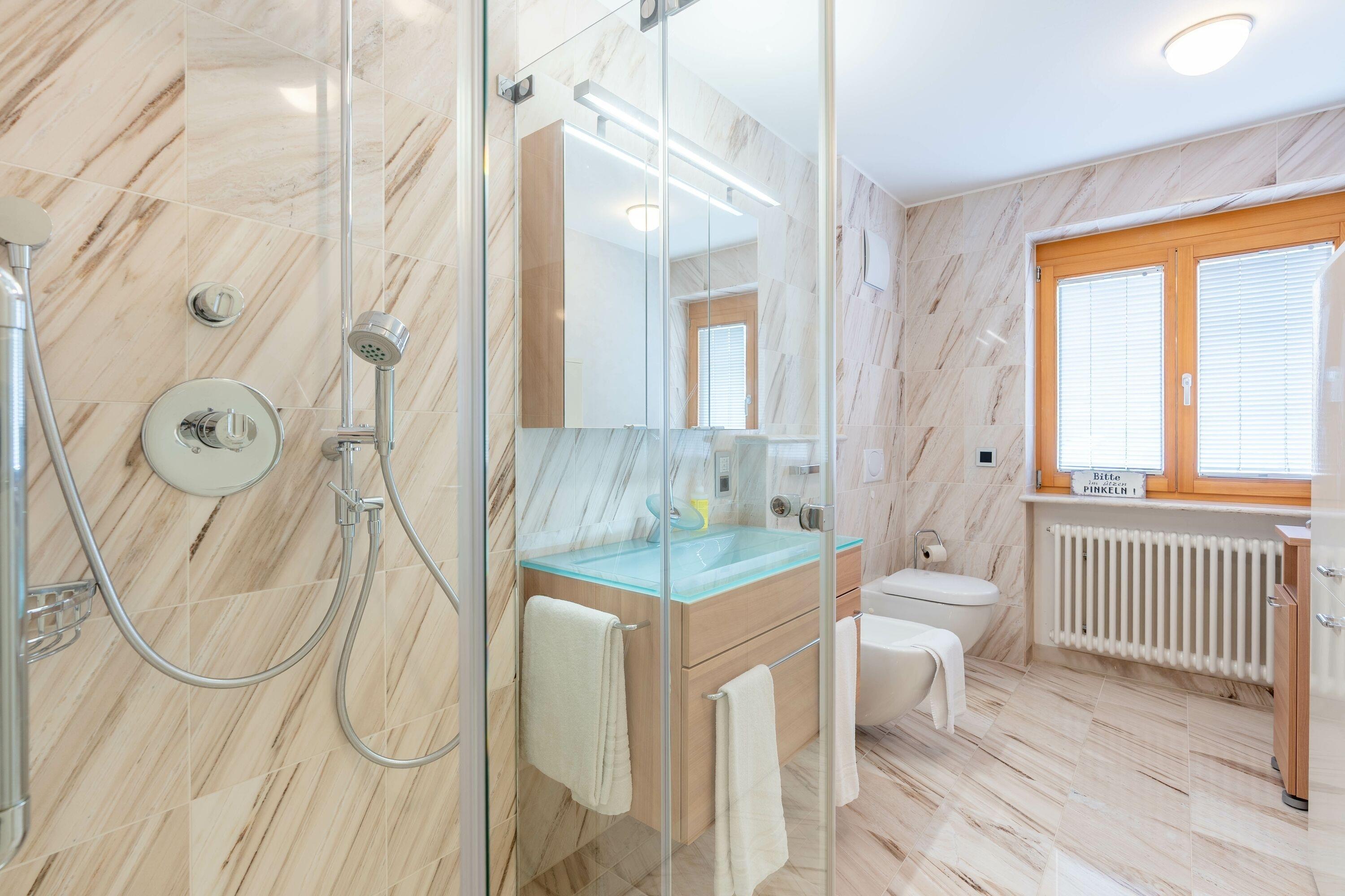 Im Erdgeschoss befindet sich ein Badezimmer mit Dusche, Waschbecken, WC und Bidet.
