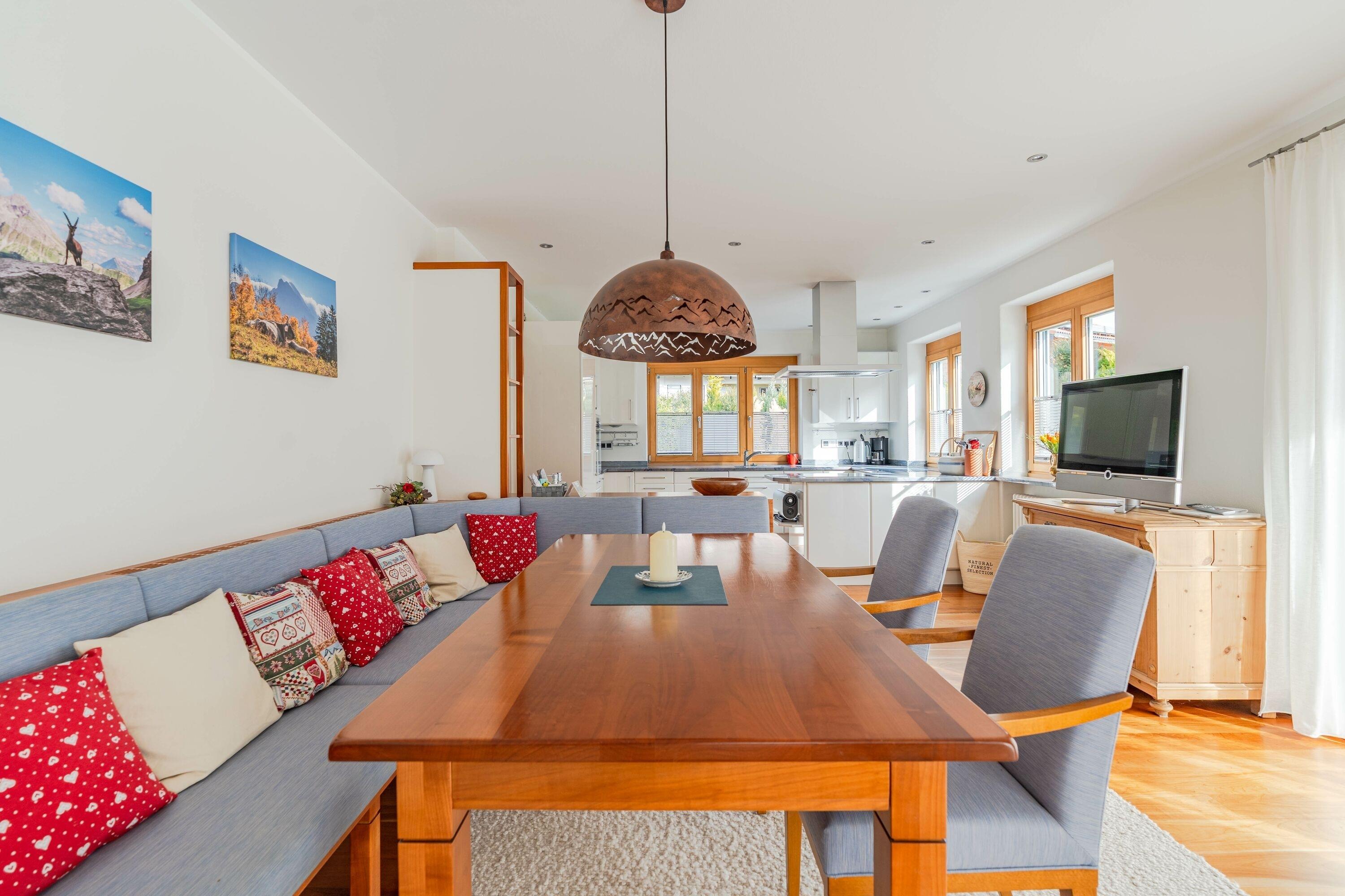 Besonders hervorzuheben ist der große Garten und die sehr ruhige Lage des Hauses. Der Alpsee ist in wenigen Minuten zu Fuß erreichbar, wodurch das Ferienhaus der ideale Ausgangspunkt für einen entspannten Familienurlaub – besonders auch mit Kindern – ist. Die Terrasse und der Garten laden dazu ein, die frische Bergluft zu genießen und gemeinsame Stunden im Freien zu verbringen. Ein Aufzug im Haus ermöglicht außerdem einen komfortablen Zugang ins Obergeschoss ohne Treppensteigen.