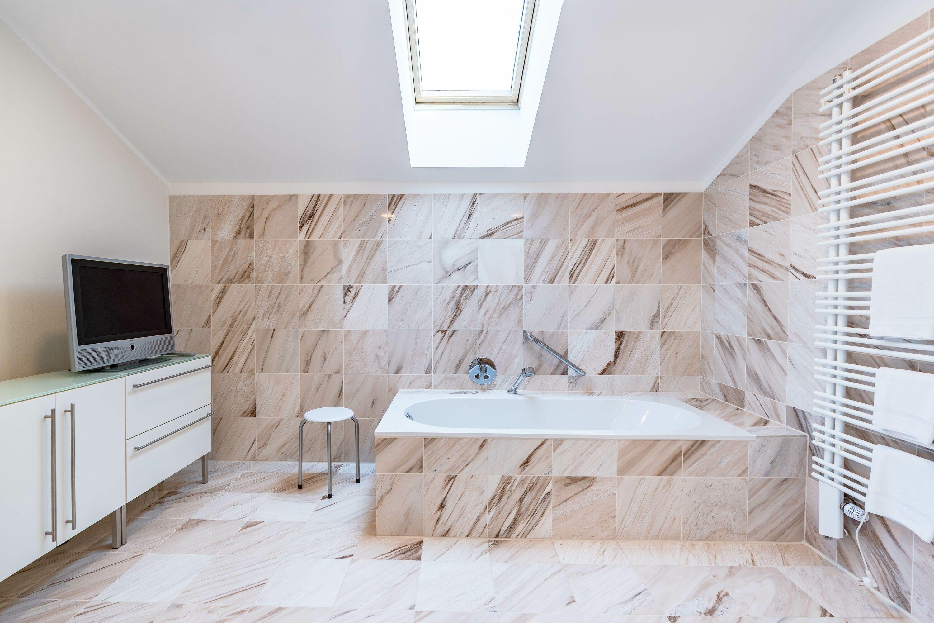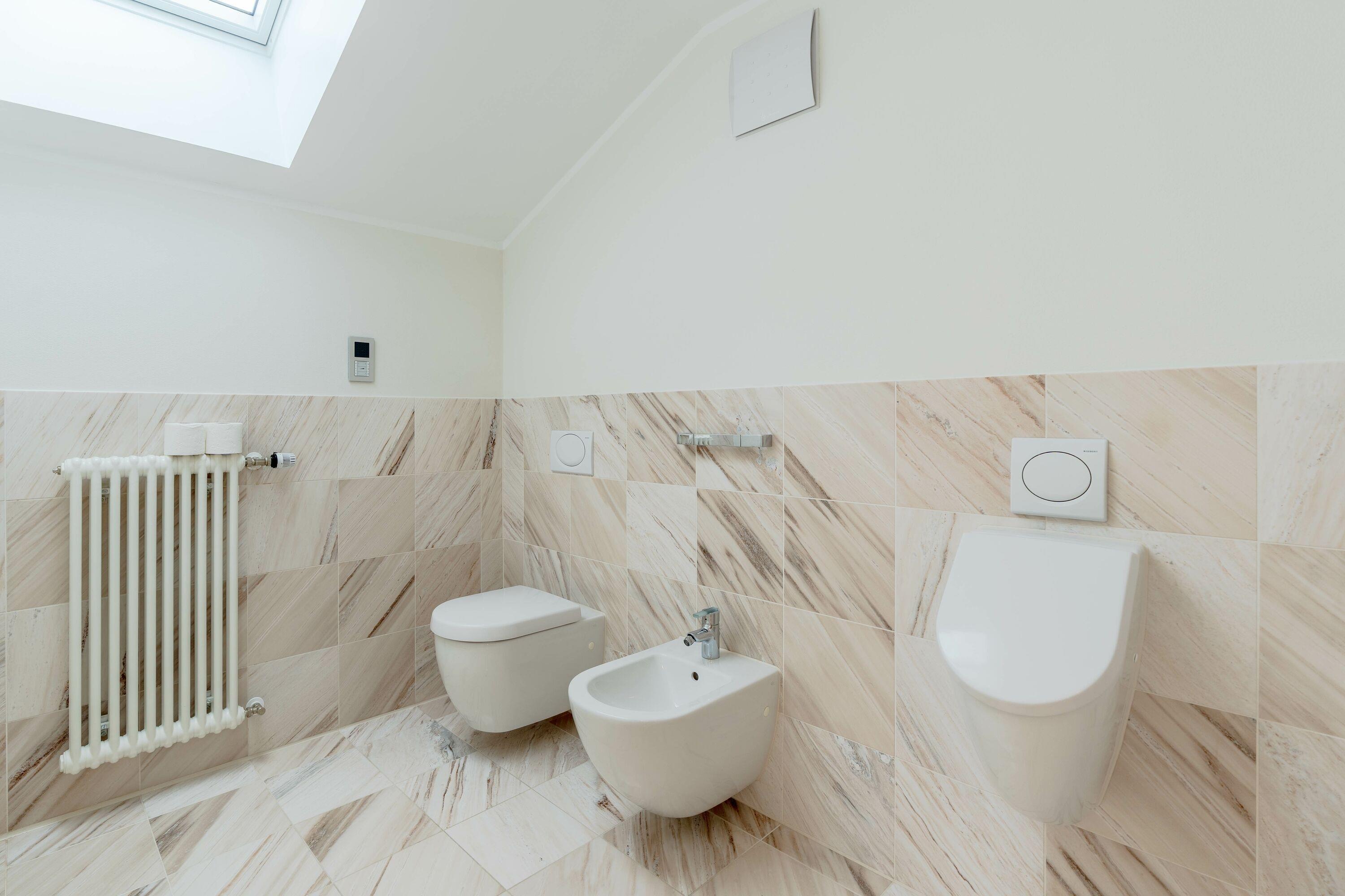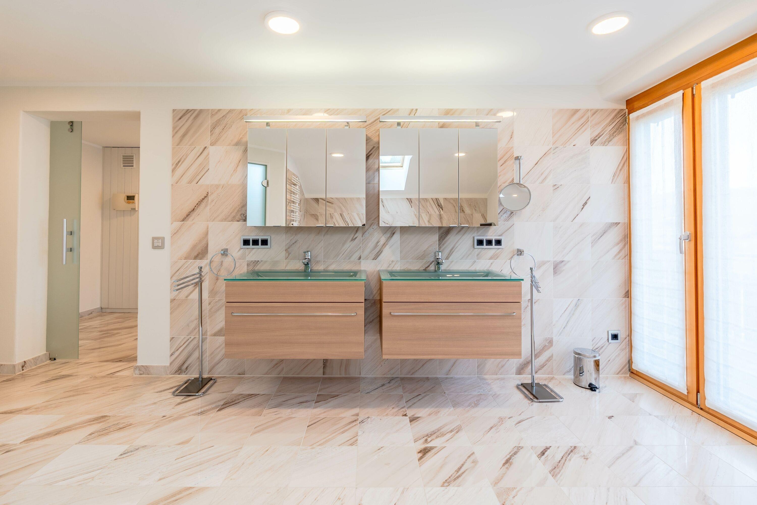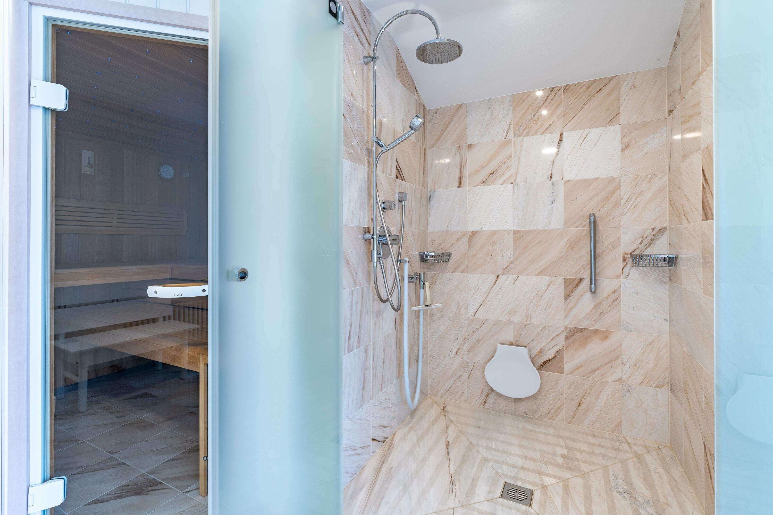 Das zweite Badezimmer im Obergeschoss ist großzügig gestaltet und verfügt über eine Sauna mit angrenzender großer Dusche, eine Badewanne mit Fernseher, zwei Waschbecken sowie Fußbodenheizung. Von hier aus gelangen Sie außerdem auf einen eigenen Balkon mit schöner Aussicht. Ein separater Bereich beinhaltet zusätzlich WC und Bidet.