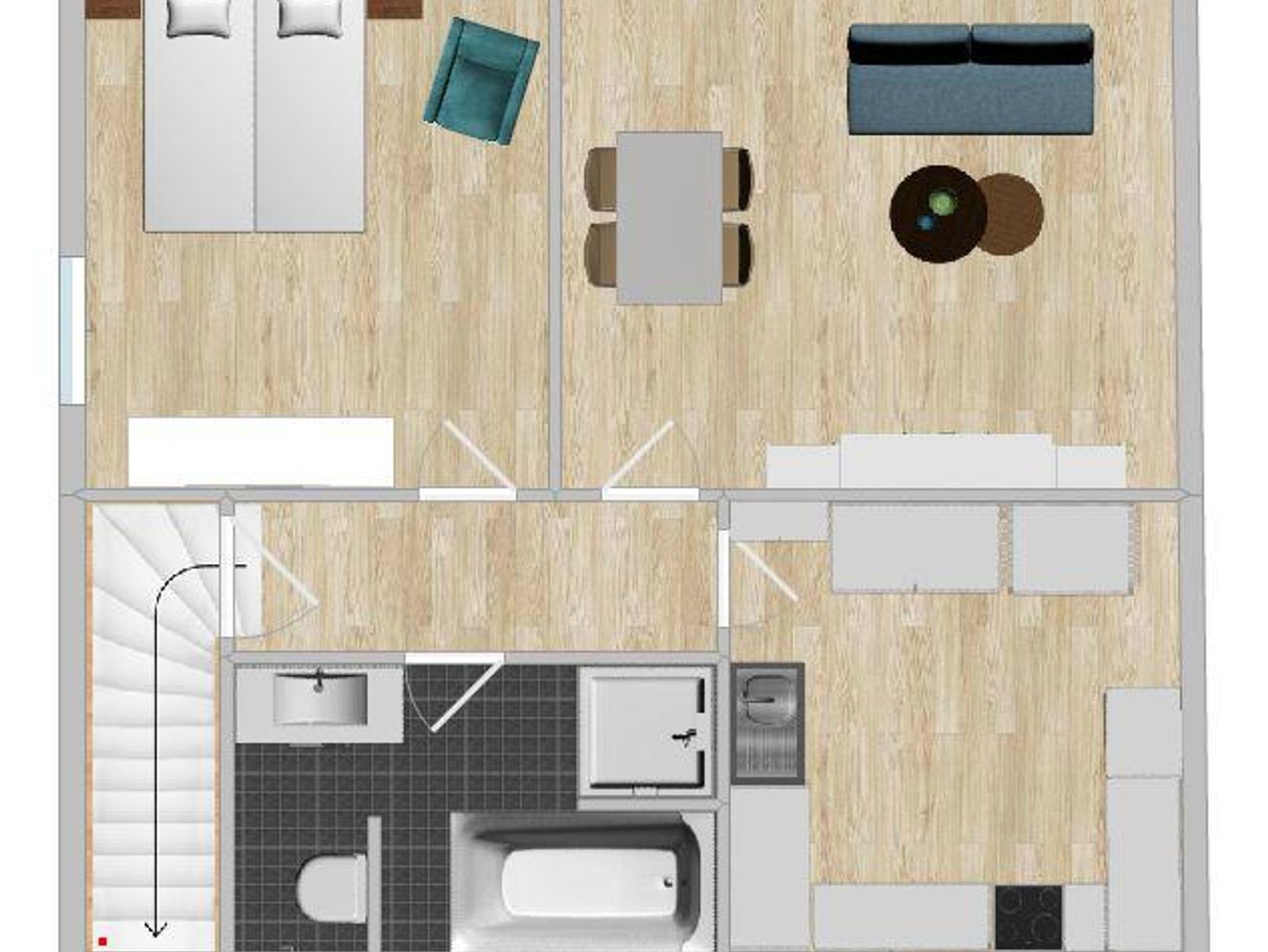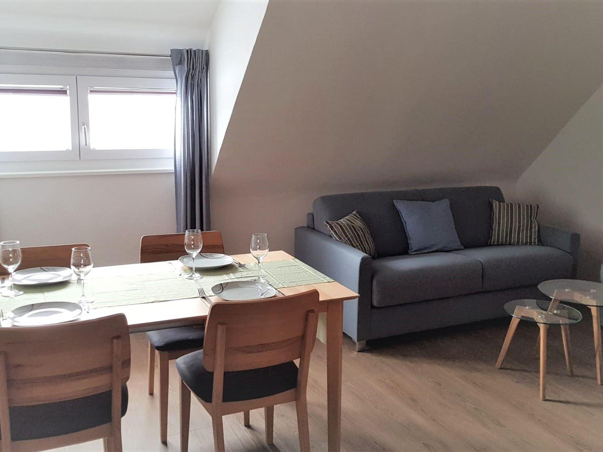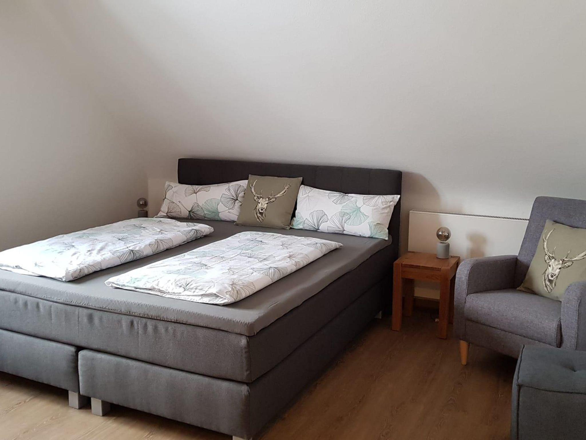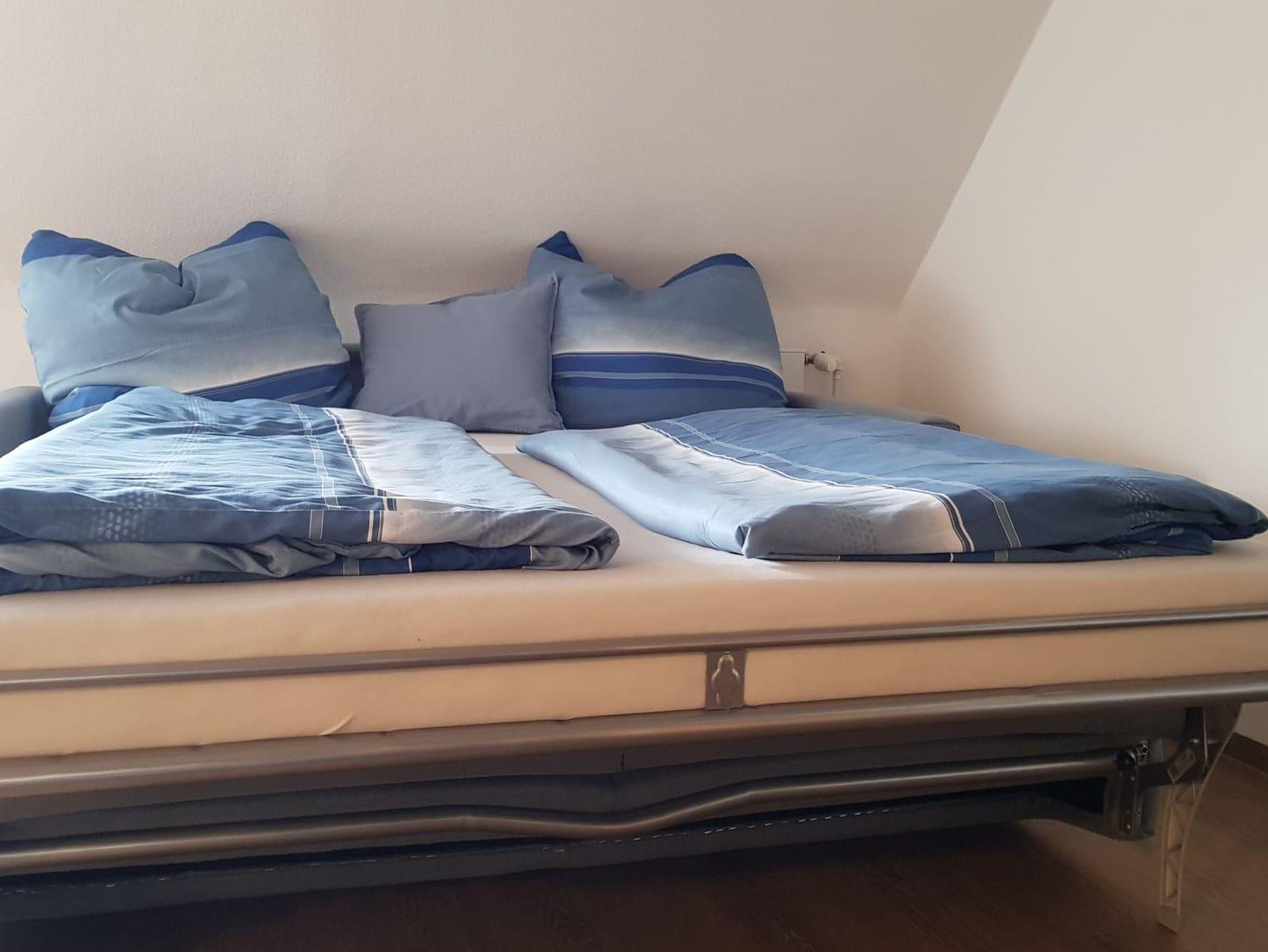Die Ferienwohnung im Obergeschoss bietet Platz für 4 Personen und besteht aus einem separaten Schlafzimmer und Ess- Wohnzimmer mit Sofabett. Die Küche ist mit Spülmaschine, Mikrowelle, Kühlschrank mit Gefrierfach und Kaffee-Pad-Maschine ausgestattet. Im Badezimmer steht Dusche, Badewanne und Föhn zur Verfügung.
