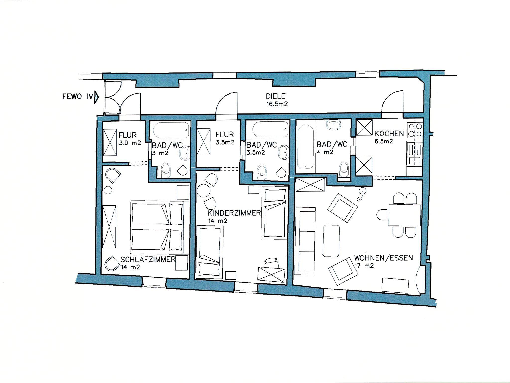 Großzügige Ferienwohnung, 85 m² im 1. Obergeschoss des Mittelbaus der Schlossanlage. Ausgestattet mit Wohnzimmer und Essecke, Doppelbettschlafzimmer, Zweibettschlafzimmer, komplett eingerichteter Küche, drei Bädern/WC und Flur.